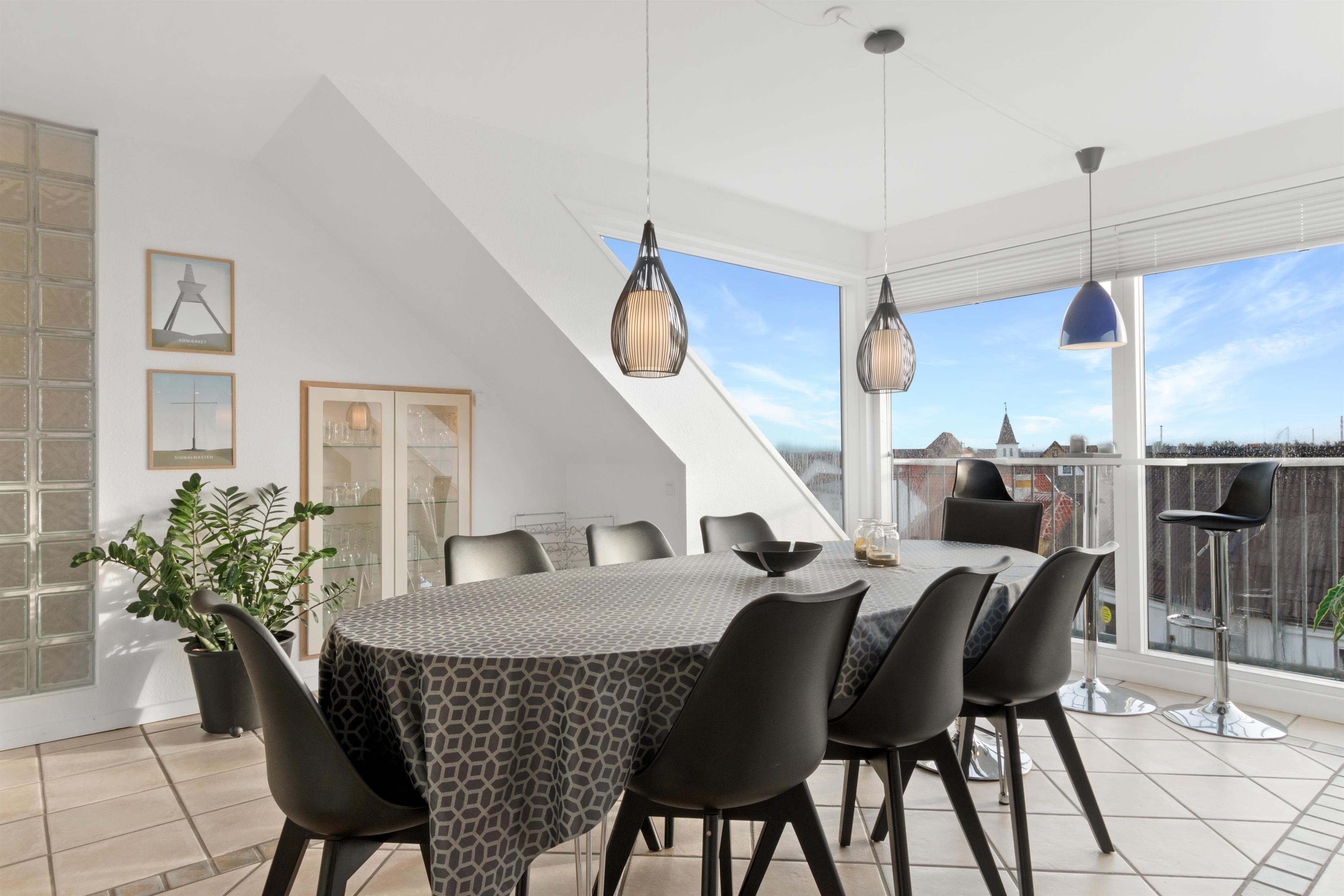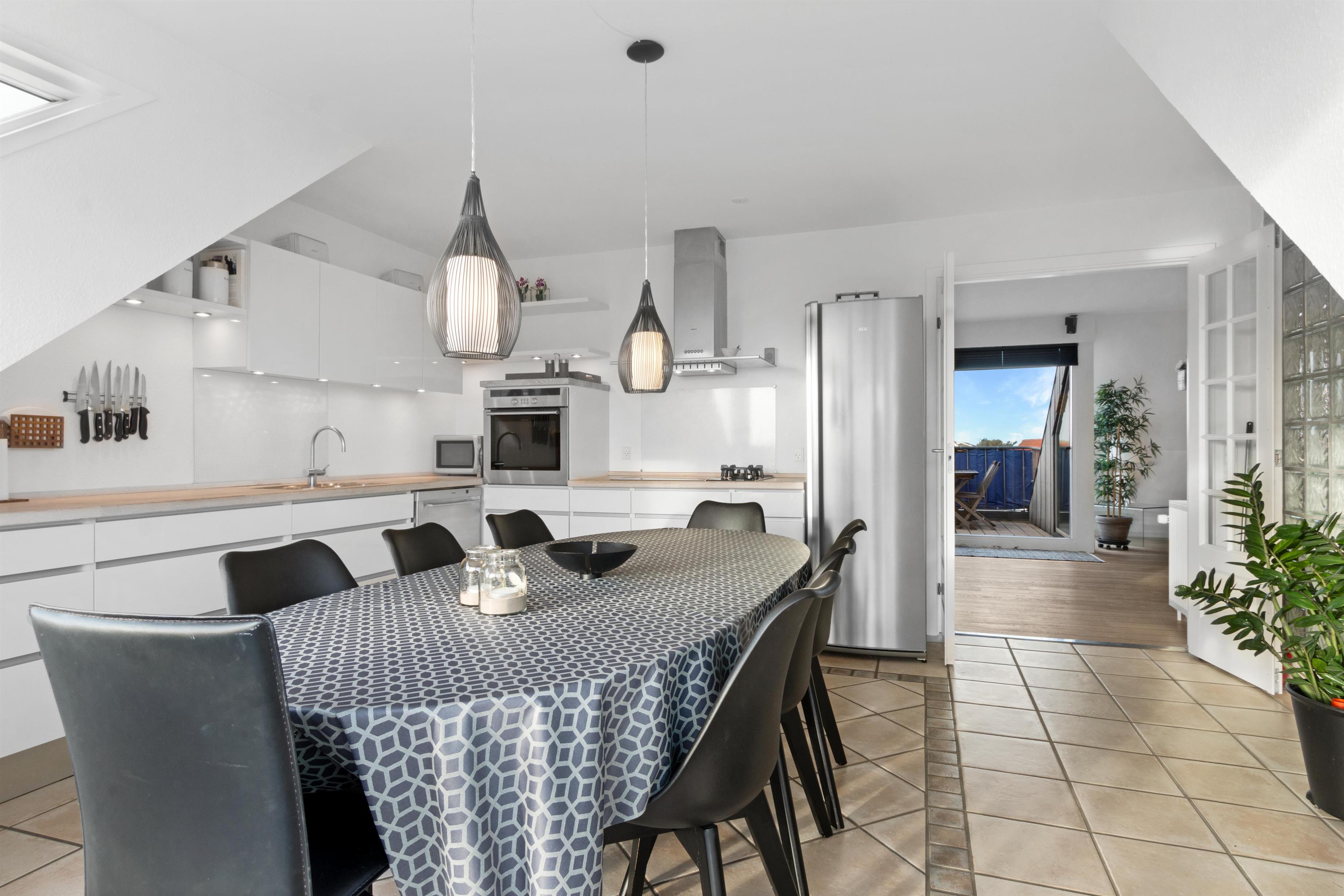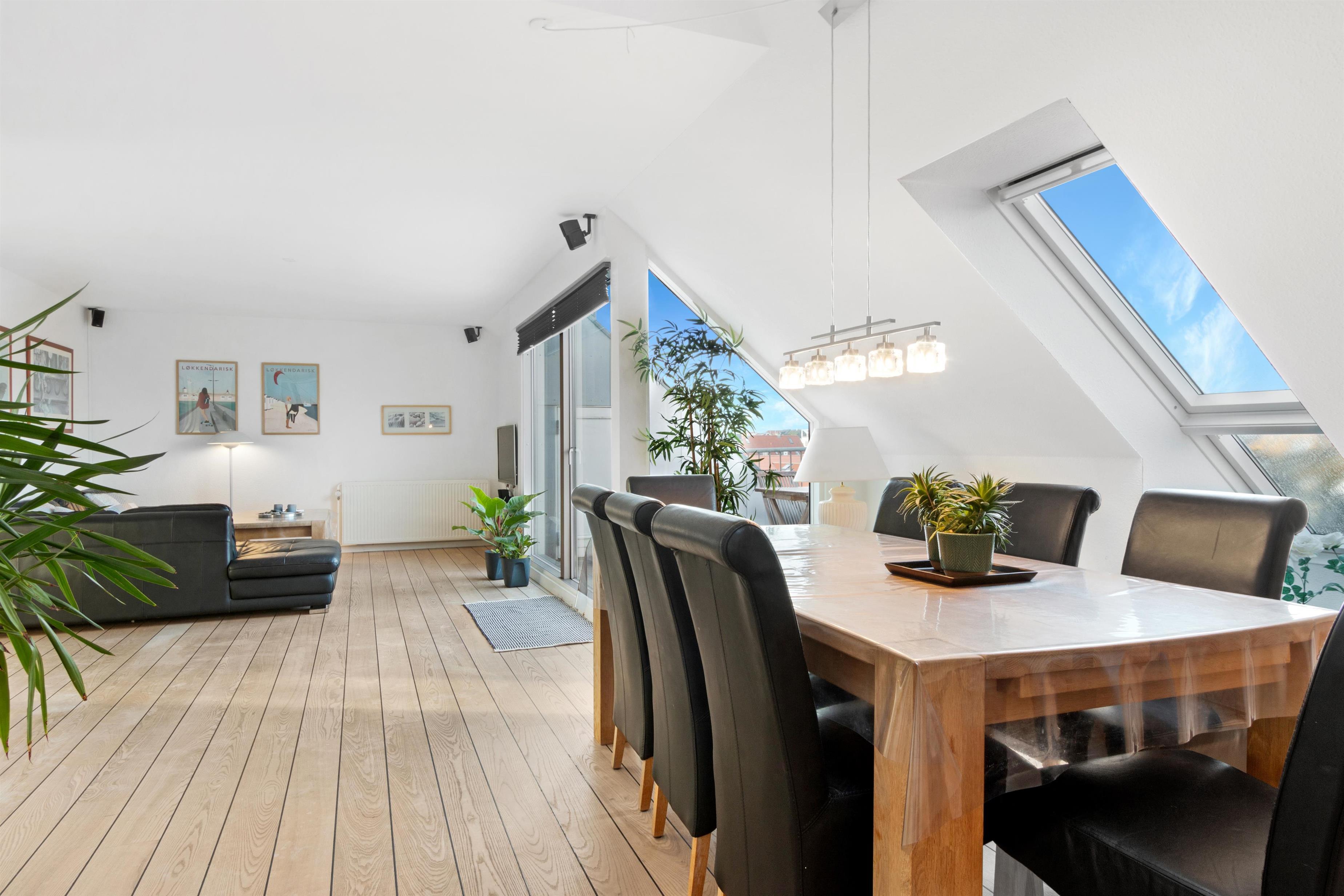 Denne ferielejlighed, der ligger i Løkkens absolutte centrum, er virkelig en perle af en feriebolig til udlejning. Lejligheden er i to etager + hems med aflukket soveværelse, og udsigten over både Løkken by og vesterhavet er bestemt et besøg værd! Der er plads til 10 personer og et barn op til 3 år. Der er 5 soveværelser og to badeværelser fordelt på de skønne 172 m² - 8 sovepladser i dobbeltsenge og 2 i enkeltsenge. Derudover er der 1 stk. barneseng, og det er tilladt at medbringe sit kæledyr. Der er gulvvarme i køkkenet og på badeværelserne. Herudover er der flere super karakteristika ved lejligheden.