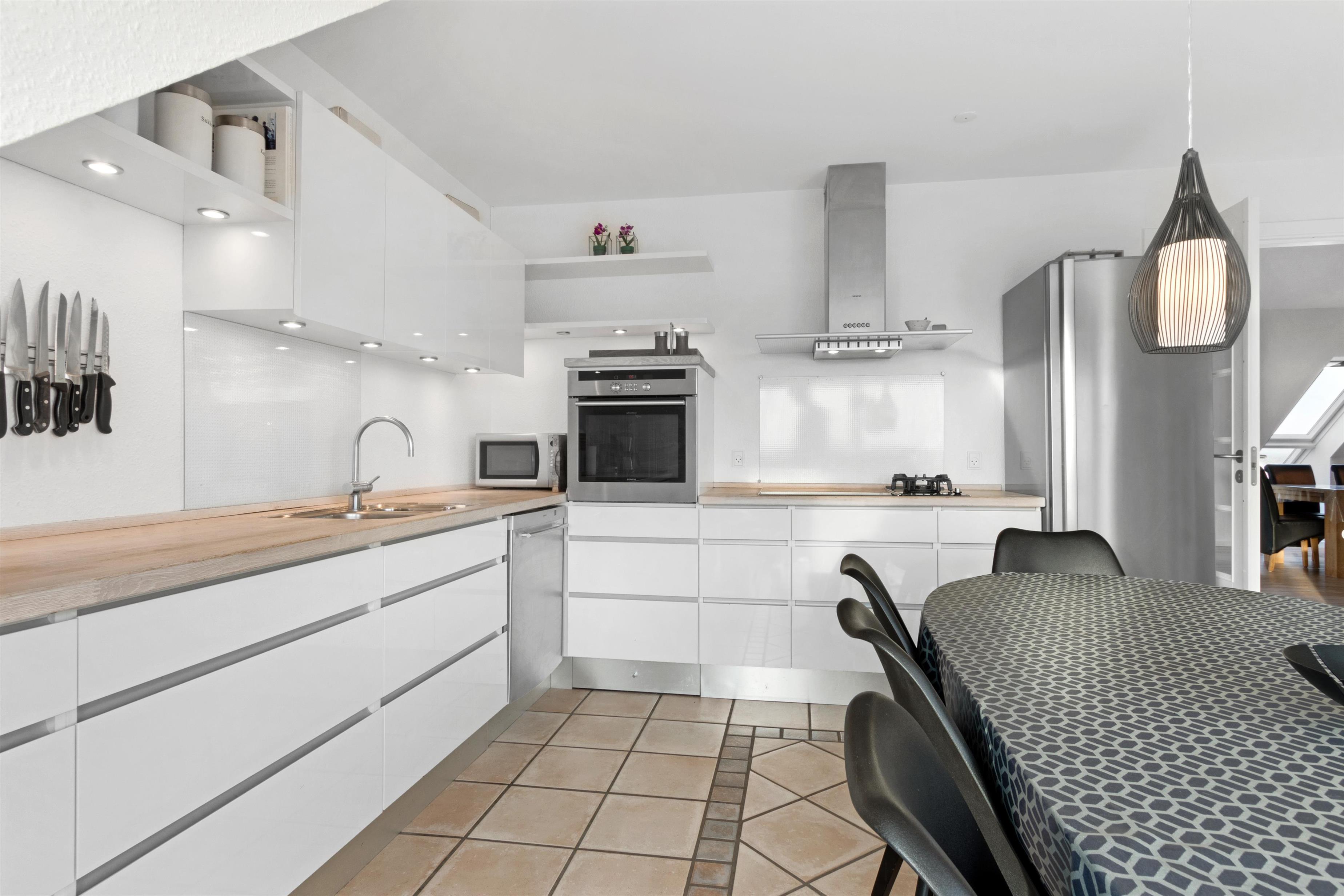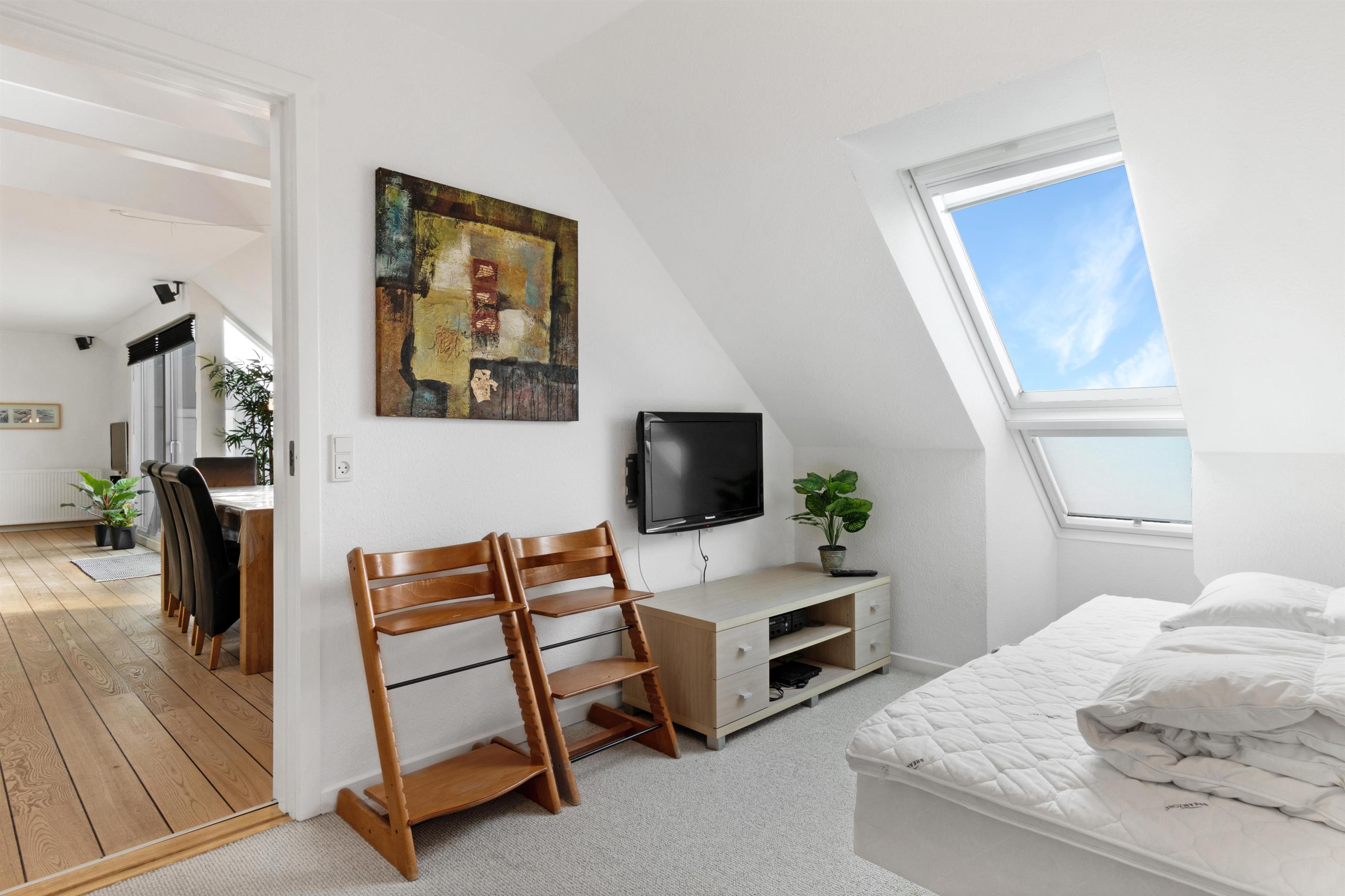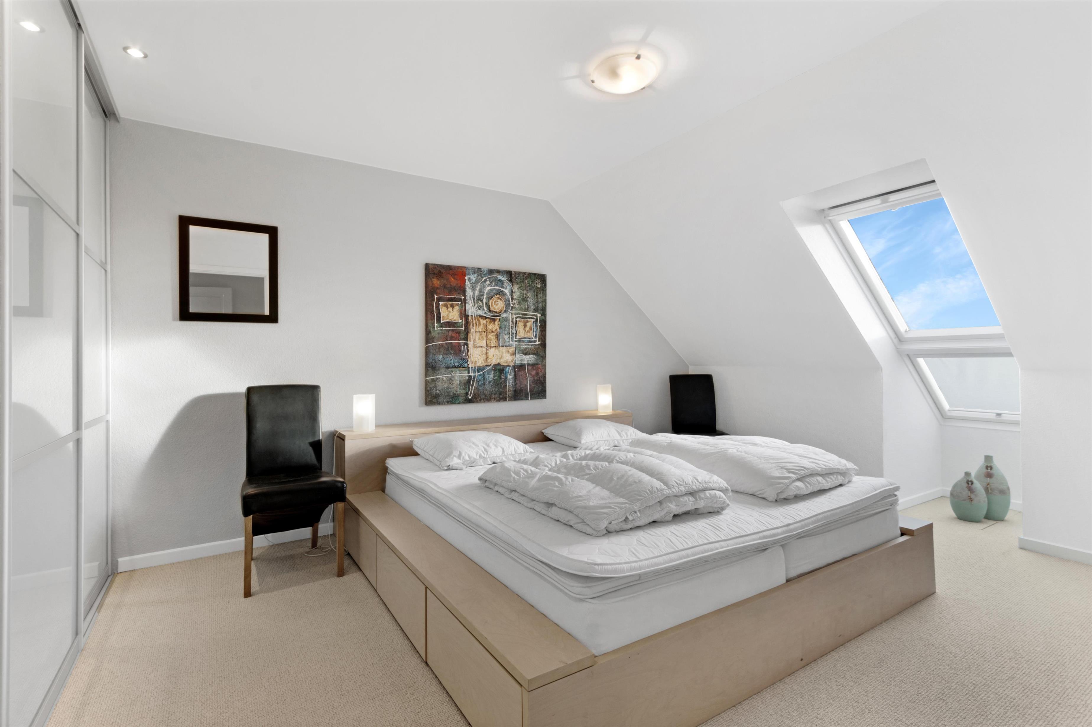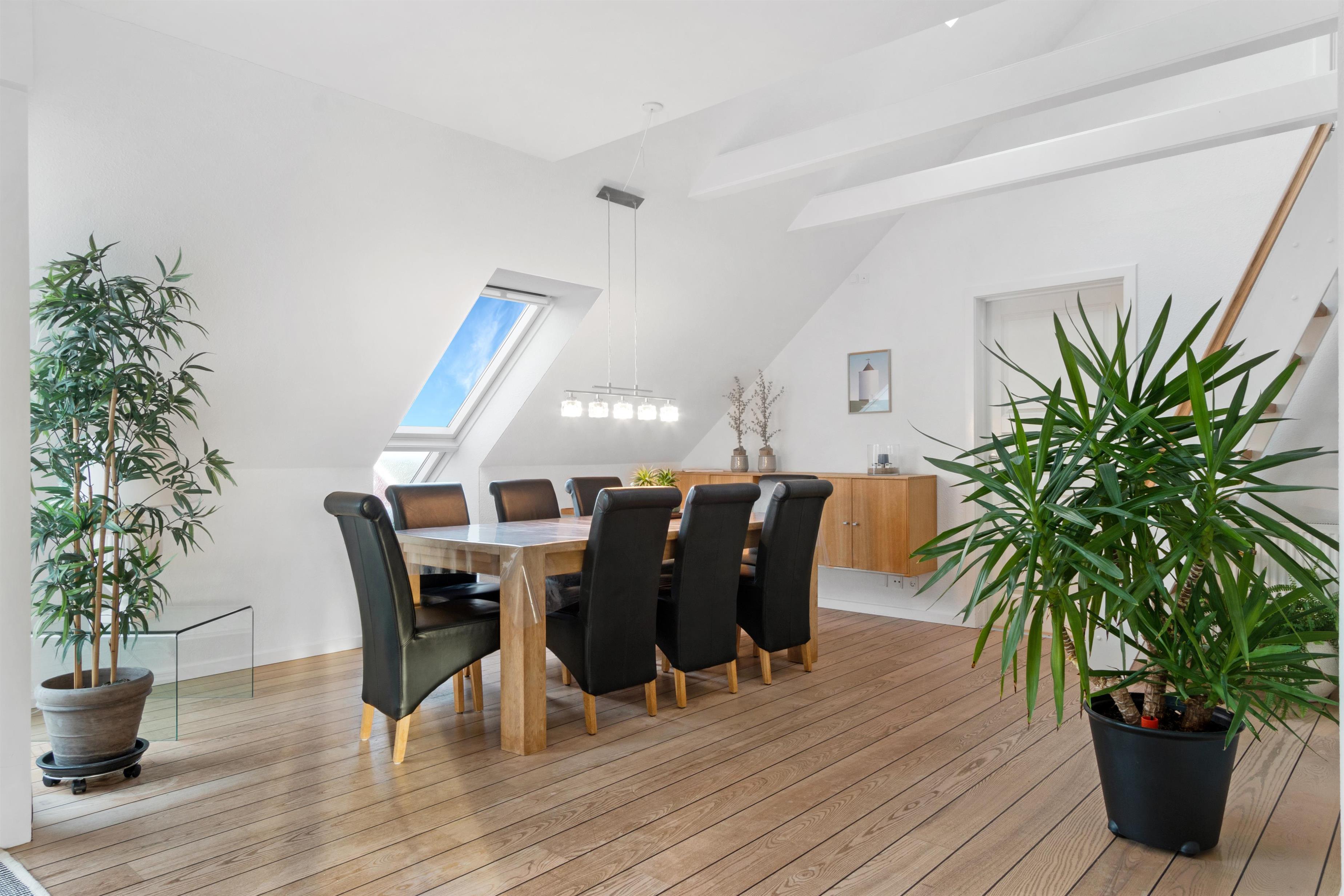 Denne ferielejlighed, der ligger i Løkkens absolutte centrum, er virkelig en perle af en feriebolig til udlejning. Lejligheden er i to etager + hems med aflukket soveværelse, og udsigten over både Løkken by og vesterhavet er bestemt et besøg værd! Der er plads til 10 personer og et barn op til 3 år. Der er 5 soveværelser og to badeværelser fordelt på de skønne 172 m² - 8 sovepladser i dobbeltsenge og 2 i enkeltsenge. Derudover er der 1 stk. barneseng, og det er tilladt at medbringe sit kæledyr. Der er gulvvarme i køkkenet og på badeværelserne. Herudover er der flere super karakteristika ved lejligheden.