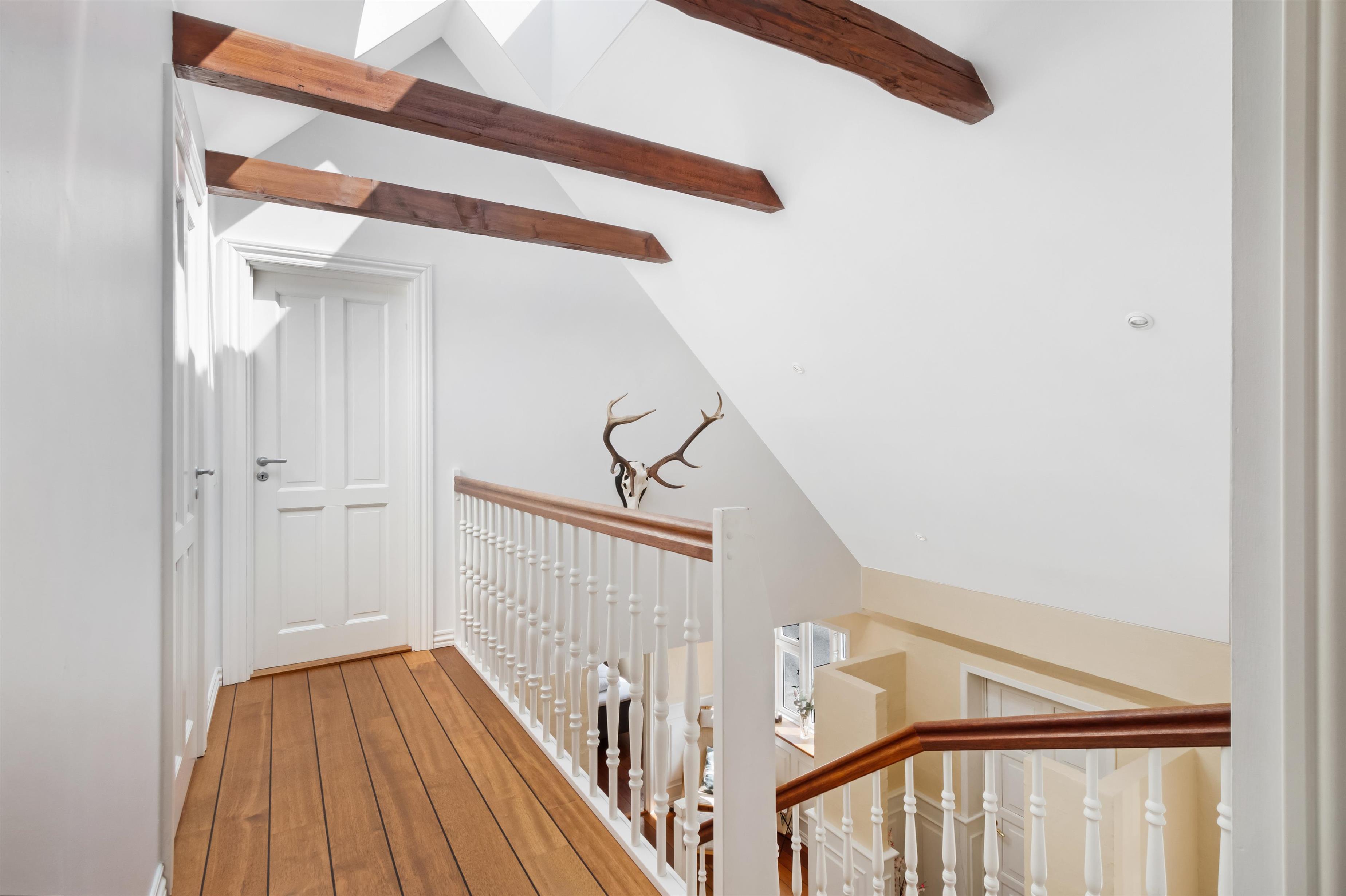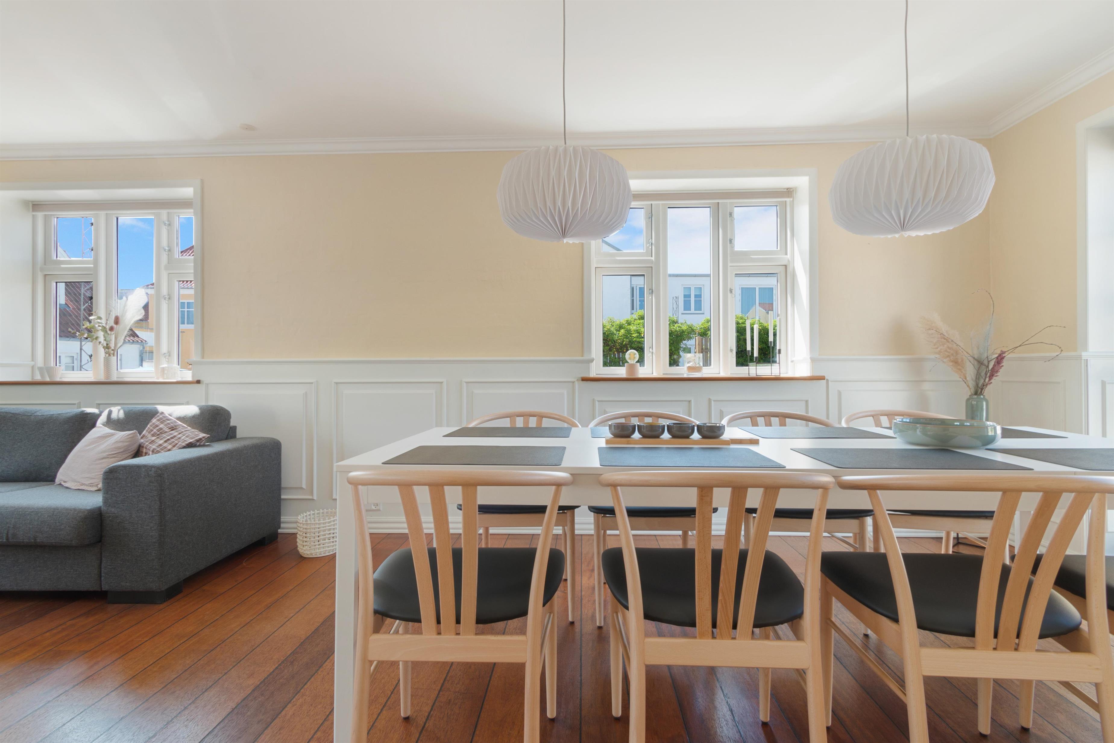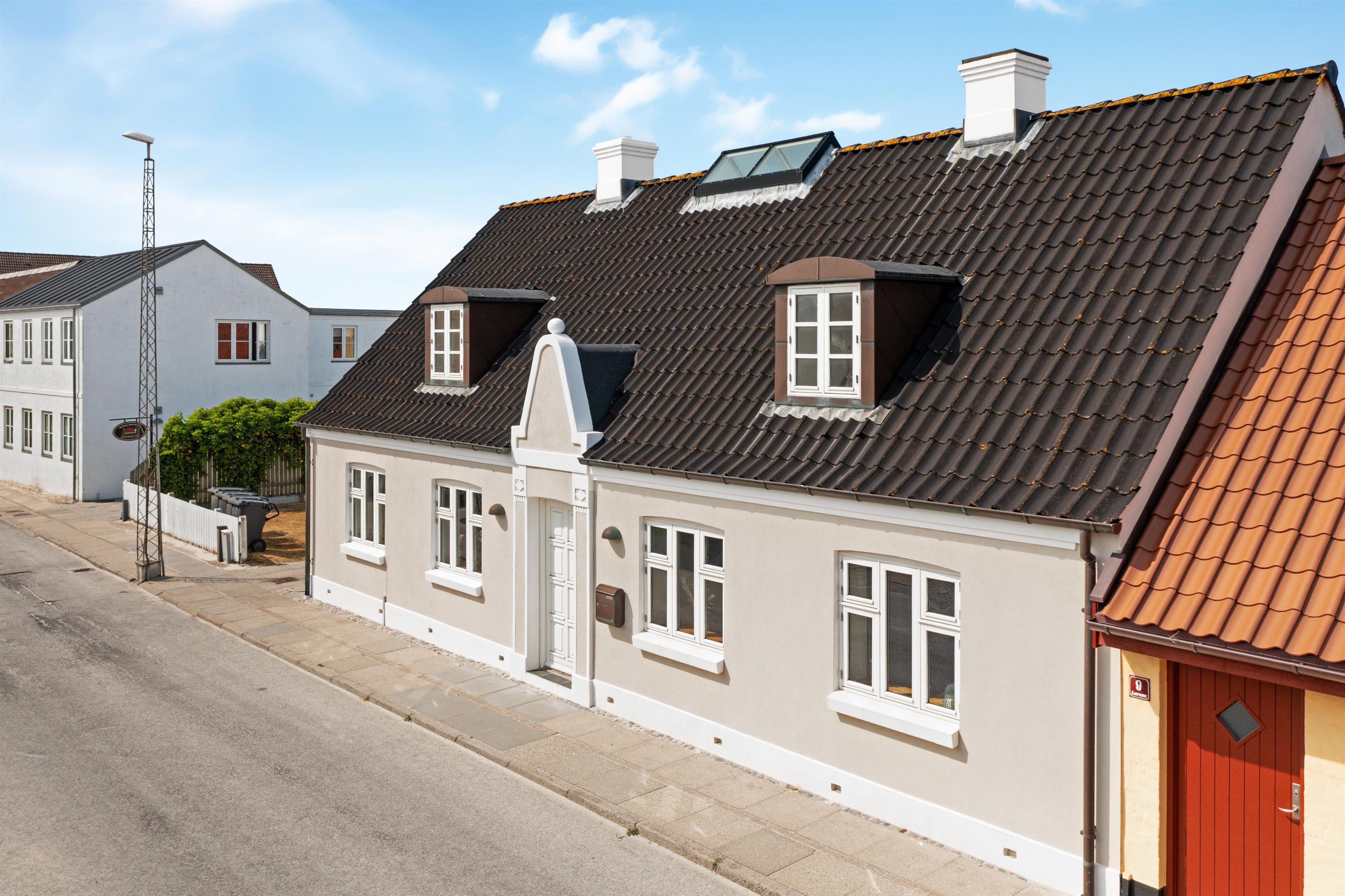 Husets skønne rum fordeler sig i stueetagen og på første sal. I stueetagen er der stort byggers, et stort badeværelse, et stort åbent køkkenalrum/stue samt et af husets rummelige soverum. Der er åbent til trappen op til første sal, hvor du finder tre soverum og husets andet badeværelse. Huset ligger i centrum og er dermed også oplagt udenfor sommerens højsæson. Nyd fx en regnvejrsdag i den hyggelige stue foran husets bændeovn!