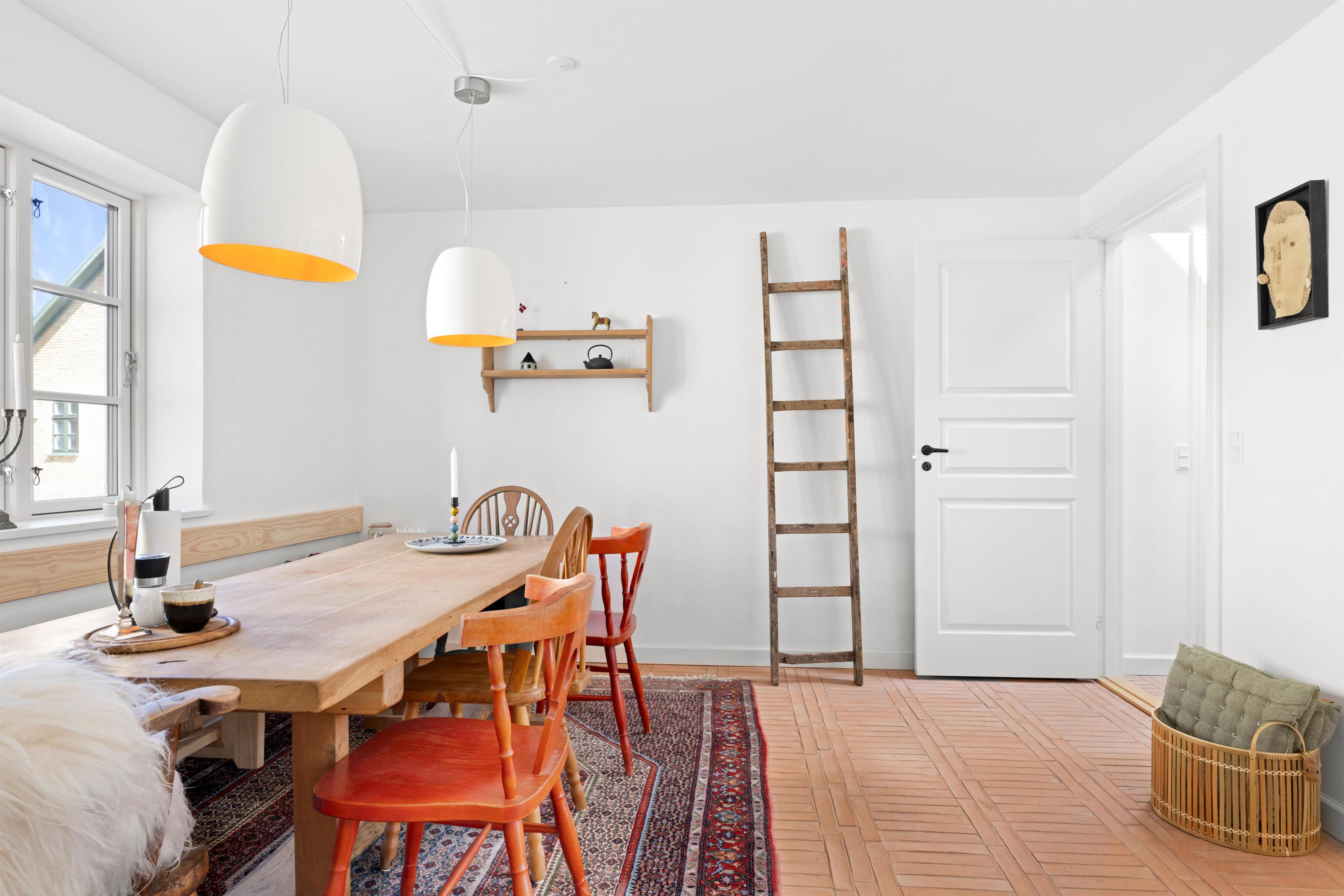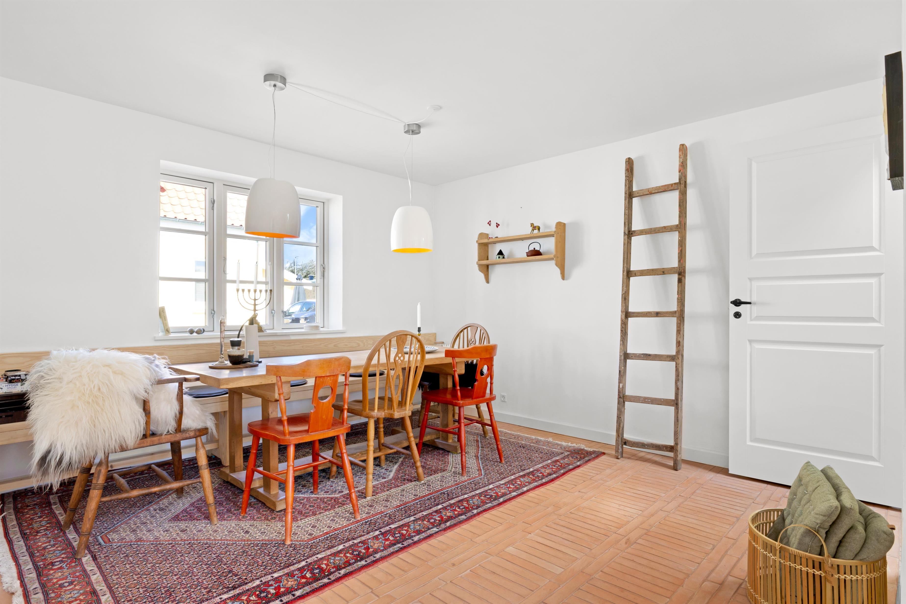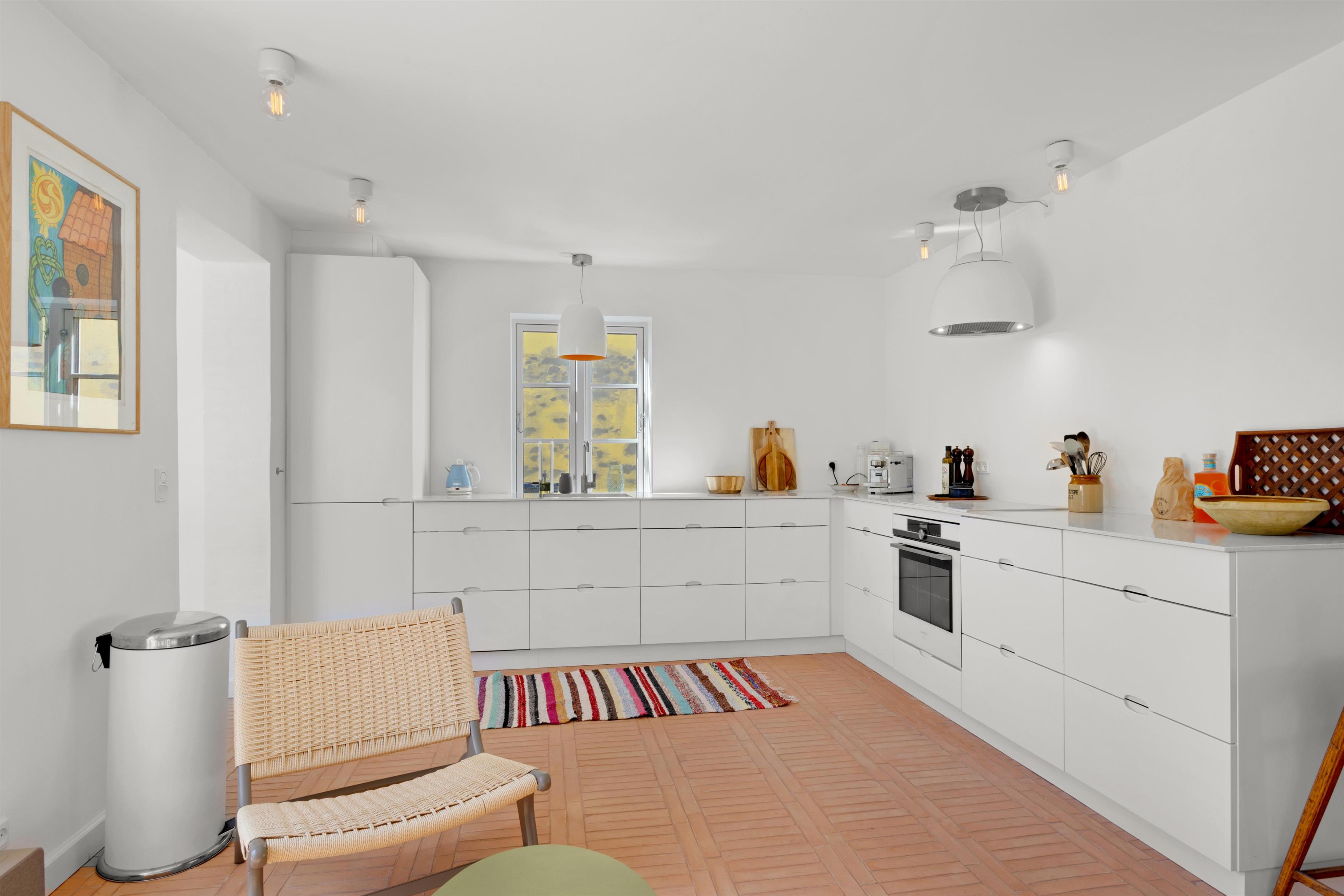 Køkkenet og stuen udgør et stort og charmerende rum, der skaber en perfekt atmosfære for samvær under madlavning og indendørs hygge. Det lyse køkken er indrettet med omhu og tilbyder god plads til at forberede lækre måltider sammen. Ved siden af køkkenet finder du spisepladsen med plads til 8 personer langs det fine bord med bænk.