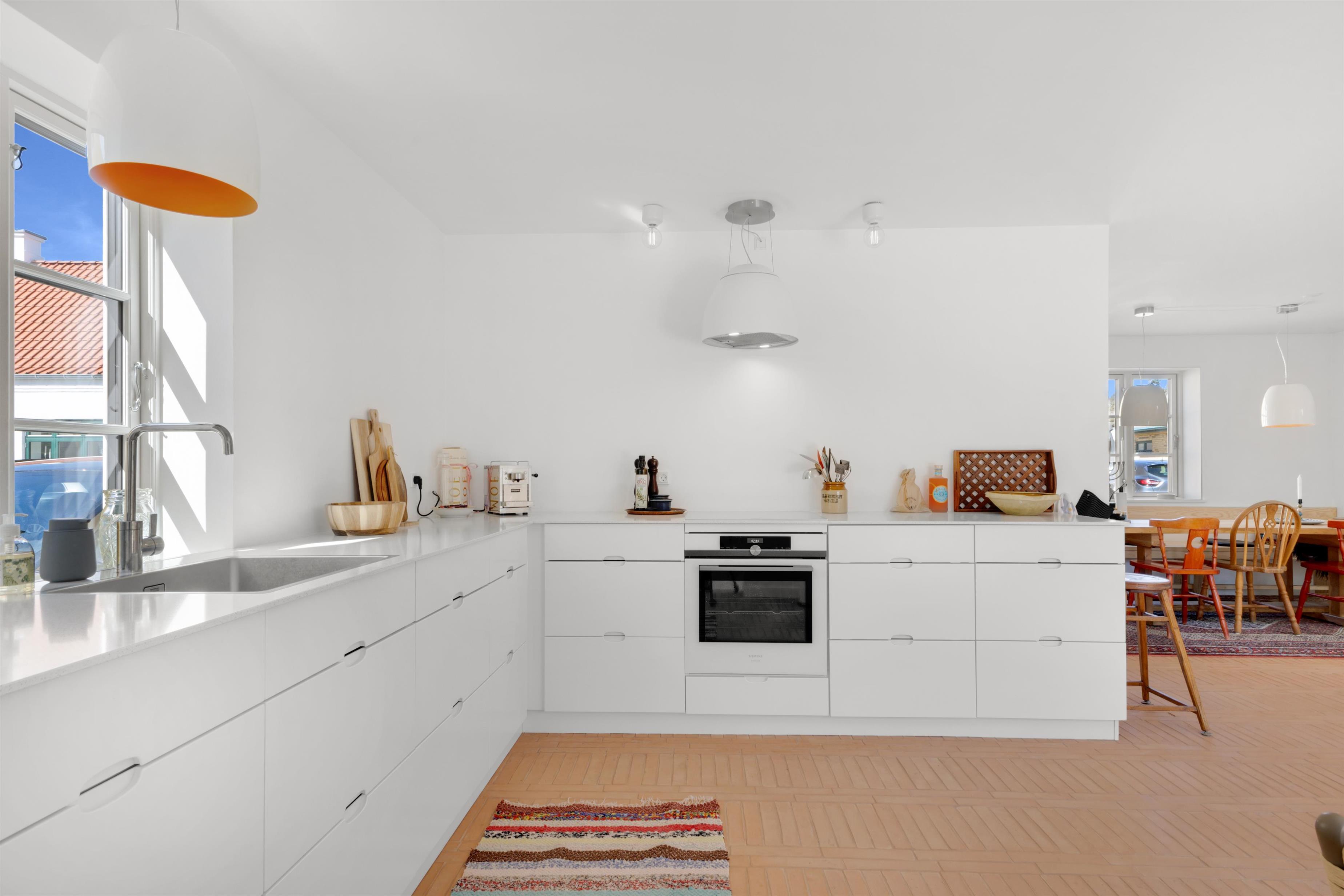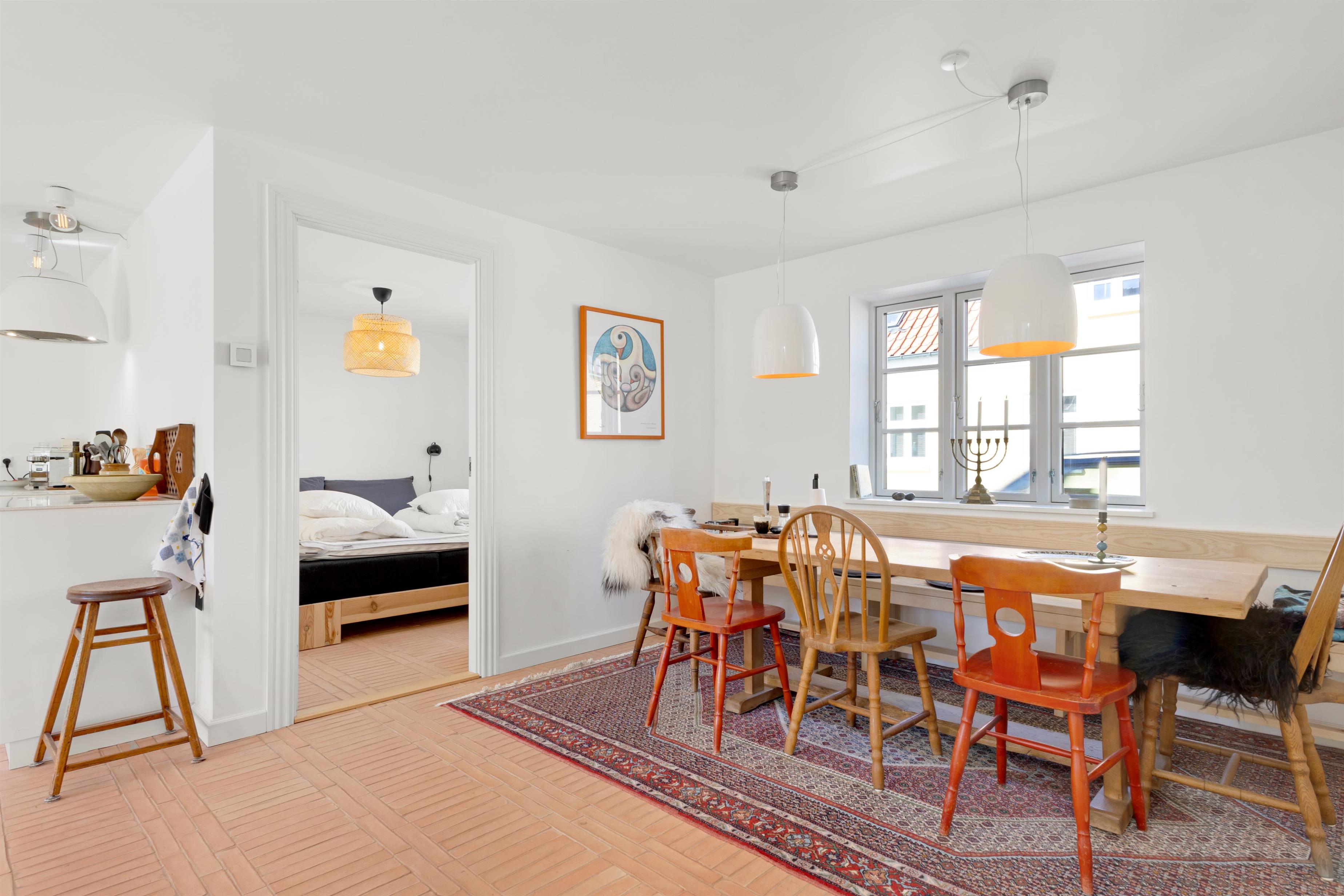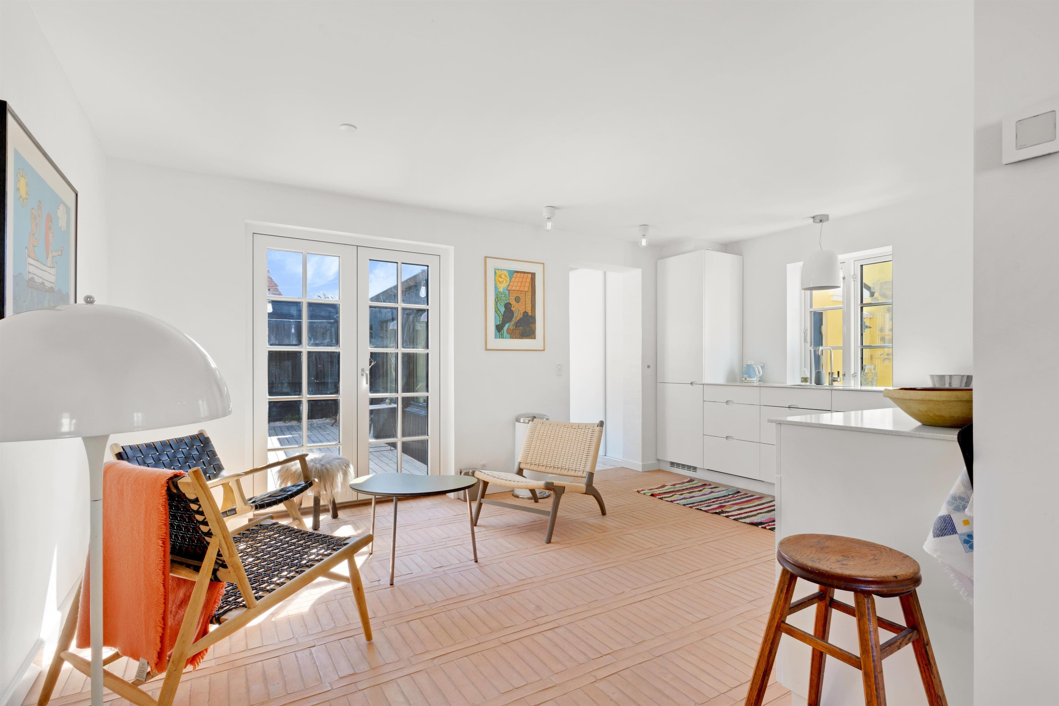 Køkkenet og stuen udgør et stort og charmerende rum, der skaber en perfekt atmosfære for samvær under madlavning og indendørs hygge. Det lyse køkken er indrettet med omhu og tilbyder god plads til at forberede lækre måltider sammen. Ved siden af køkkenet finder du spisepladsen med plads til 8 personer langs det fine bord med bænk.