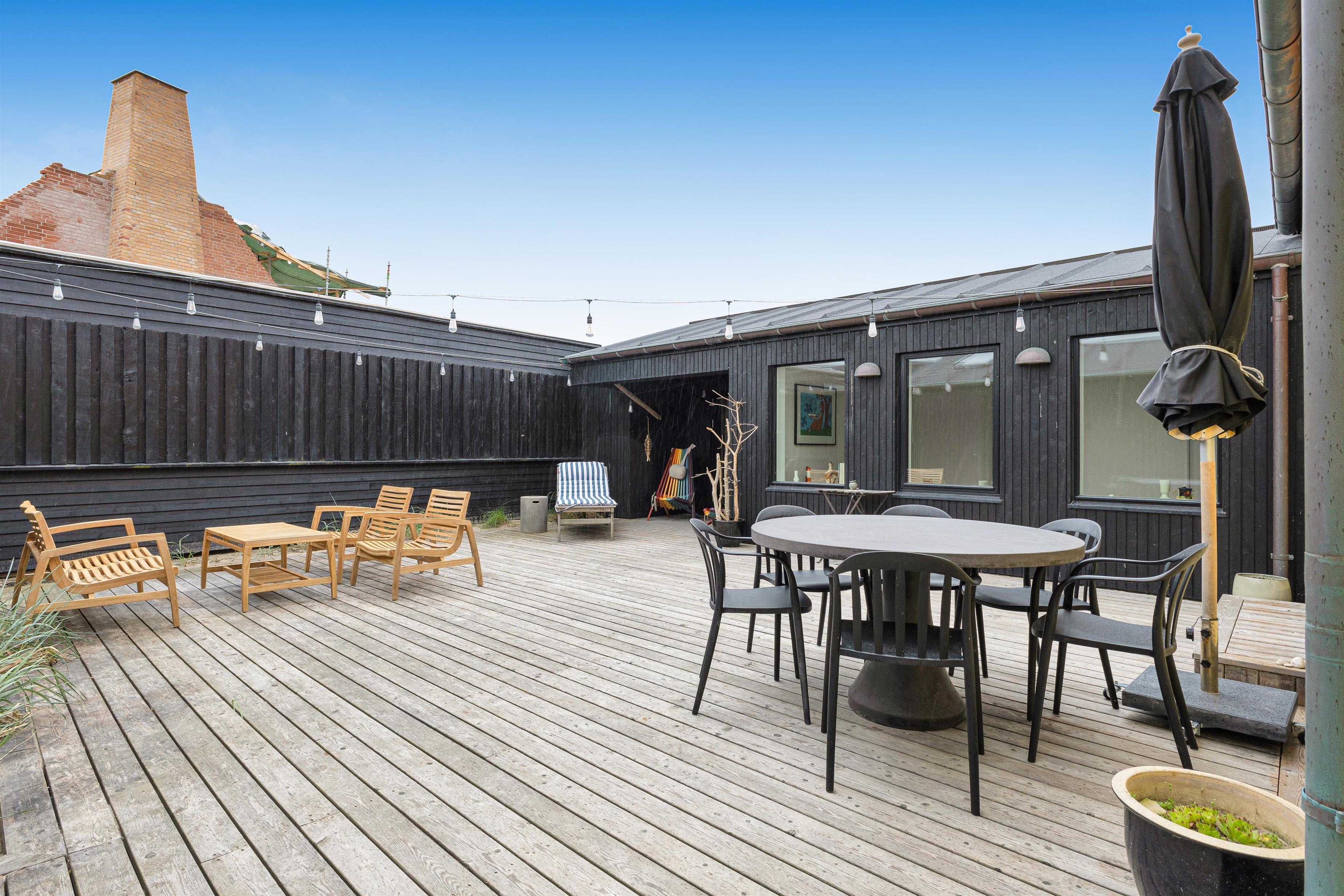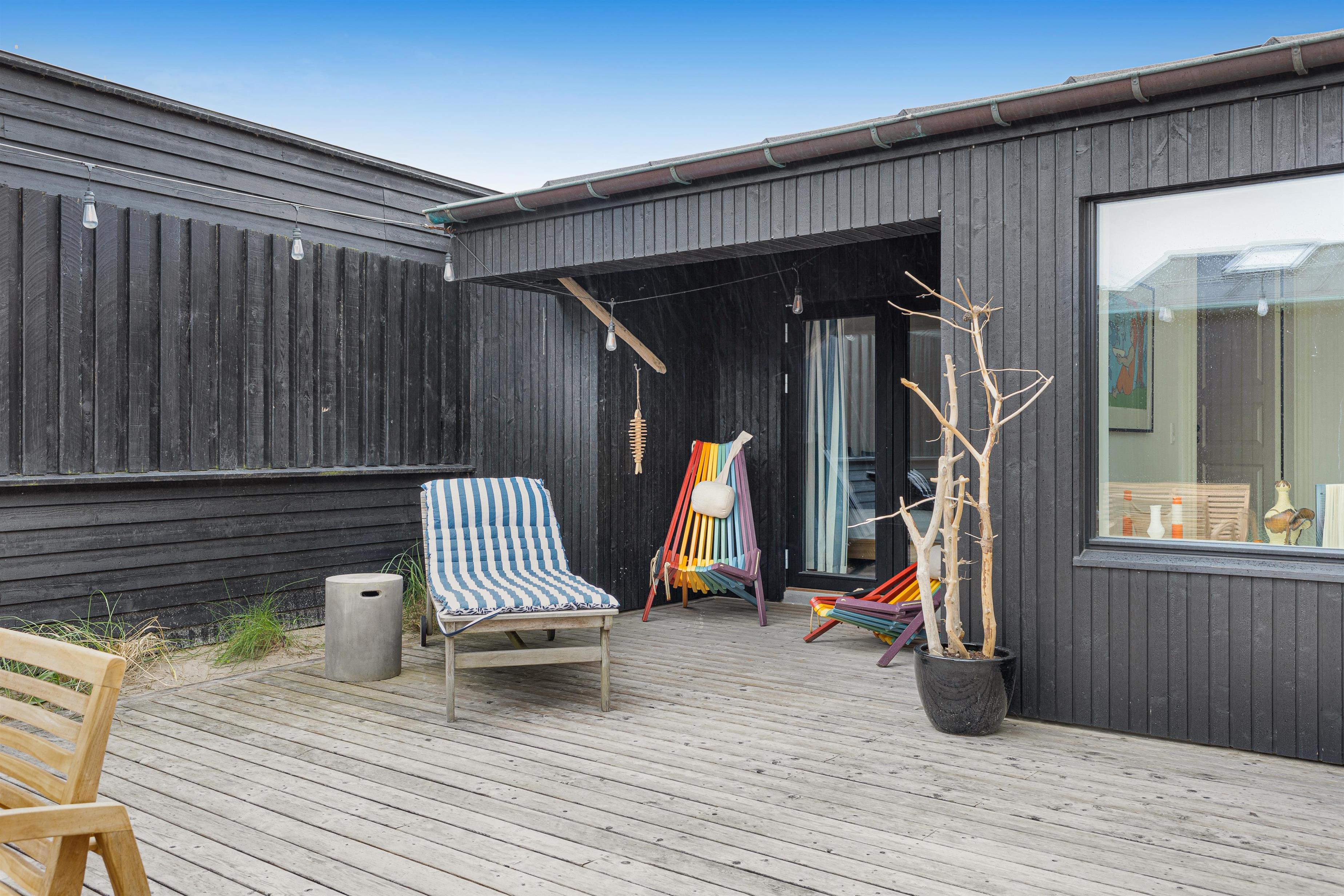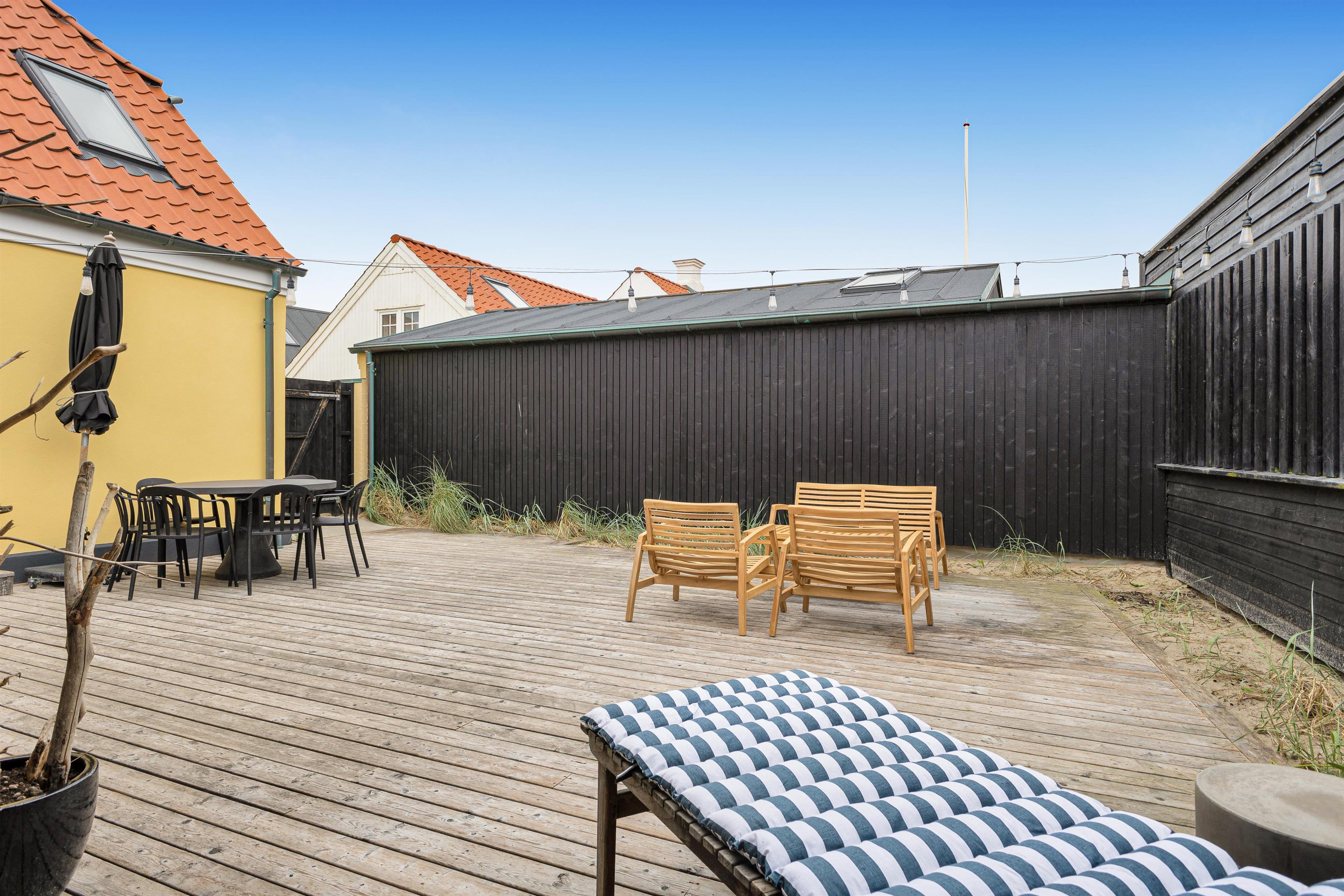 Med 100 meter til hhv. strand og 25 meter til nærmeste restaurant, er det slet ikke sikkert, at du kommer til at opholde dig meget i sommerhuset eller på terrassen, men når det byder sig, er terrassen dejligt afskærmet fra byliv mm. Med siddepladser til 6 personer i spiseområdet kan du nyde udendørslivet til fulde! På terrassen er der foruden grill også flere møbler at slænge sig i.