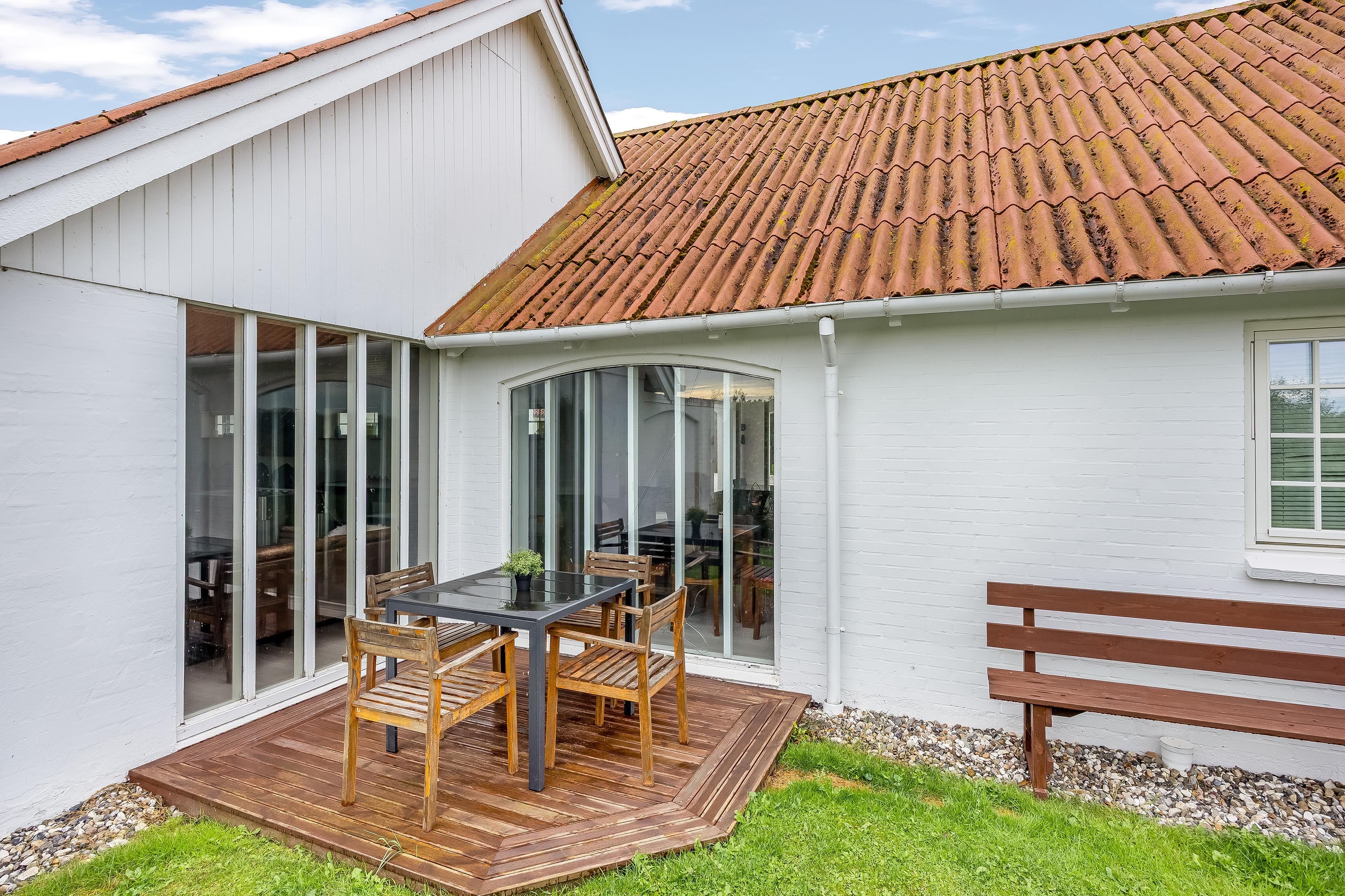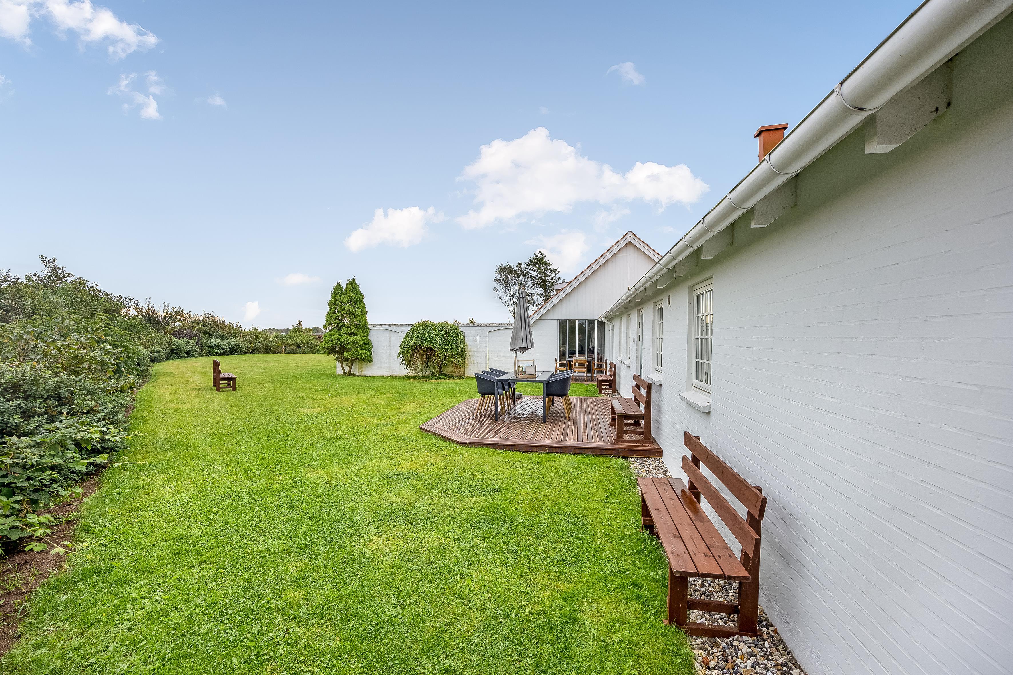 Udendørs indbyder haven til hygge. Den er indrammet af et trærækværk og oplyst af velplacerede lamper, som skaber en hyggelig stemning om aftenen.