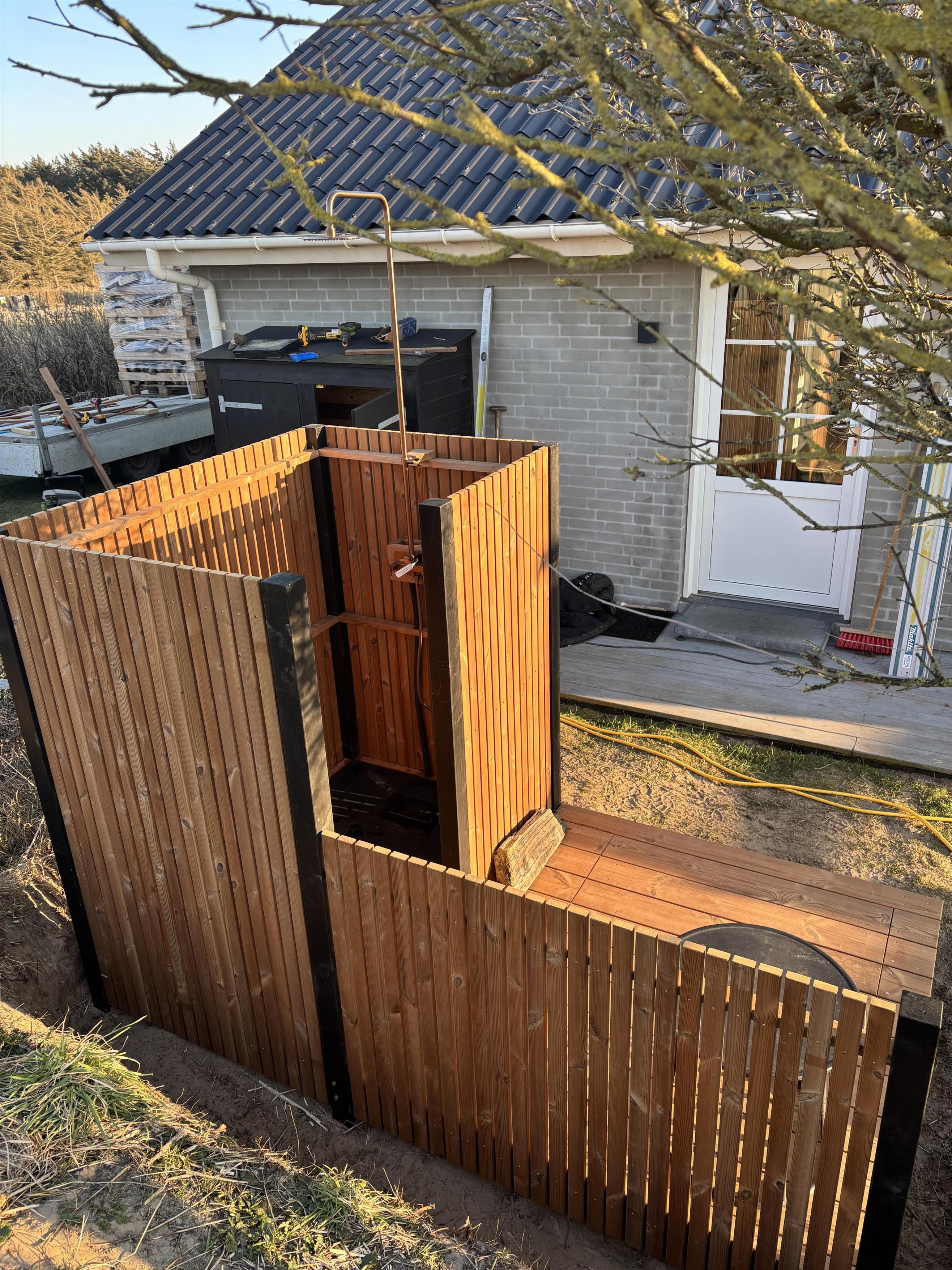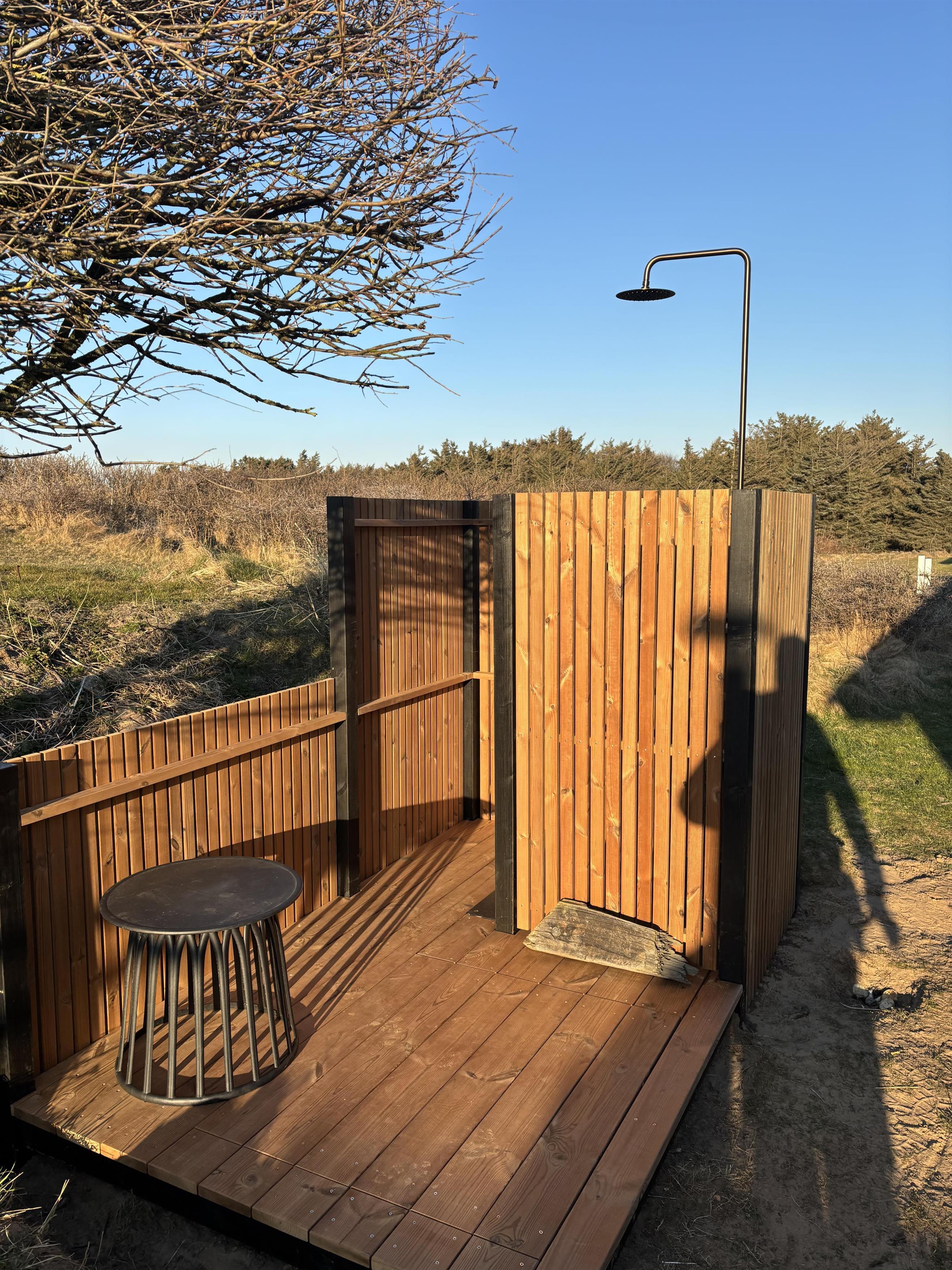 Omkring huset er der som nævnt dejlige terrasser og en udebruser og -spa samt havemøbler. Her er et skønt shelter, hvor det er super hyggeligt at overnatte. Huset ligger i et roligt område, hvor naturen er rå og dejlig! Vil du opleve mere leben, kan du blot tage et smut ned på stranden eller køre til enten Løkken eller Lønstrup, som er meget populære feriebyer på Danmarks nordvestkyst. Det er let at parkere ved huset, og du må også medbringe bilen på stranden.