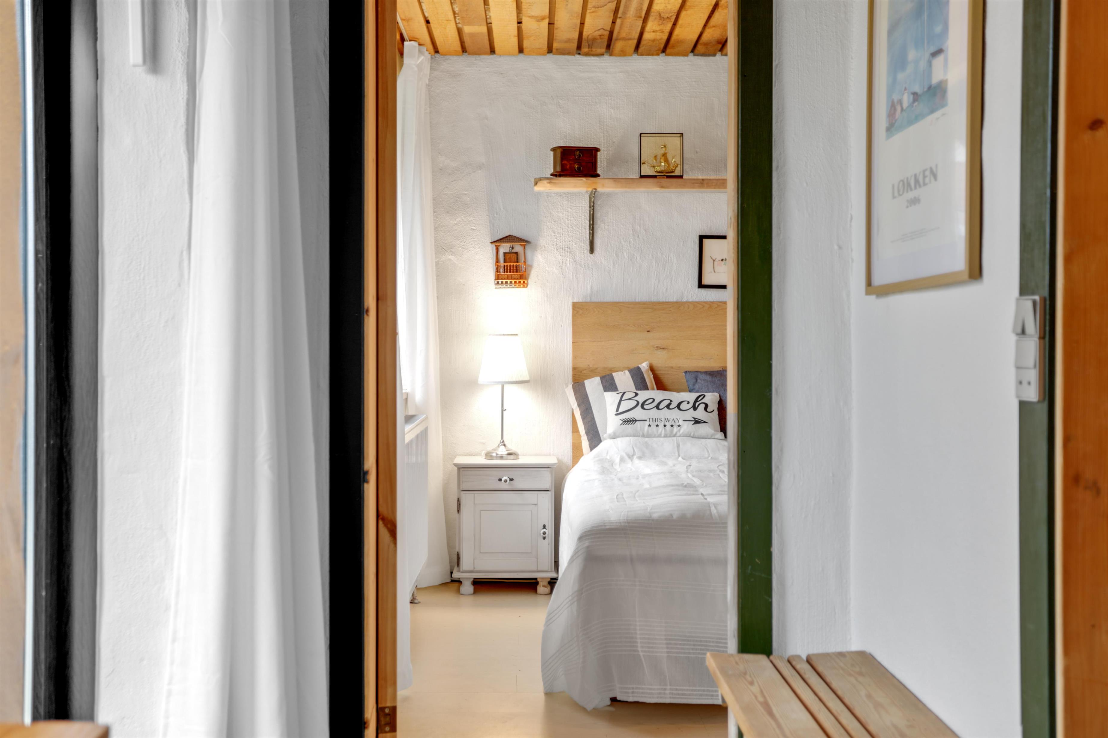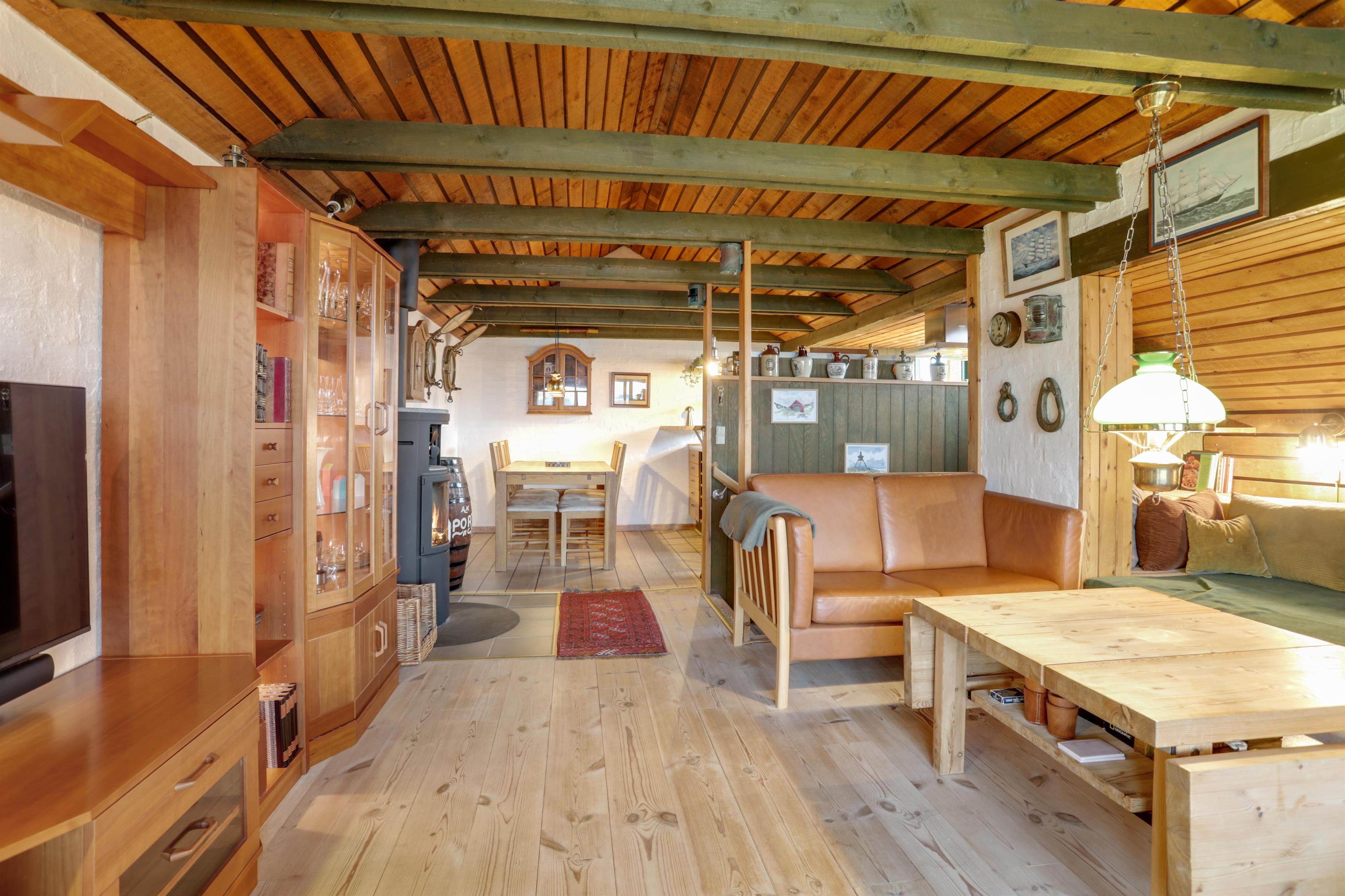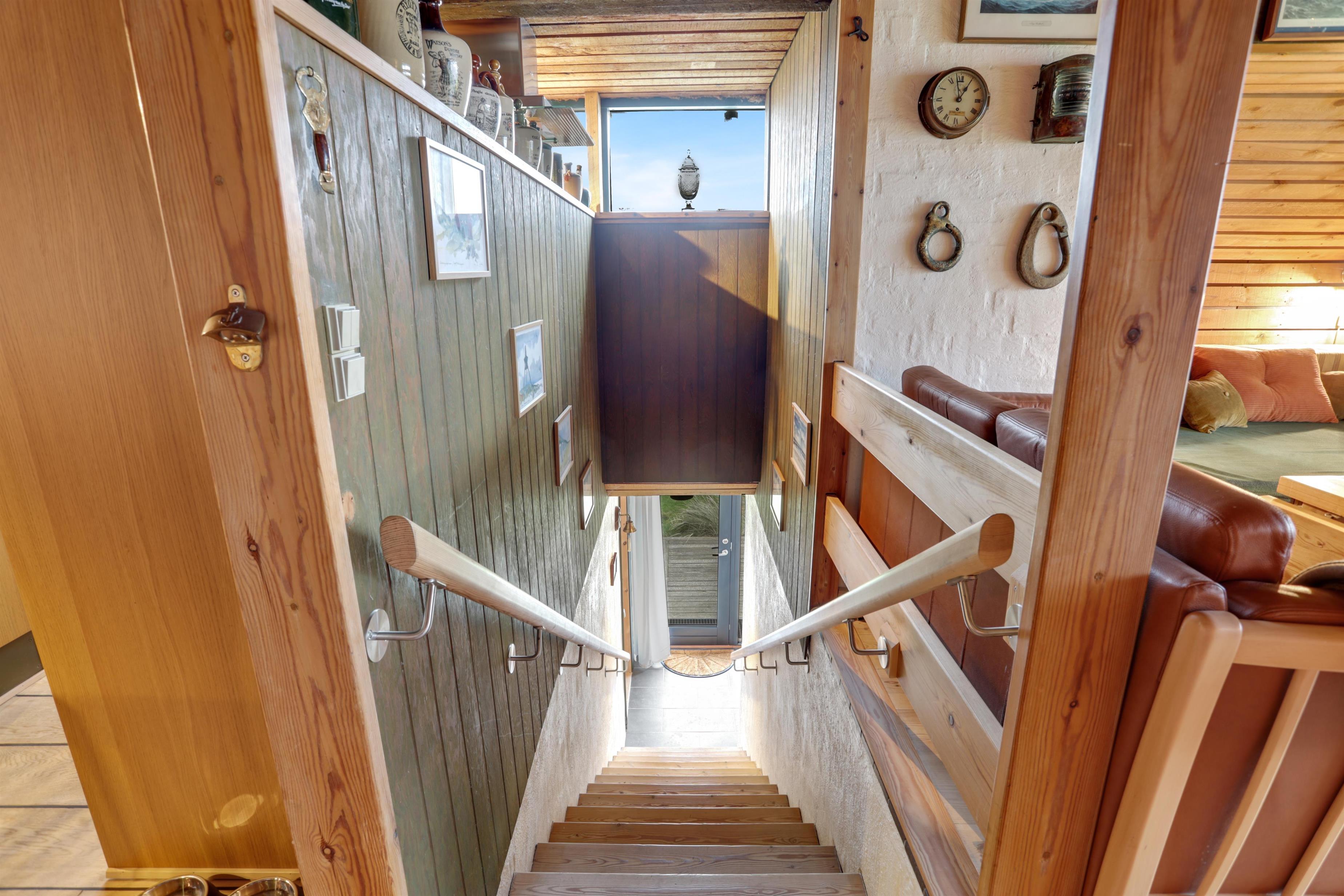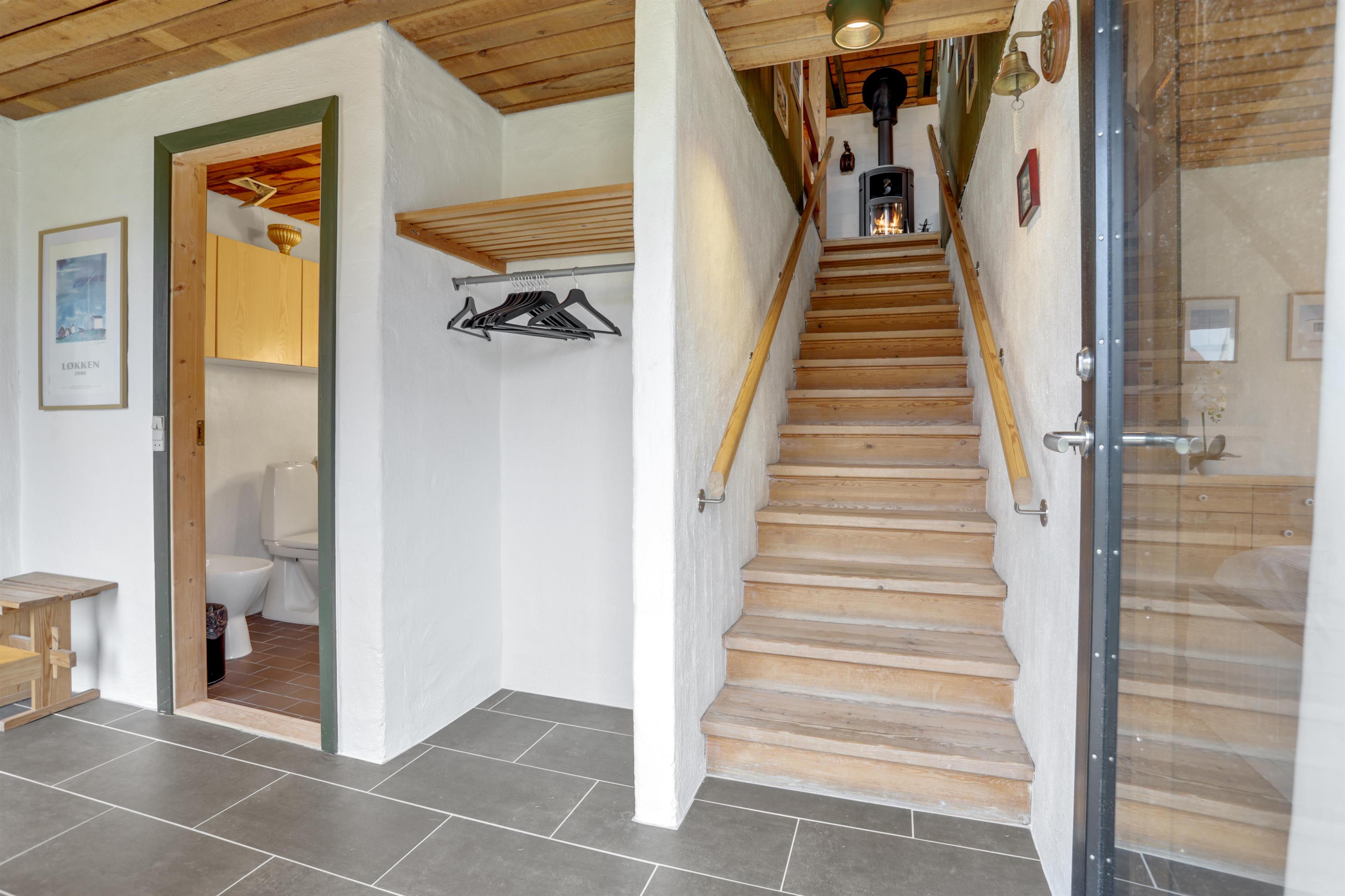 Når man træder ind af hoveddøren, mærker man straks den dejlige stemning, der er i dette sommerhus. Du træder ind i husets hyggelige entre, hvor der et soverum til både venstre og højre, samt husets badeværelse. Lige frem er trappen op til første sal, hvor du straks kan se husets brændeovn. Når der er knitrende ild i brændeovnen, fornemmer man straks hyggen fra første trin.