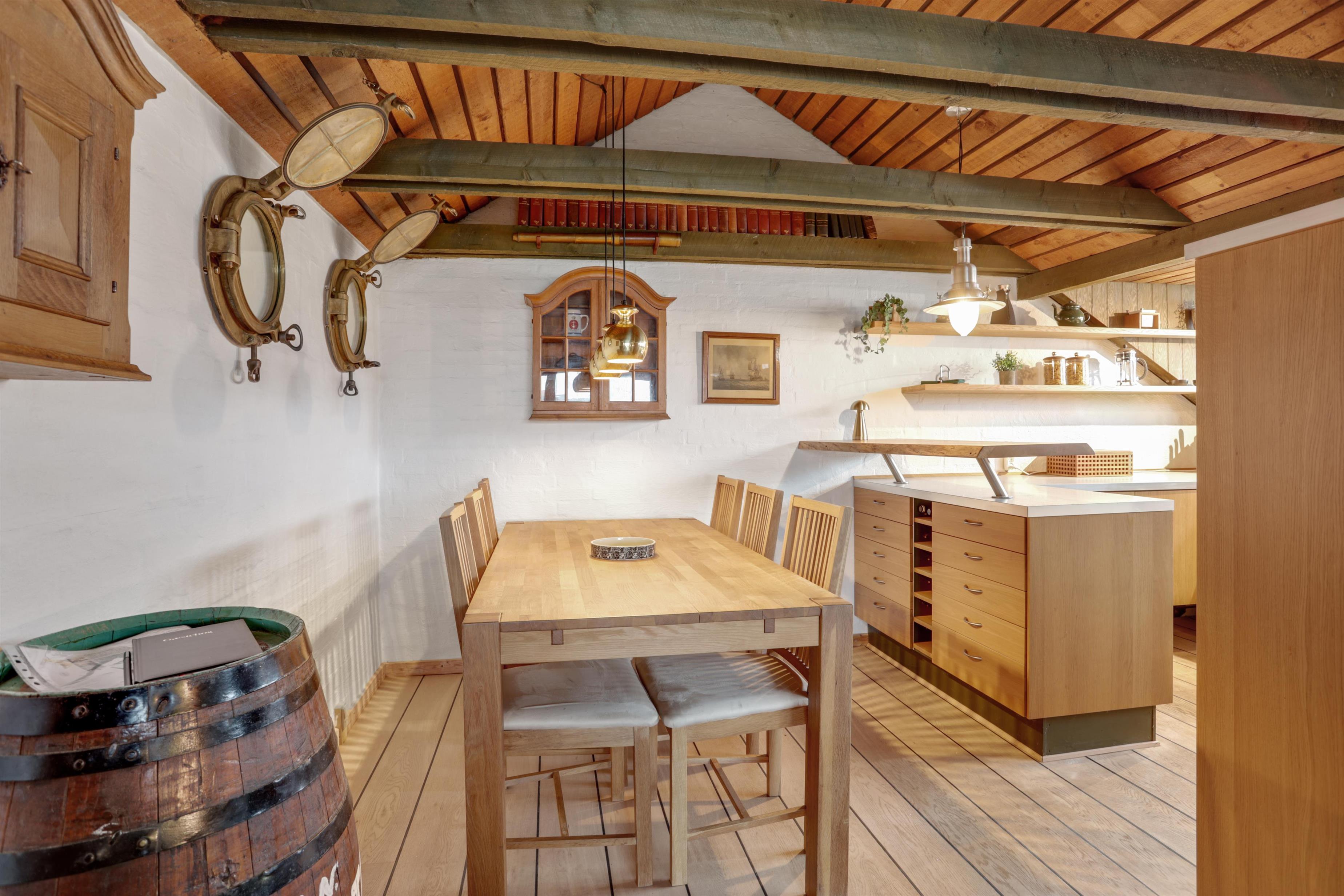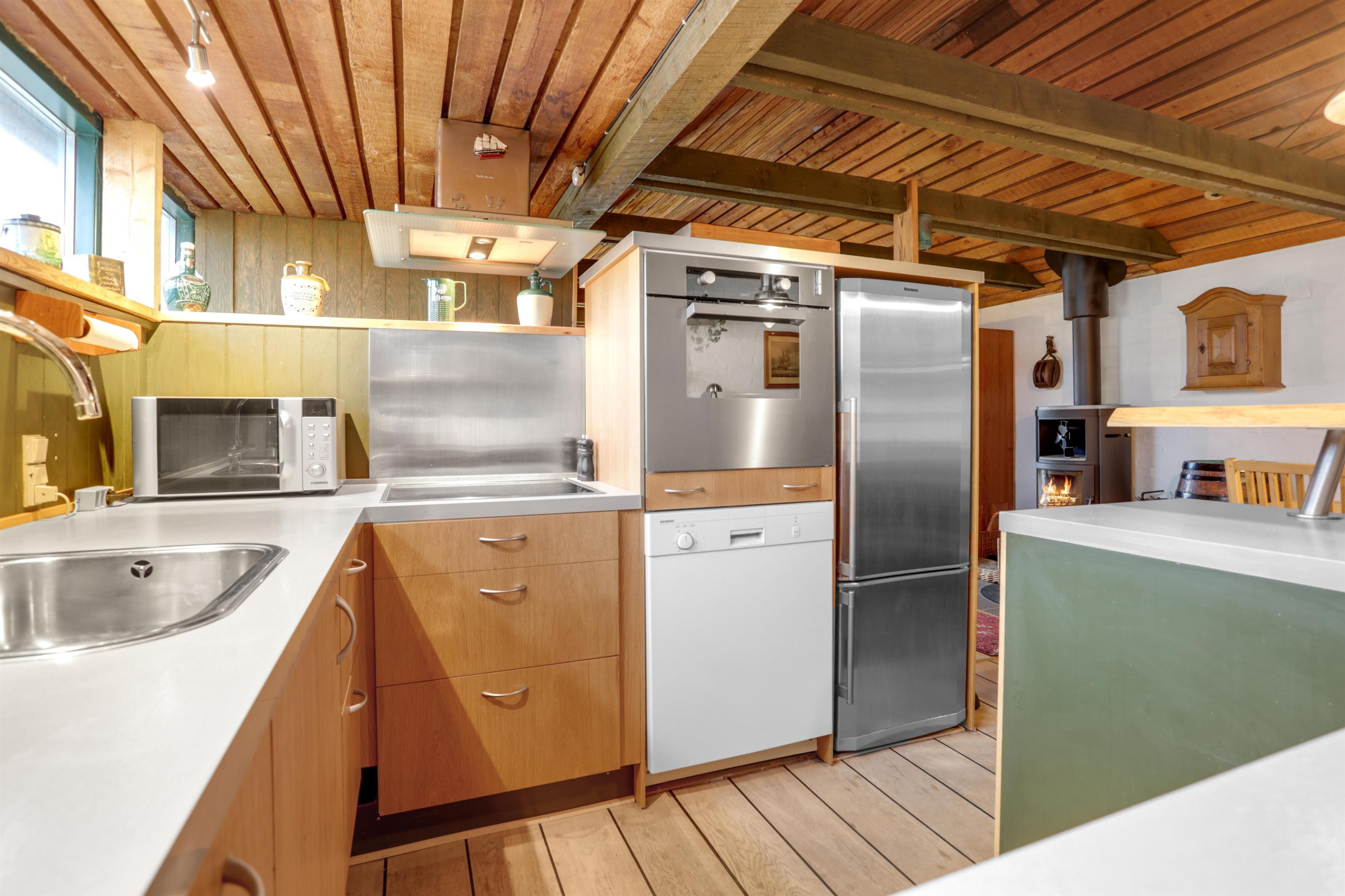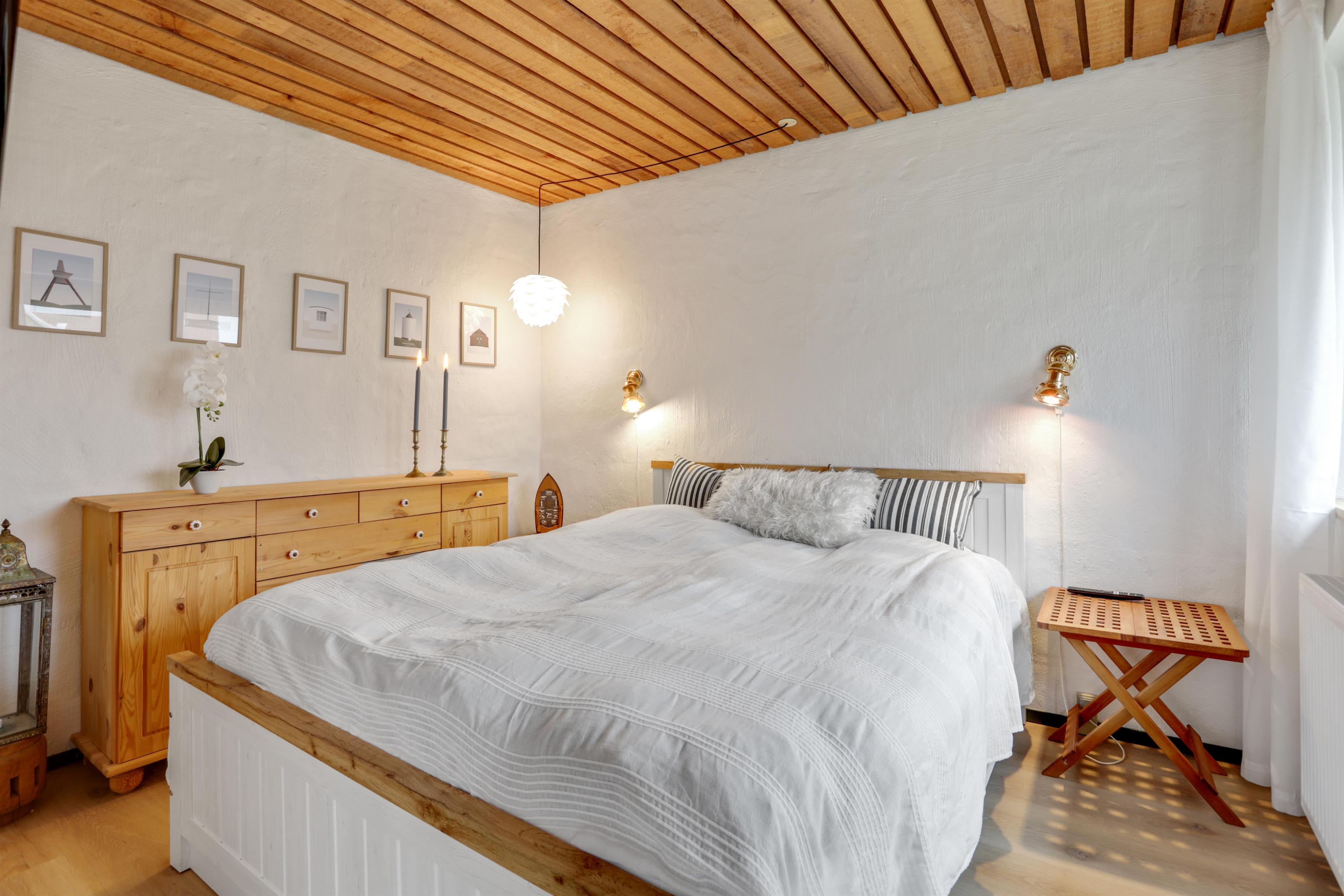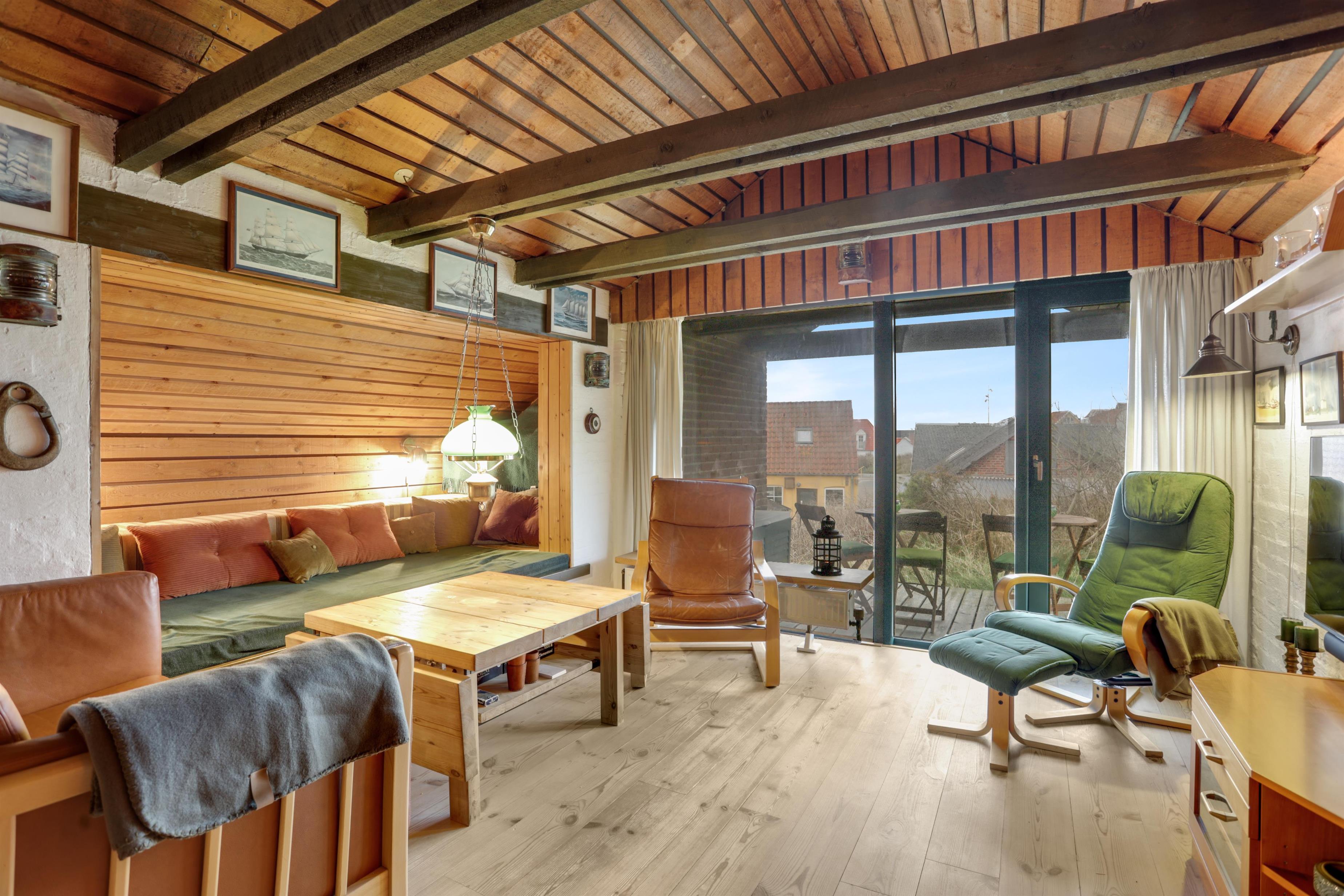 Når man træder ind af hoveddøren, mærker man straks den dejlige stemning, der er i dette sommerhus. Du træder ind i husets hyggelige entre, hvor der et soverum til både venstre og højre, samt husets badeværelse. Lige frem er trappen op til første sal, hvor du straks kan se husets brændeovn. Når der er knitrende ild i brændeovnen, fornemmer man straks hyggen fra første trin.