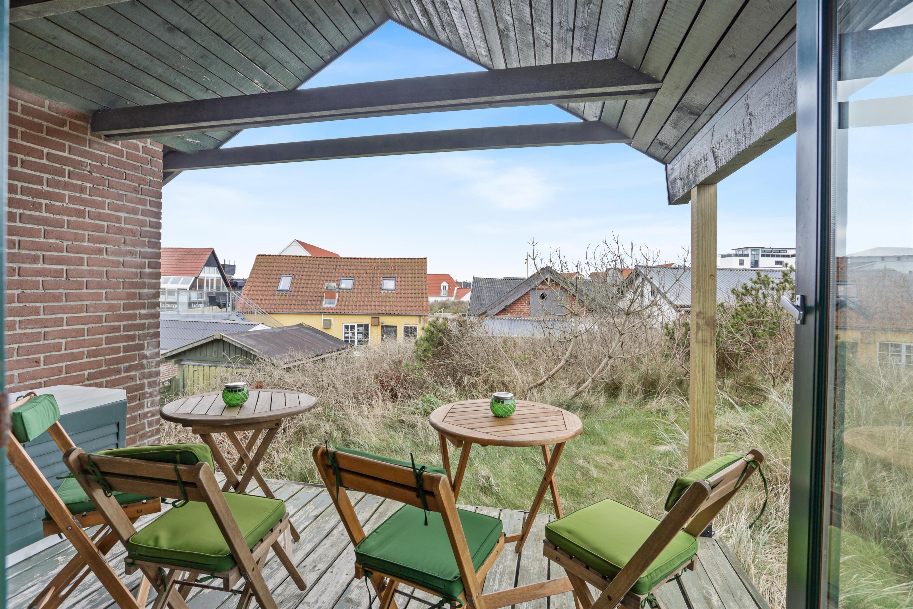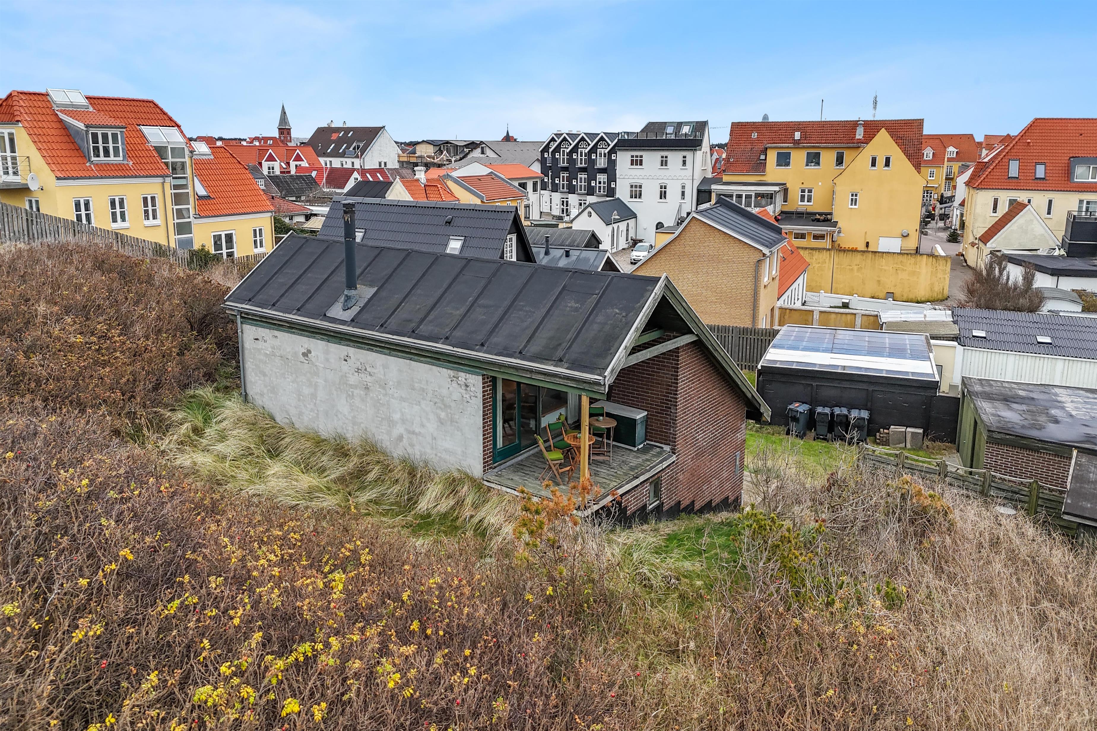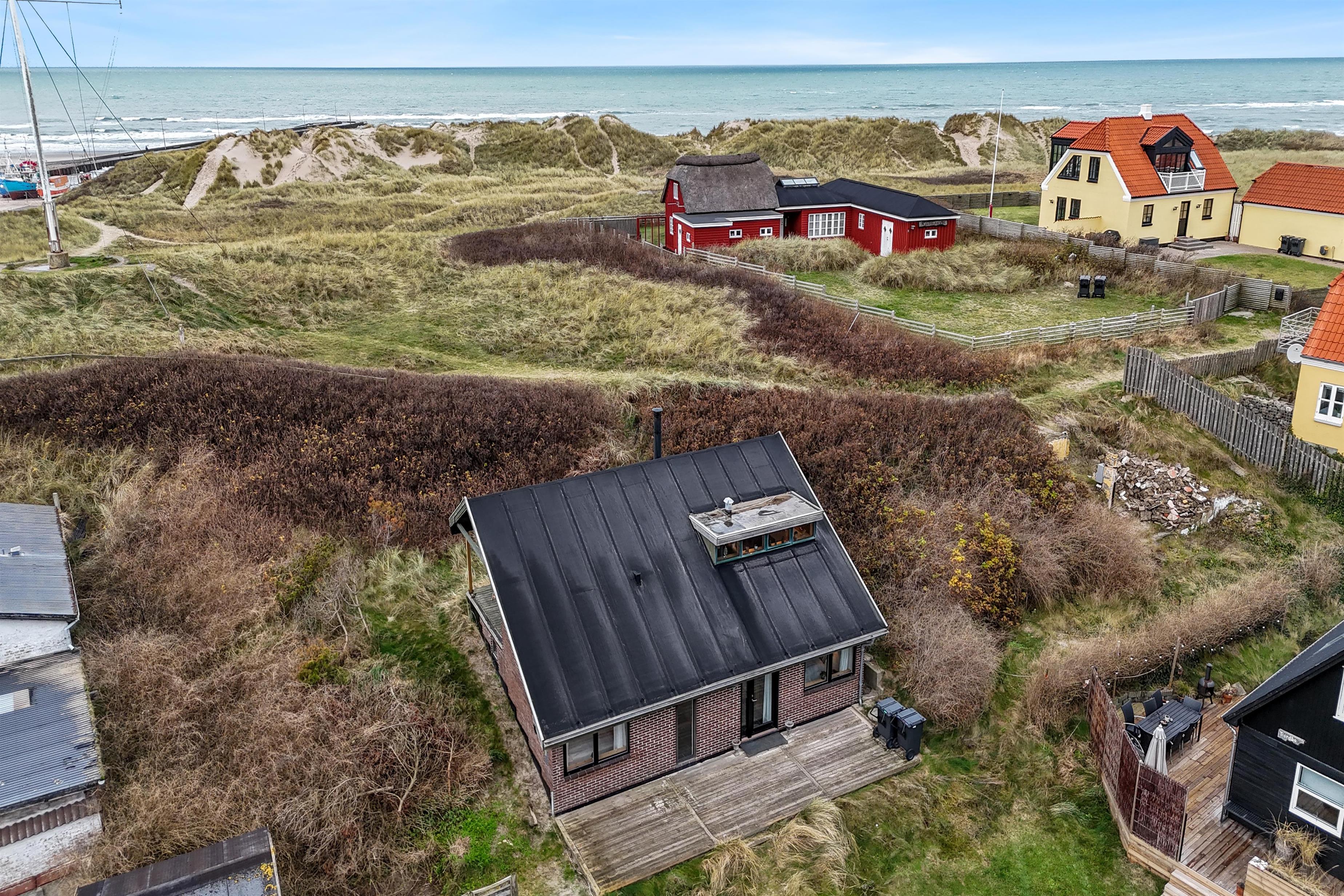 For at tilgå sommerhuset skal du ind mellem to af Løkkens populære restaurationer. Derfor får du umiddelbart stemningen af ferie og liv, mens du kan trække dig tilbage, når afslapningen kalder. På en varm sommeraften føles det som at være sydpå med det summende lydtæppe af mennesker, hygge og vesterhavets brusen. Huset er bygget ind i klitten og byder på to skønne terrasser, hvorfra solen kan nydes i fulde drag. Vi anbefaler at parkere på den store parkeringsplads på torvet, da det er smalt at køre ind mellem de to restaurationer. Terrænet er smukt og kuperet, og egner sig ikke til ustabilt gående.