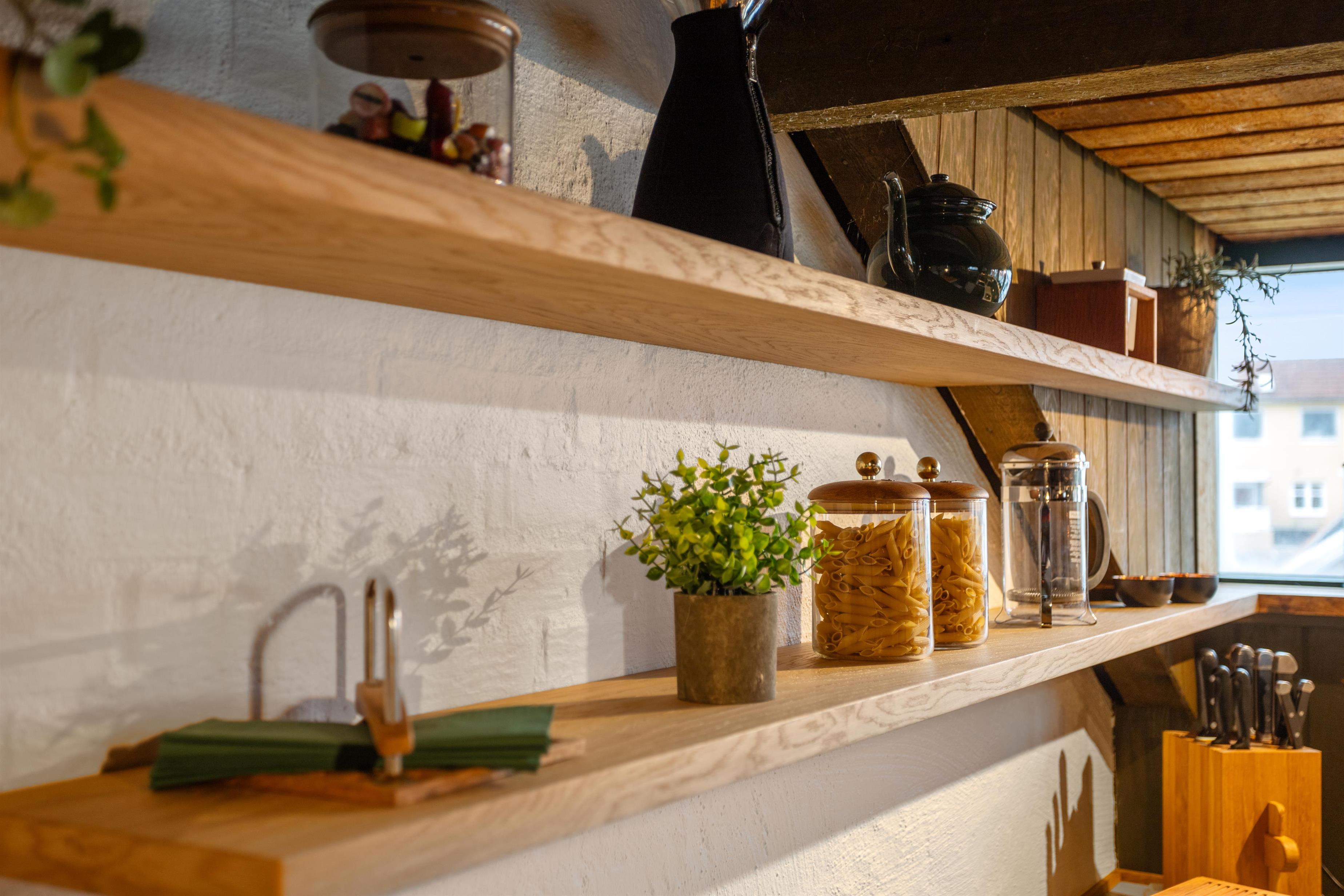 På første sal er husets køkken/alrum i åben forbindelse til stuen, med terrasse en suite, så naturen kommer helt ind i rummet. Herfra kan du se ned til Løkken centrum, mens Vesterhavet bruser i baggrunden. Også denne etage er helt enormt hyggeligt indrettet med en stor alkove, der kan fungere som både flyder sofa og 2 ekstra sovepladser. Fra både køkken og stue kan du nyde brændeovnen, der er centralt placeret.