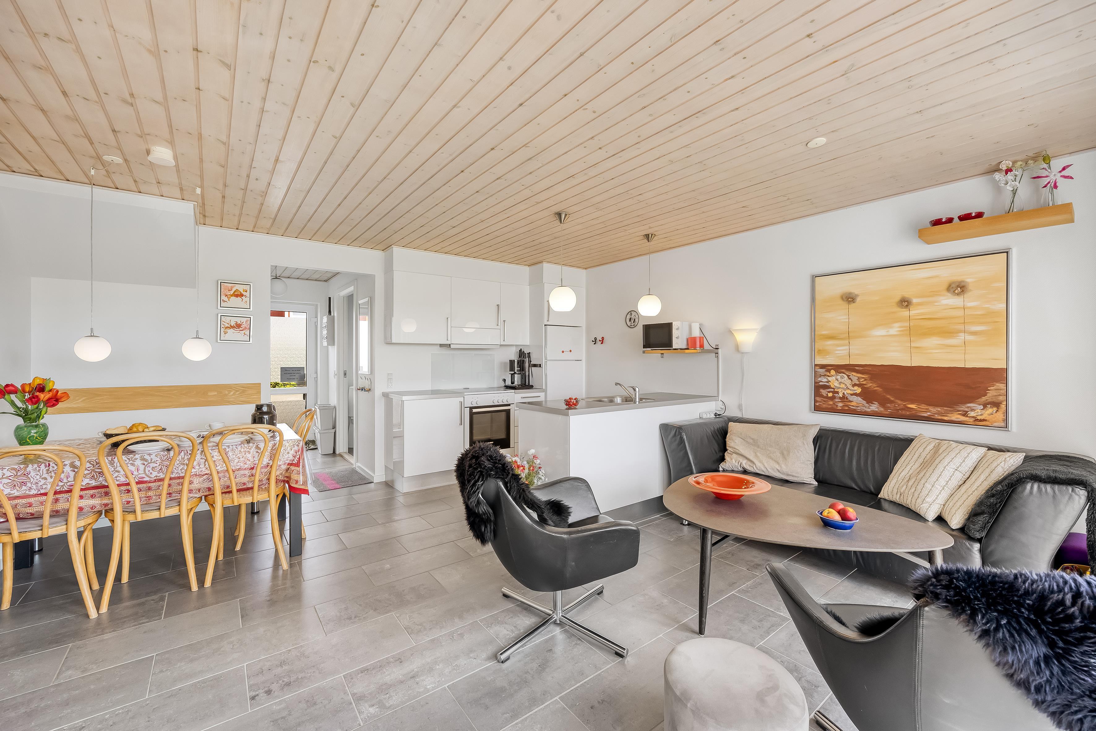 I ferieboligen er der gulvvarme i hele stueetagen, hvor en biopejs giver hygge i både stue og køkken. Køkkenet er udstyret med 1 køleskab med fryser på 30 l. Der er komfur med