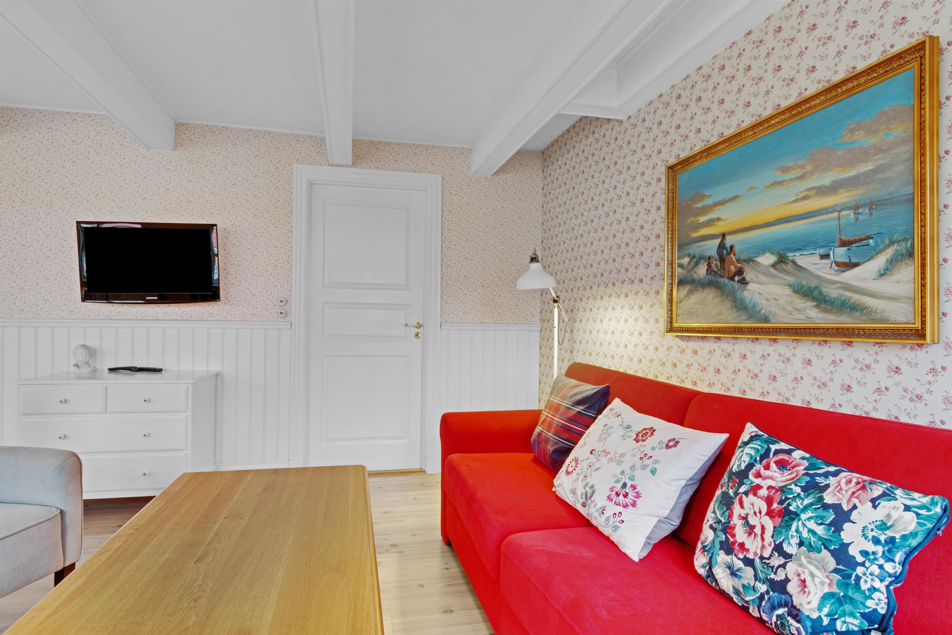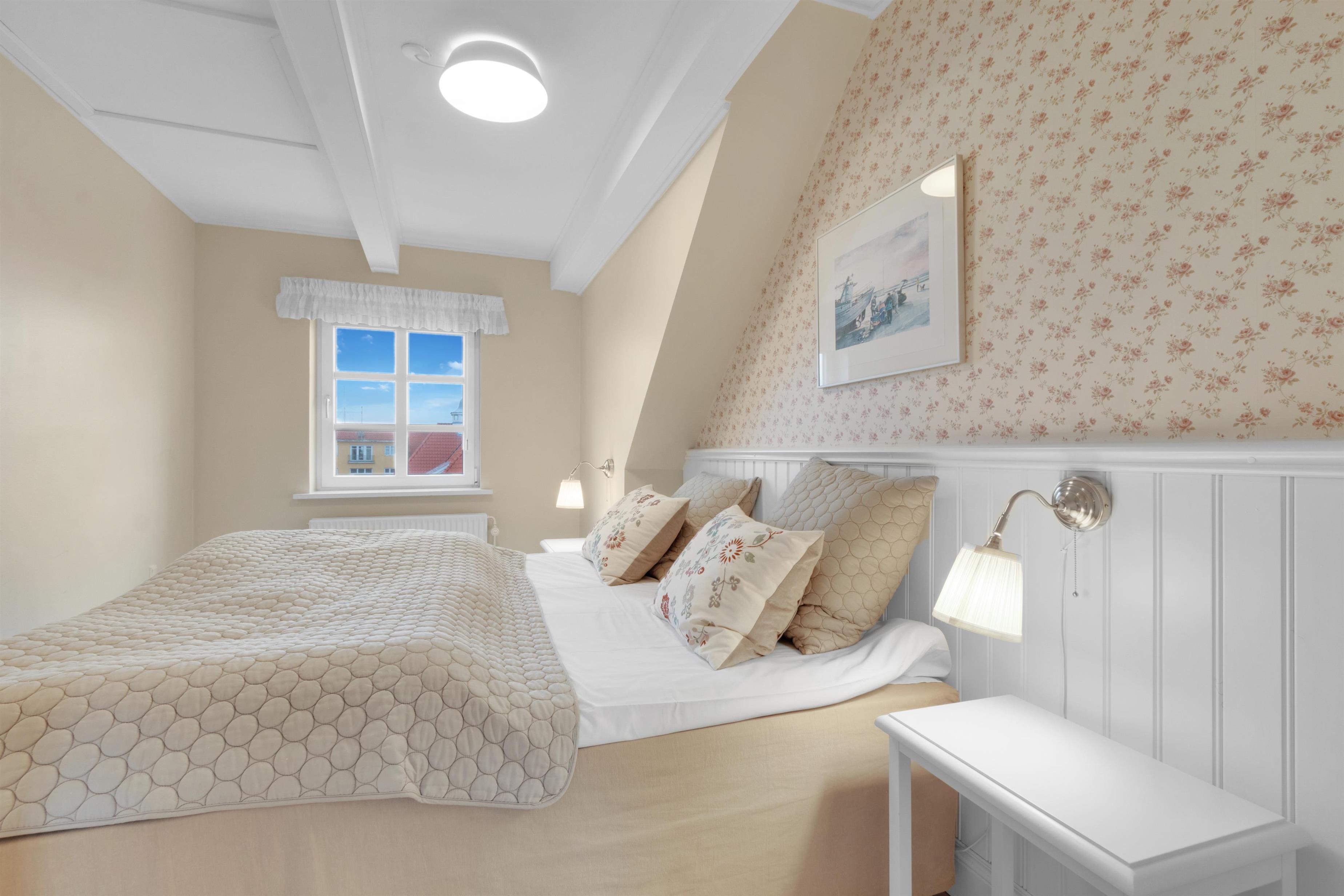 Ferielejlighedens værelser er store, lyse og imødekommende, og stilen er præcis som taget ud af et afsnit af serien “Badehotellet”. Lejlighedens køkken/alrum og stue er ét stort lokale med spisebord og tv stue, hvor sofaen er en sovesofa til ekstra opredning. Fra stuen kan du tilgå en dejlig, solrig terrasse (når vejret tillader det), og her er du altså tæt på dine naboer. Stemningen er altid hyggelig og der sidder næsten altid glade gæster og hygger sig bravt. Fra lejlighedens soveværelse har du hhv. udsigt over Løkkens Torv, hvor du kan følge med i feriestemningen på torvets spisesteder, bolcheriet, shoppingmulighederne mm. Badeværelse og toilet har du en suite til soveværelset, der indeholder samme dejlige stemning som resten af ferieboligen med blå og hvide klinker. Ferieboligen og røgfri og ungdomsgrupper er ikke tilladt.