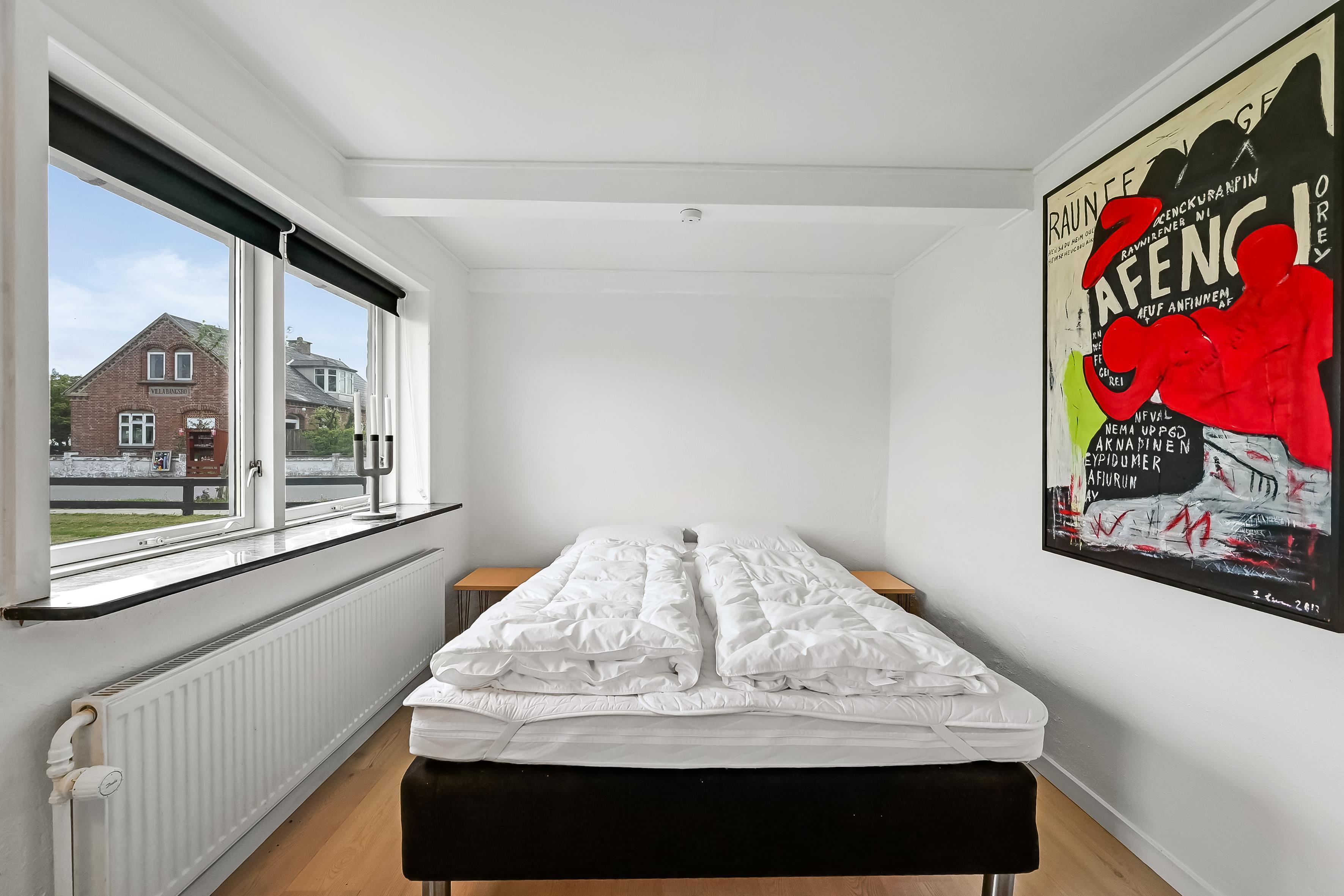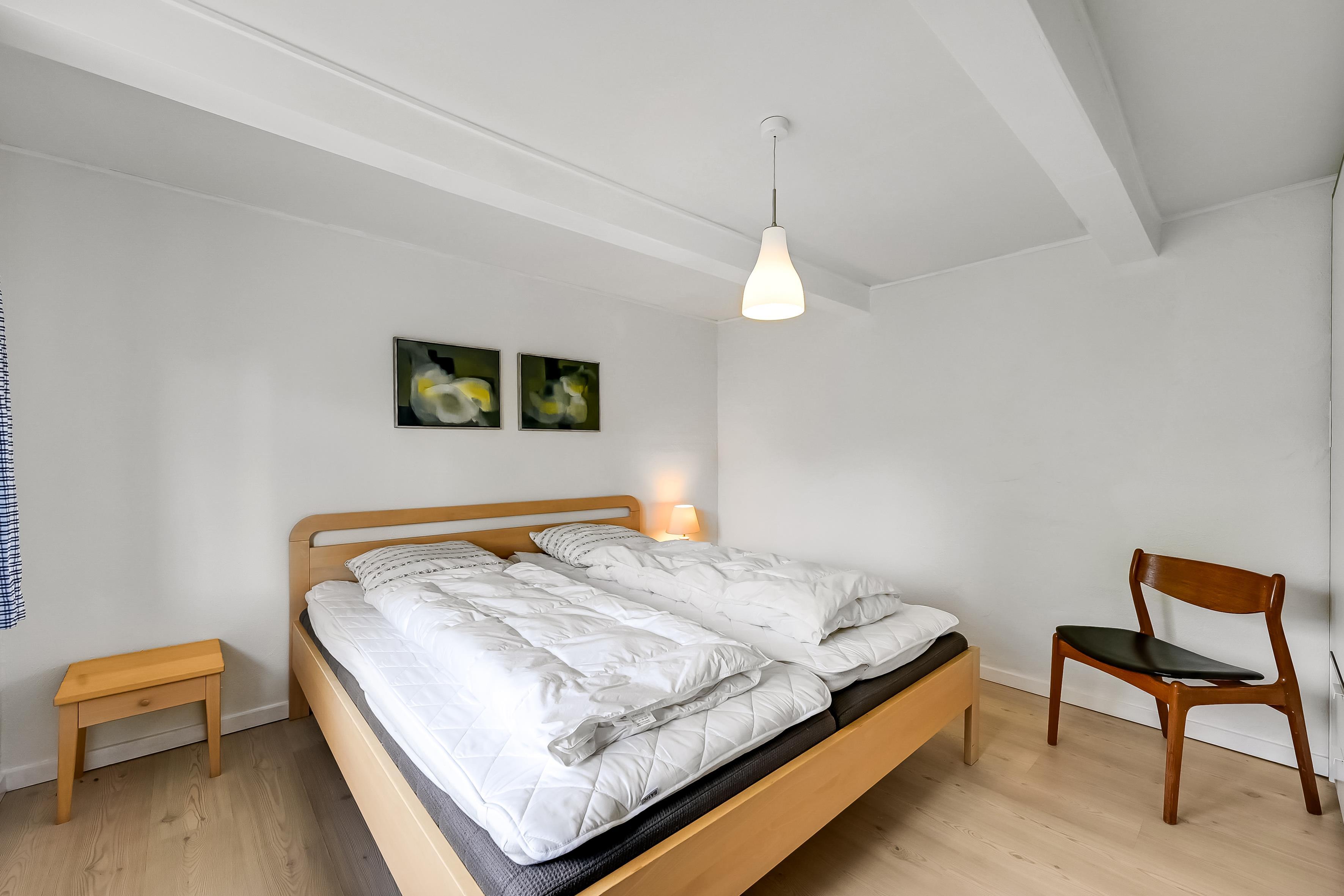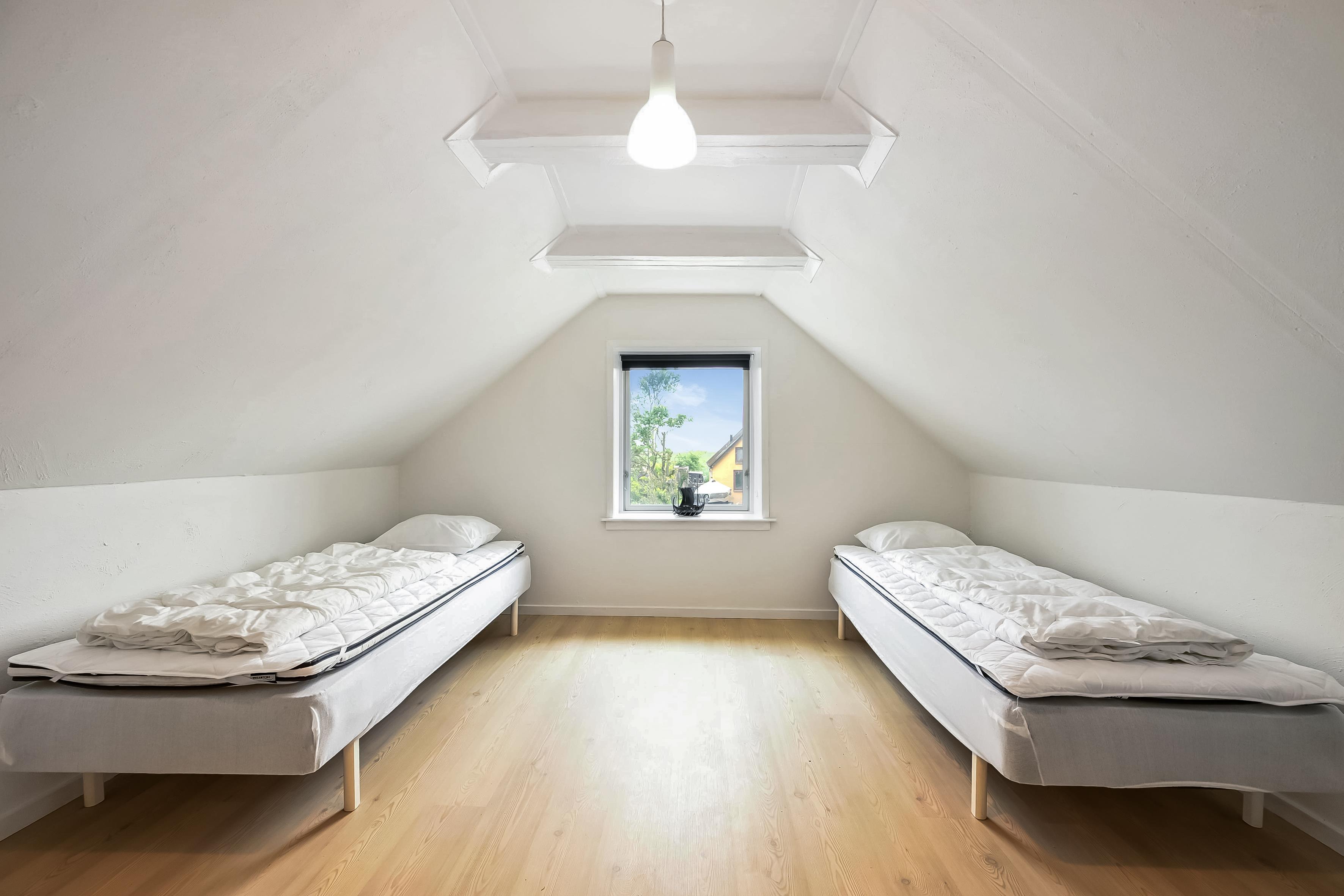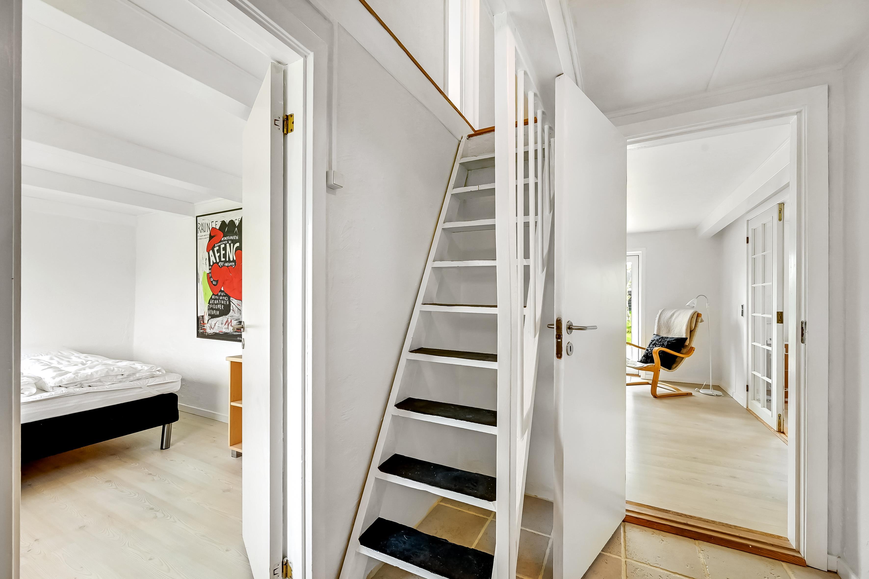 På første sal ligger det tredje soveværelse med to enkeltsenge. Trappen op er stejl, hvilket er værd at være opmærksom på.