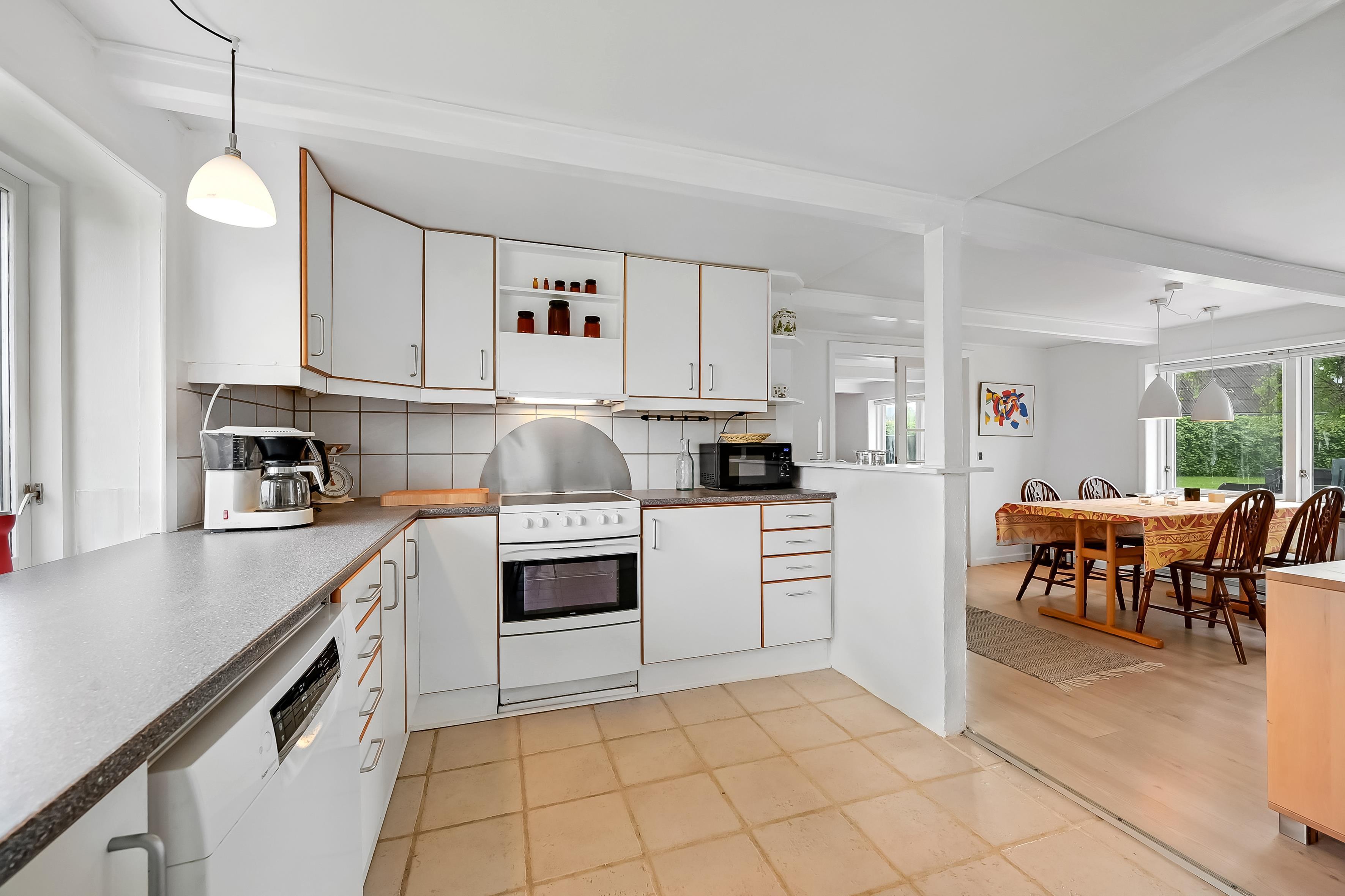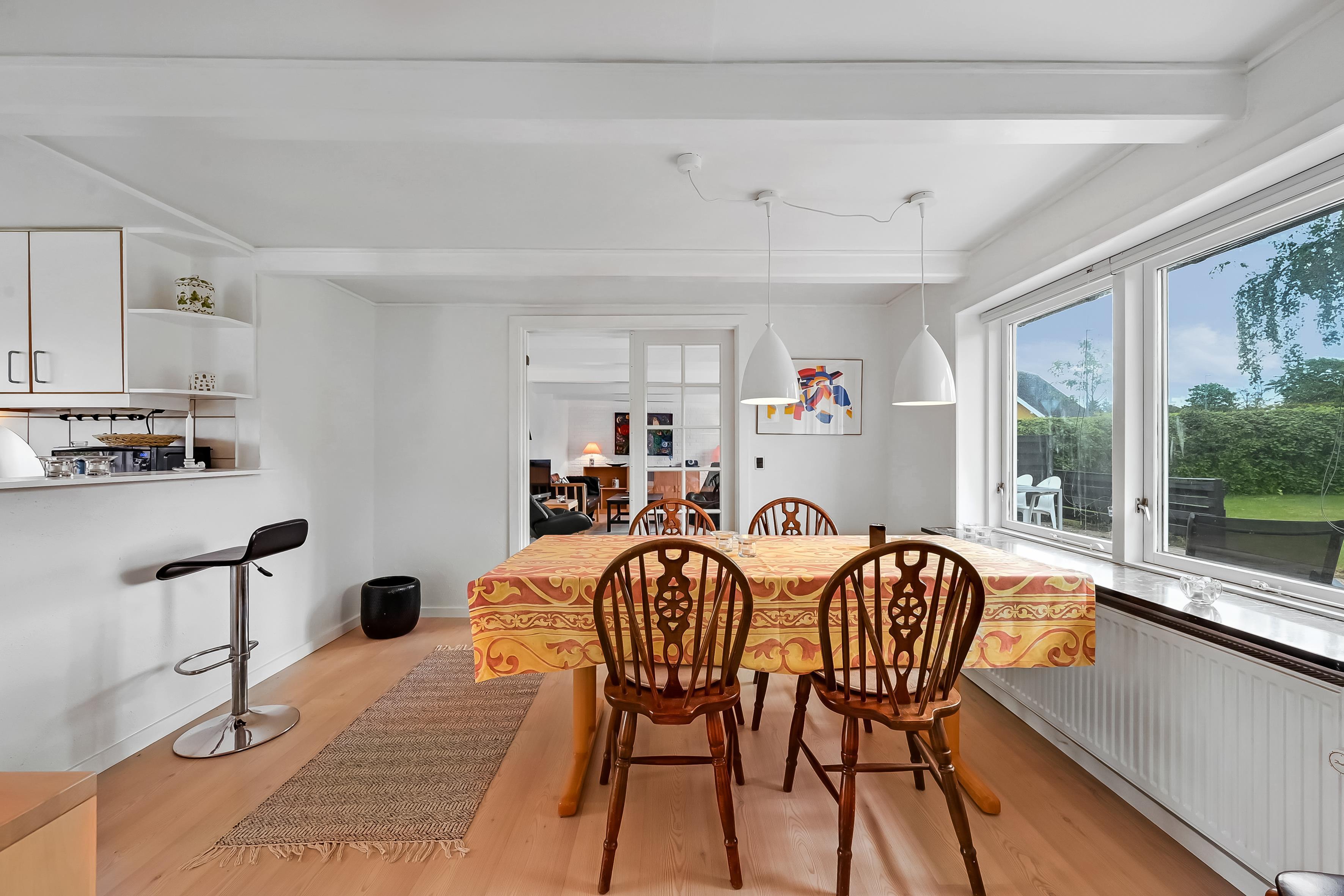 Sommerhuset er på 120 m² og fordeler sig på to etager. I stueplan finder du et åbent og lyst opholdsrum med stue og spisekøkken en suite. Køkkenet ligger for i forbindelse med spisestuen og er dejligt lyst og hyggeligt. Her er god plads til madlavning, spil og afslapning. Der er også to soveværelser i stueplan, begge med dobbeltsenge, og ét badeværelse med toilet og bruser.