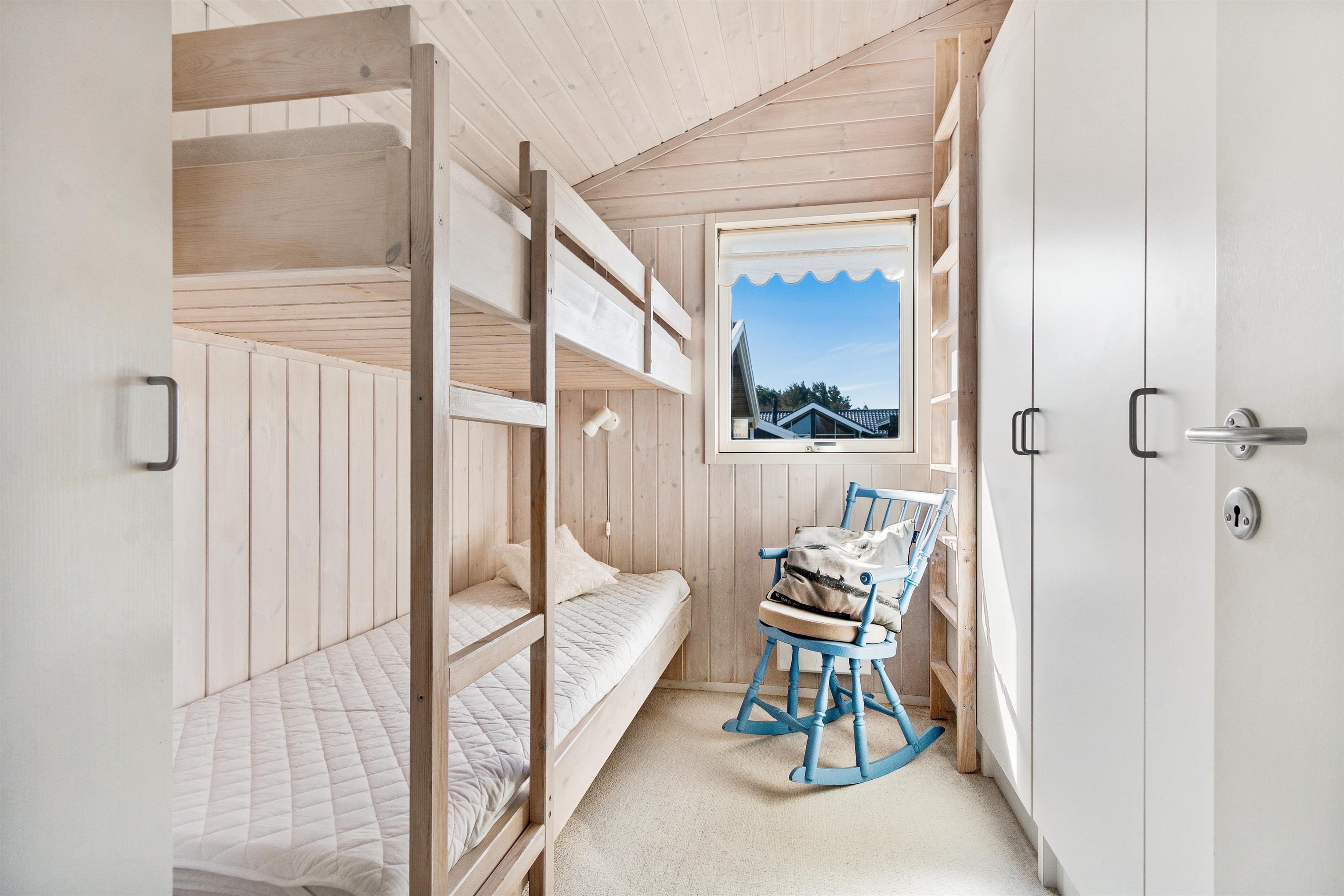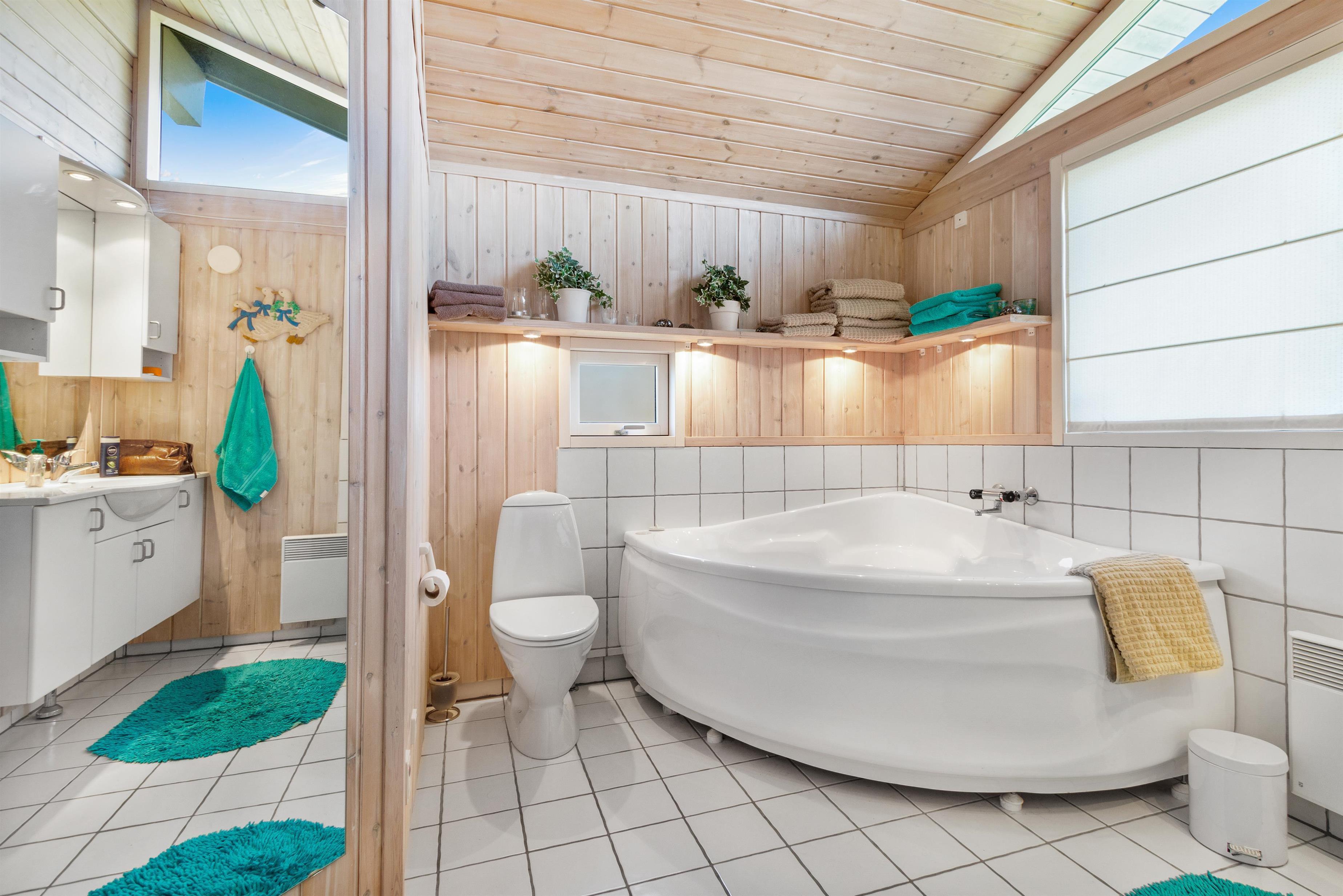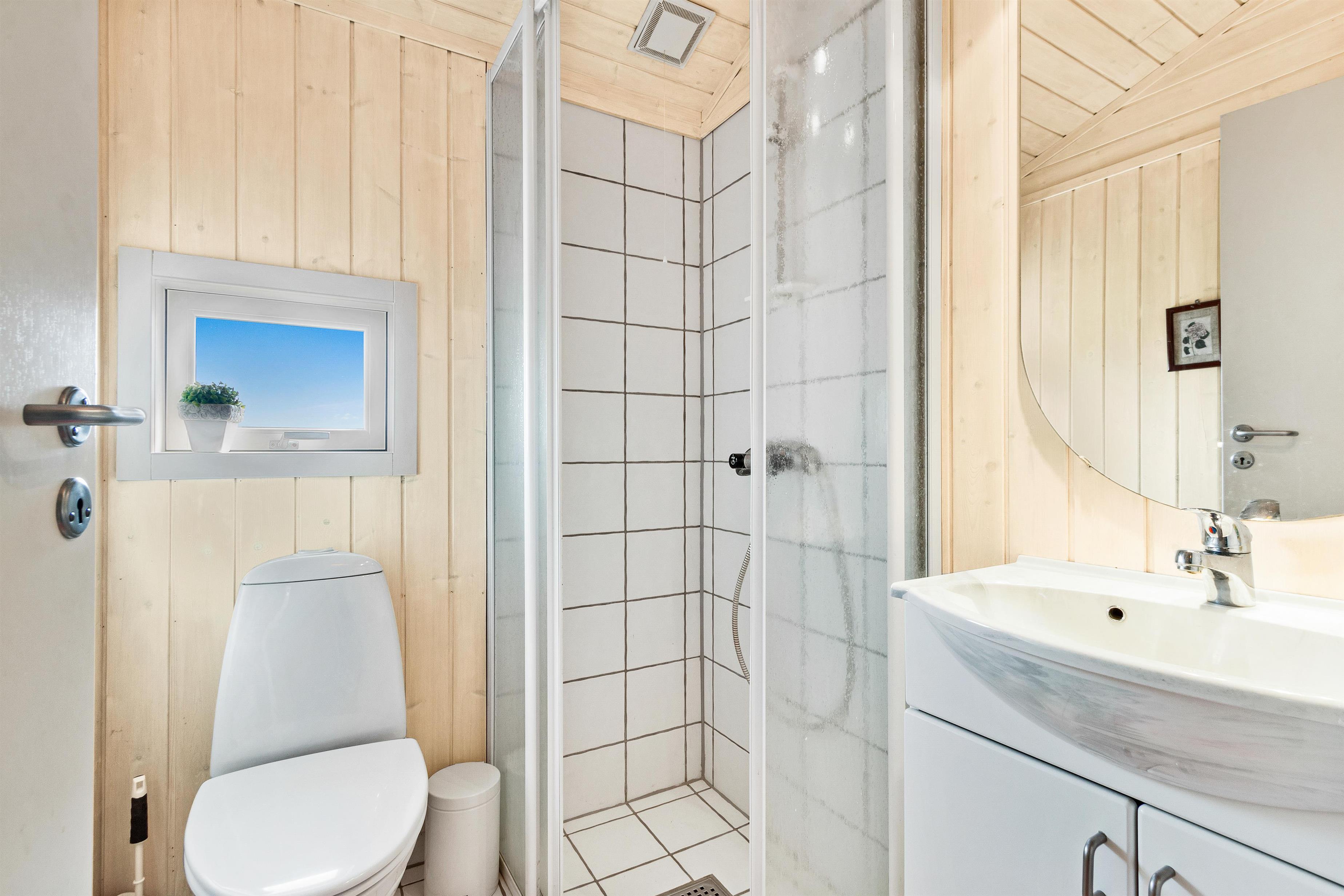 Sommerhuset er som nævnt på 91 kvadratmeter og i en rigtig flot stand. Her emmer af ægte feriestemning som i en traditionel feriebolig. Det er praktisk indrettet med bryggers og 5 sovepladser. Netop når man træder ind i huset, er der adgang til et dejligt badeværelse til venstre, som inkluderer en separat bruseniche og en spa. Fortsætter man lige ud, vil man komme ind i det andet badeværelse. Der er tre soverum og to badeværelser - praktisk indrettet med god plads til 7 personer. Dejlig åbent køkken/alrum/stue med brændeovn og et bryggers med vaskemaskine og tørretumbler. OBS. terrassen er blevet åbnet siden billederne blev taget. Ferieboligen er røgfri og ungdomsgrupper er ikke tilladt.