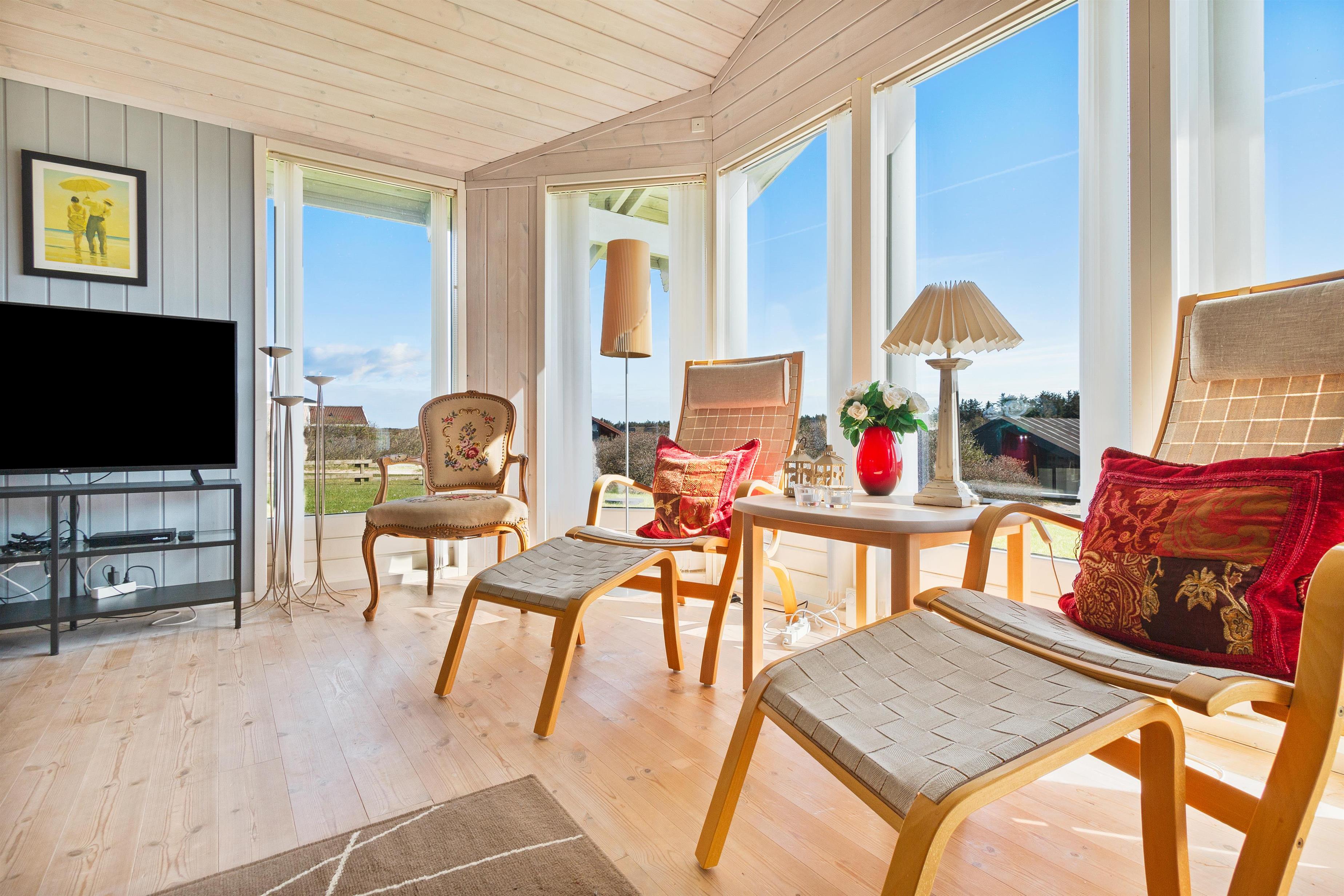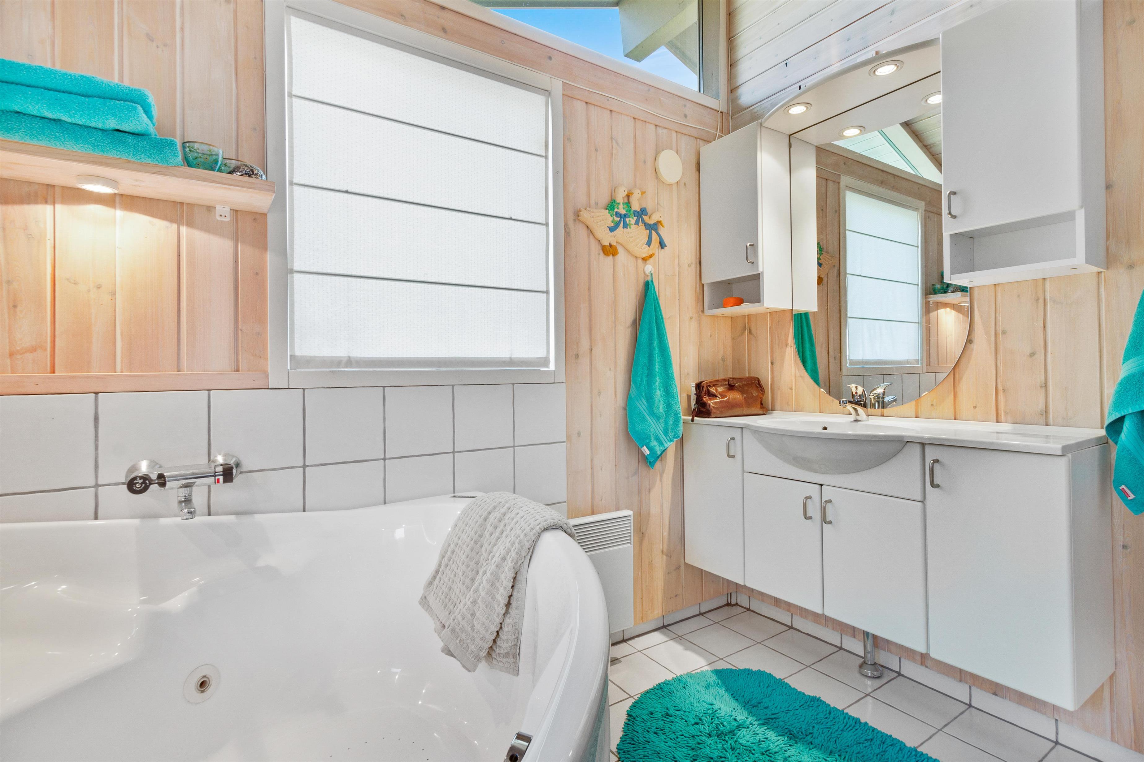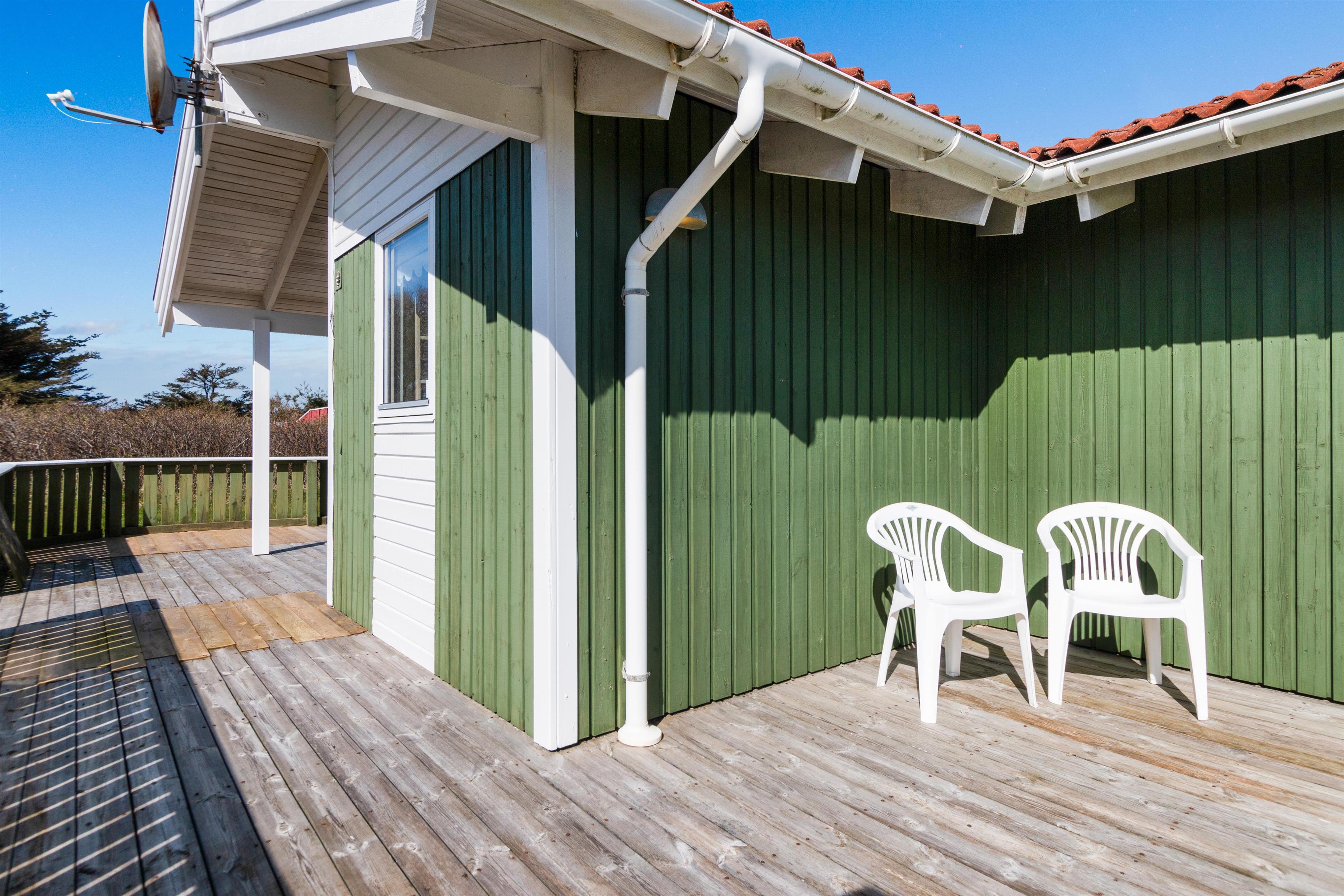 Sommerhuset er som nævnt på 91 kvadratmeter og i en rigtig flot stand. Her emmer af ægte feriestemning som i en traditionel feriebolig. Det er praktisk indrettet med bryggers og 5 sovepladser. Netop når man træder ind i huset, er der adgang til et dejligt badeværelse til venstre, som inkluderer en separat bruseniche og en spa. Fortsætter man lige ud, vil man komme ind i det andet badeværelse. Der er tre soverum og to badeværelser - praktisk indrettet med god plads til 7 personer. Dejlig åbent køkken/alrum/stue med brændeovn og et bryggers med vaskemaskine og tørretumbler. OBS. terrassen er blevet åbnet siden billederne blev taget. Ferieboligen er røgfri og ungdomsgrupper er ikke tilladt.