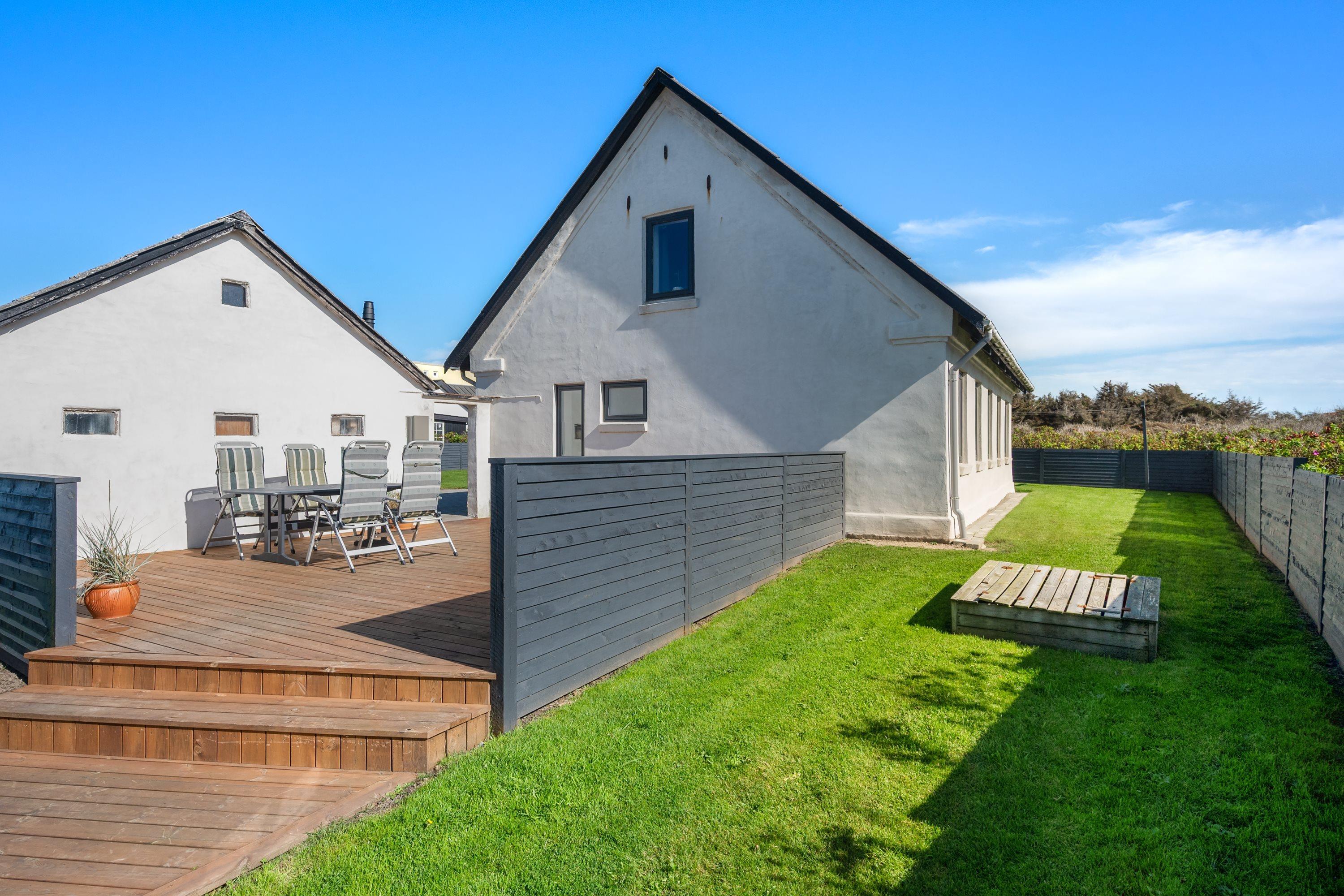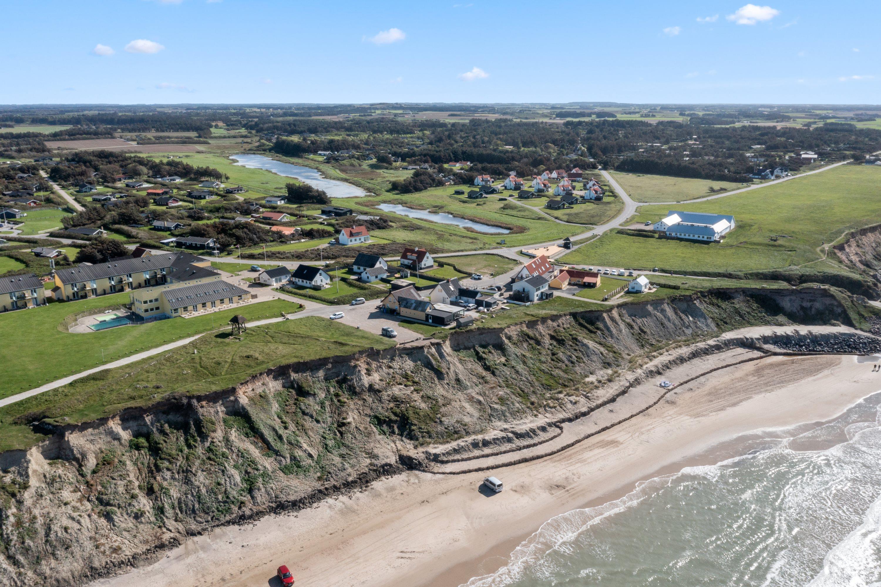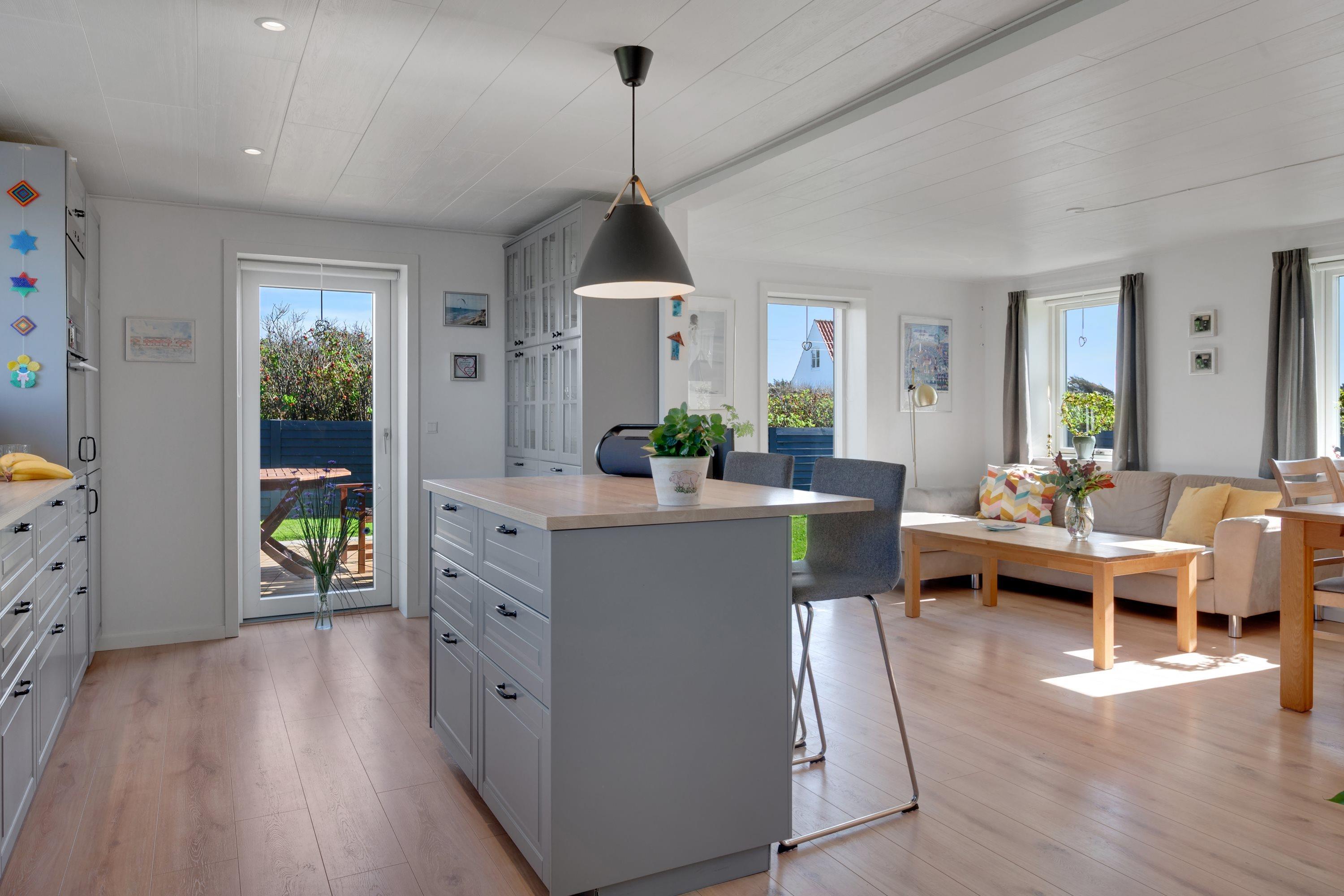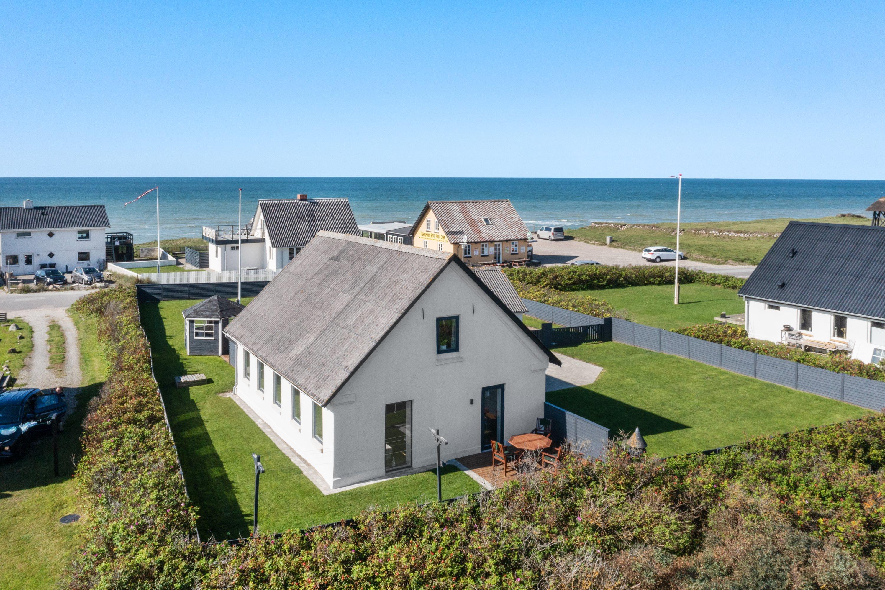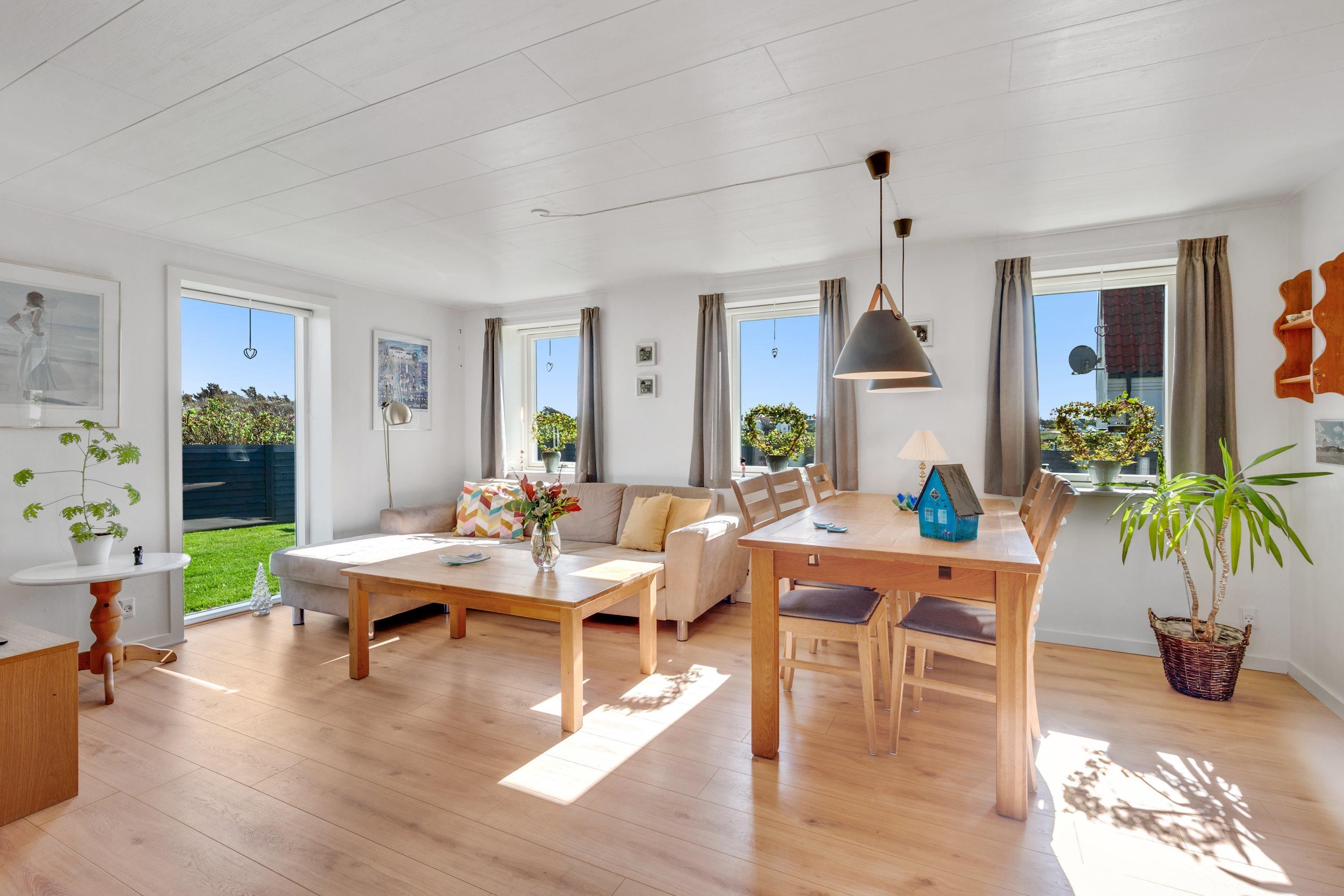 Udendørsområde: Selve grunden er på 906 kvadratmeter og har købmanden og grillbaren som genboer, og naturen som ramme med en klar udsigt til Vesterhavet. Her er skønne terrasser, og huset er omgivet af en dejlig plæne, der kan lukkes af, hvis man har sin firbenede ven med på ferie. Der er altså rig mulighed for at finde læ for vestenvinden, når den viser sine muskler. I Nørre Lyngby er der masser af rå natur og mange muligheder for gå- eller vandreture. Det populære Rubjerg Knude Fyr ligger i nærheden, og der er ti minutters kørsel til hhv. Løkken og Lønstrup, hvor der er rige muligheder for oplevelser af mangfoldig karakter.