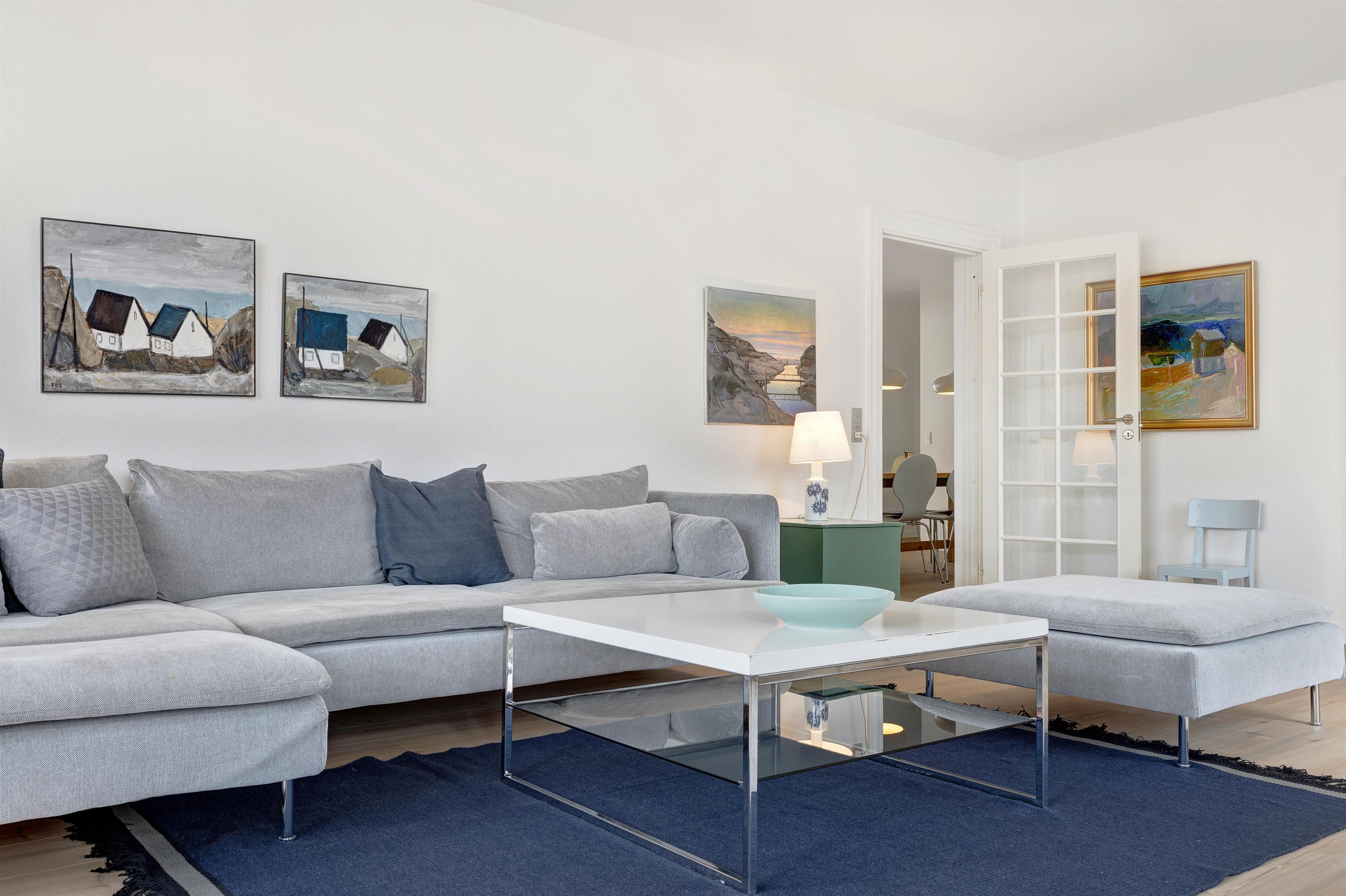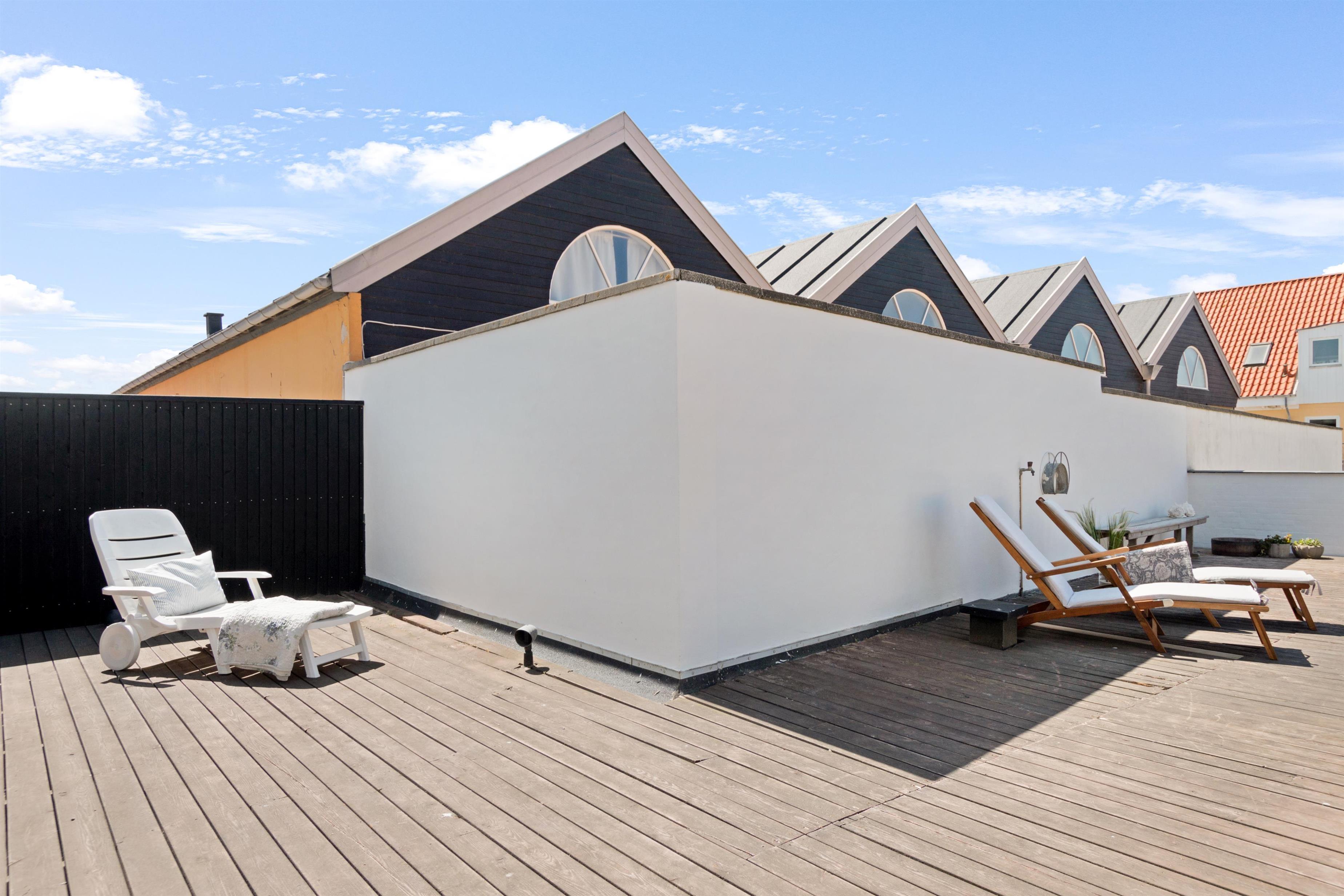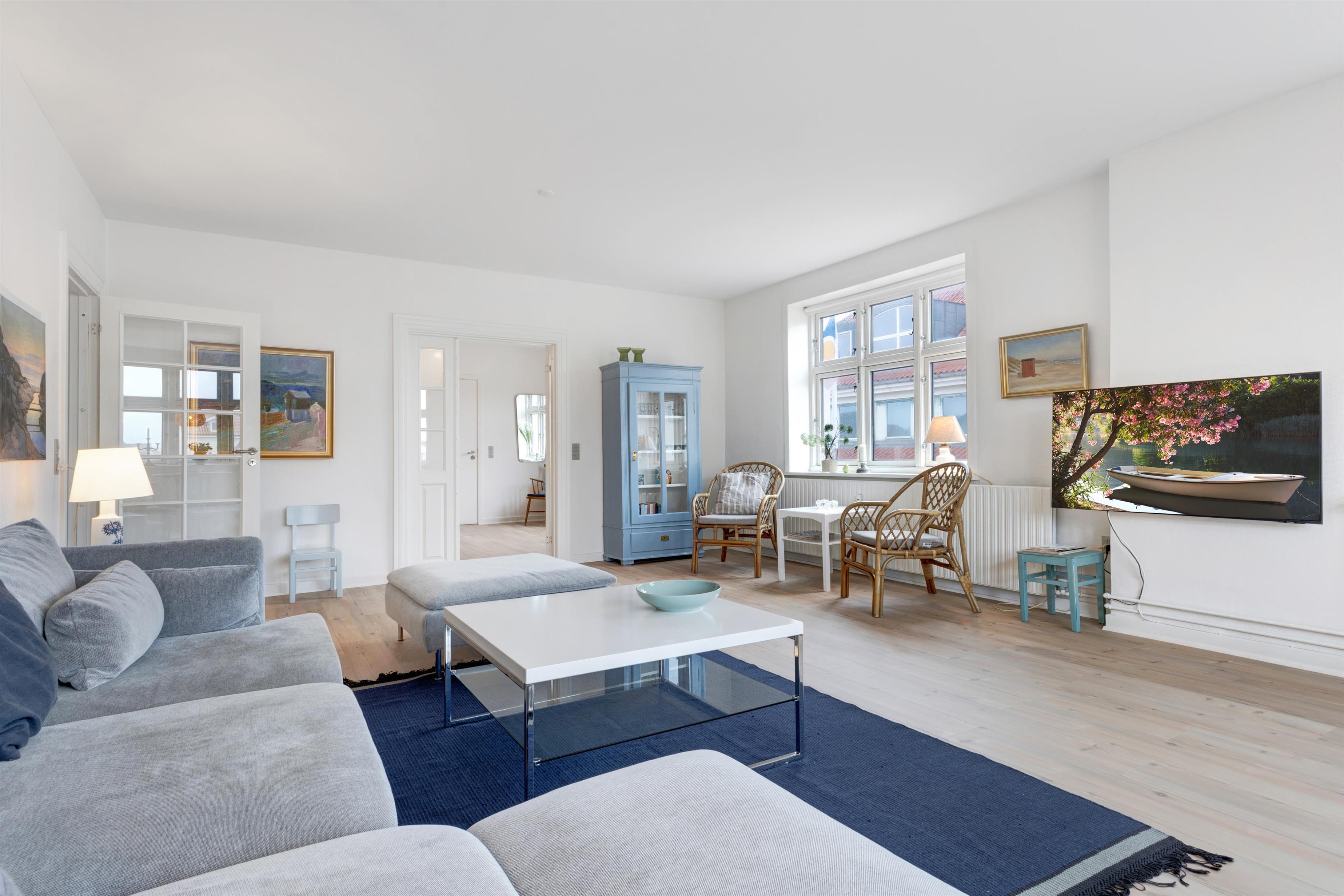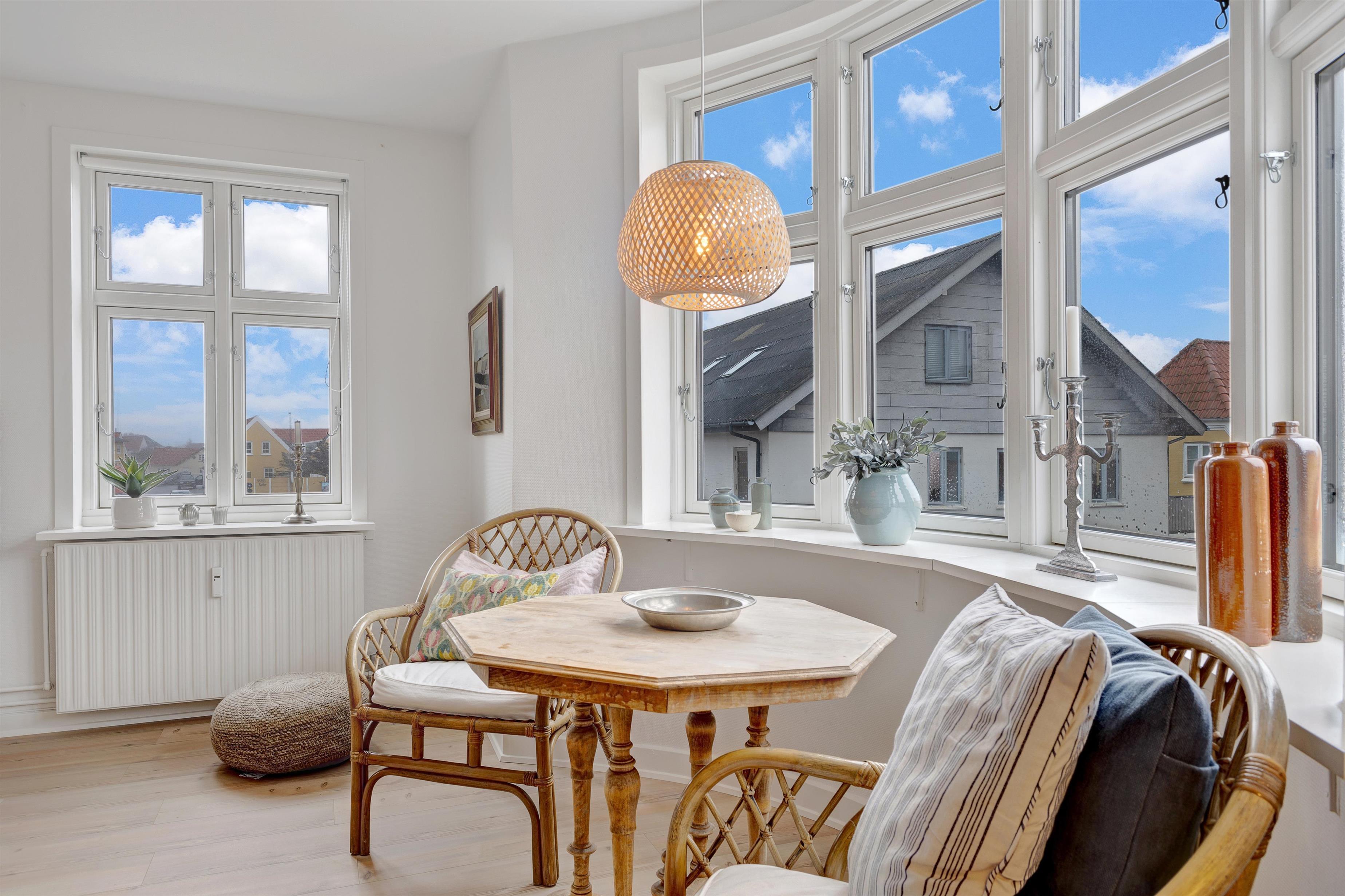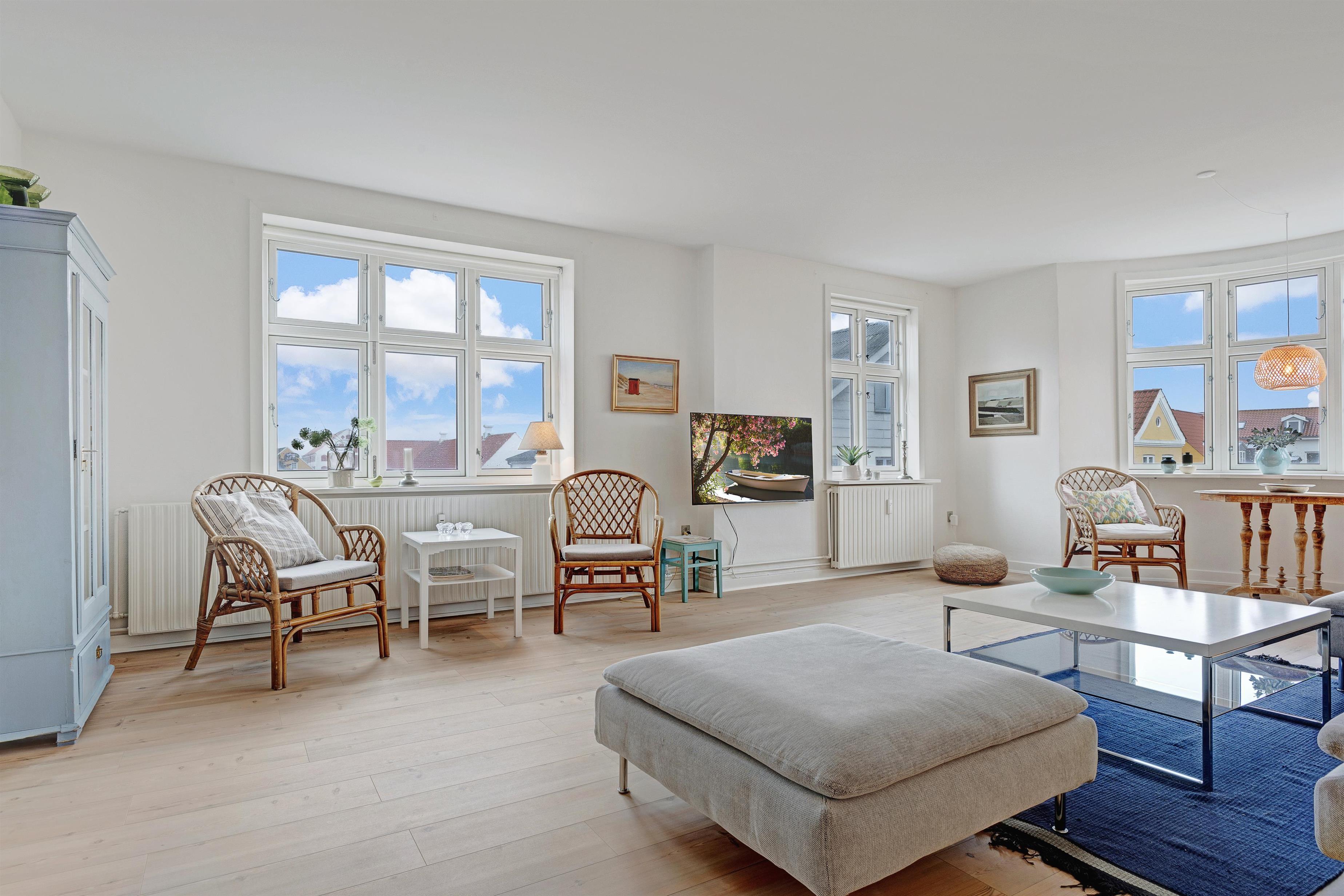 I denne skønne ferielejlighed er der fire store “fællesrum”; Køkken og stue en suite samt den dejlige udestue og den kæmpe terrasse. Derfra kan I fordele jer på et af ferielejlighedens fire værelser samt gennemgangsværelse - alle rum med to sovepladser i hver. Der er gæstetoilet og dertil badeværelse med toilet. De to værelser samt gennemgangsværelset ligger privat fra resten af lejligheden, hvis man lukker døren bag sig. Der er to trin ned, og det forskudte plan giver en dejlig fornemmelse af at træde lidt ind for sig selv, også selvom hyggen fortsætter i køkkenet, stuen, udestuen eller på terrassen. Køkkenet, toilettet og badeværelset er spritnye og det samme er gulvene, mens resten af huset er gennemrenoveret fra a-z. Du tilgår lejligheden ved at køre ind bag gågaden, og ind i bygningens baggård, hvorfra du skal op af den udendørs bagtrappe og herfra entrerer du lejligheden fra den dejlige terrasse. Ferieboligen er røgfri og ungdomsgrupper er ikke tilladt.