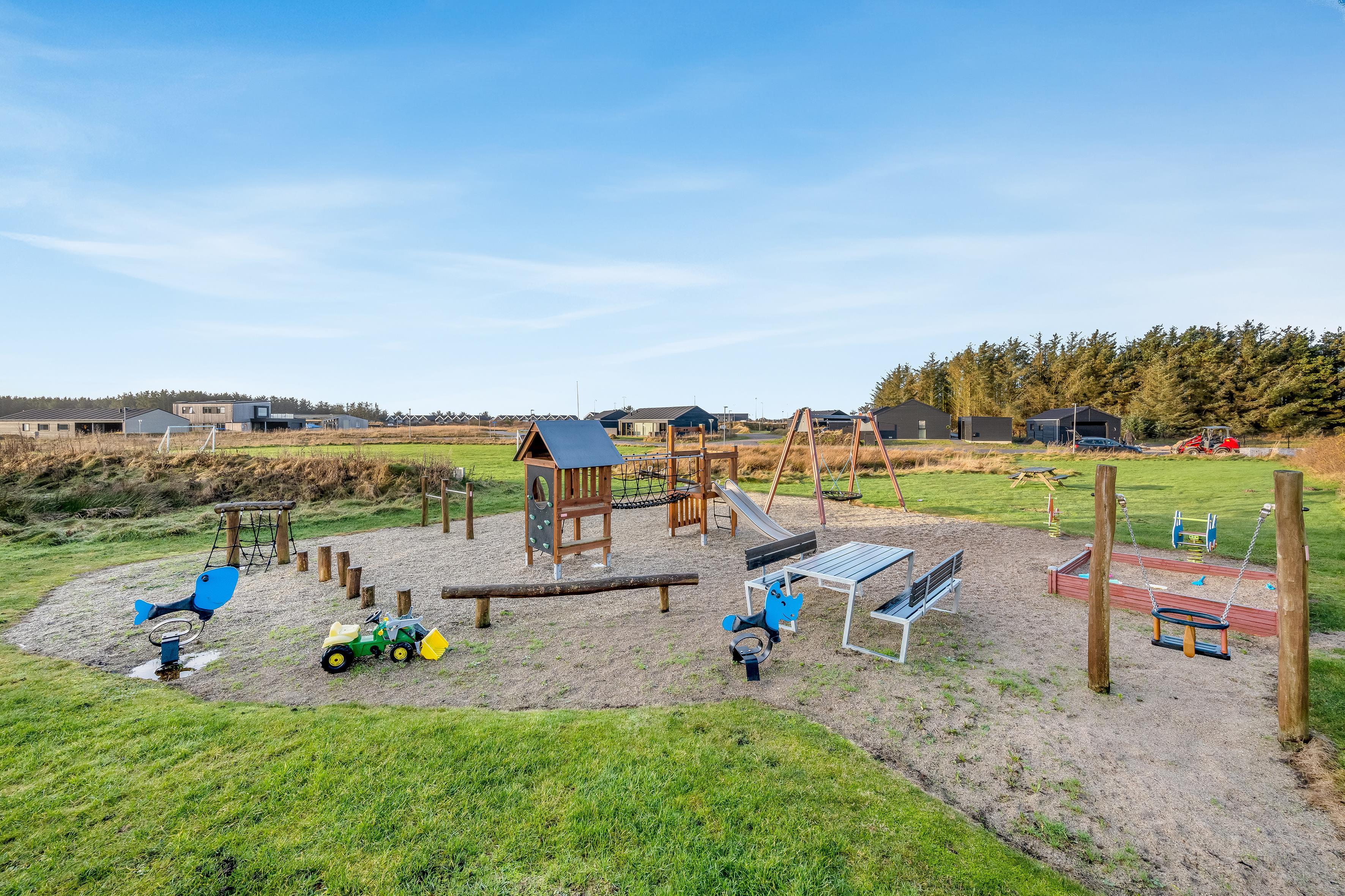 Haven og terrassen inviterer til både afslapning og aktivitet – uanset tidspunktet på dagen. Med flere terrasser, herunder en overdækket del, er det let at finde læ og sol. Der er god plads til leg og hygge, og fra huset er der kort afstand til både strand, by og indkøb – alt ligger inden for cirka en kilometer.