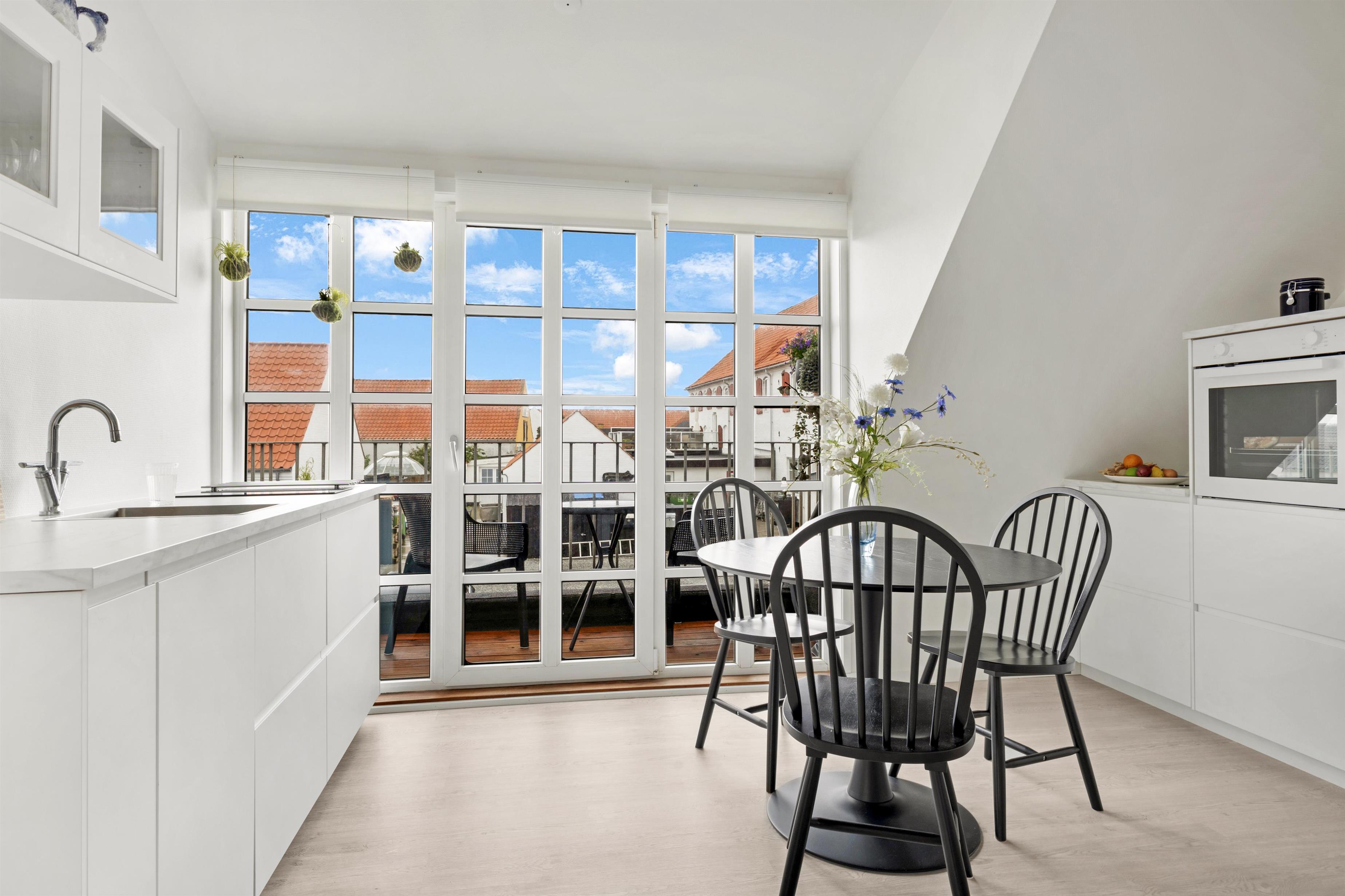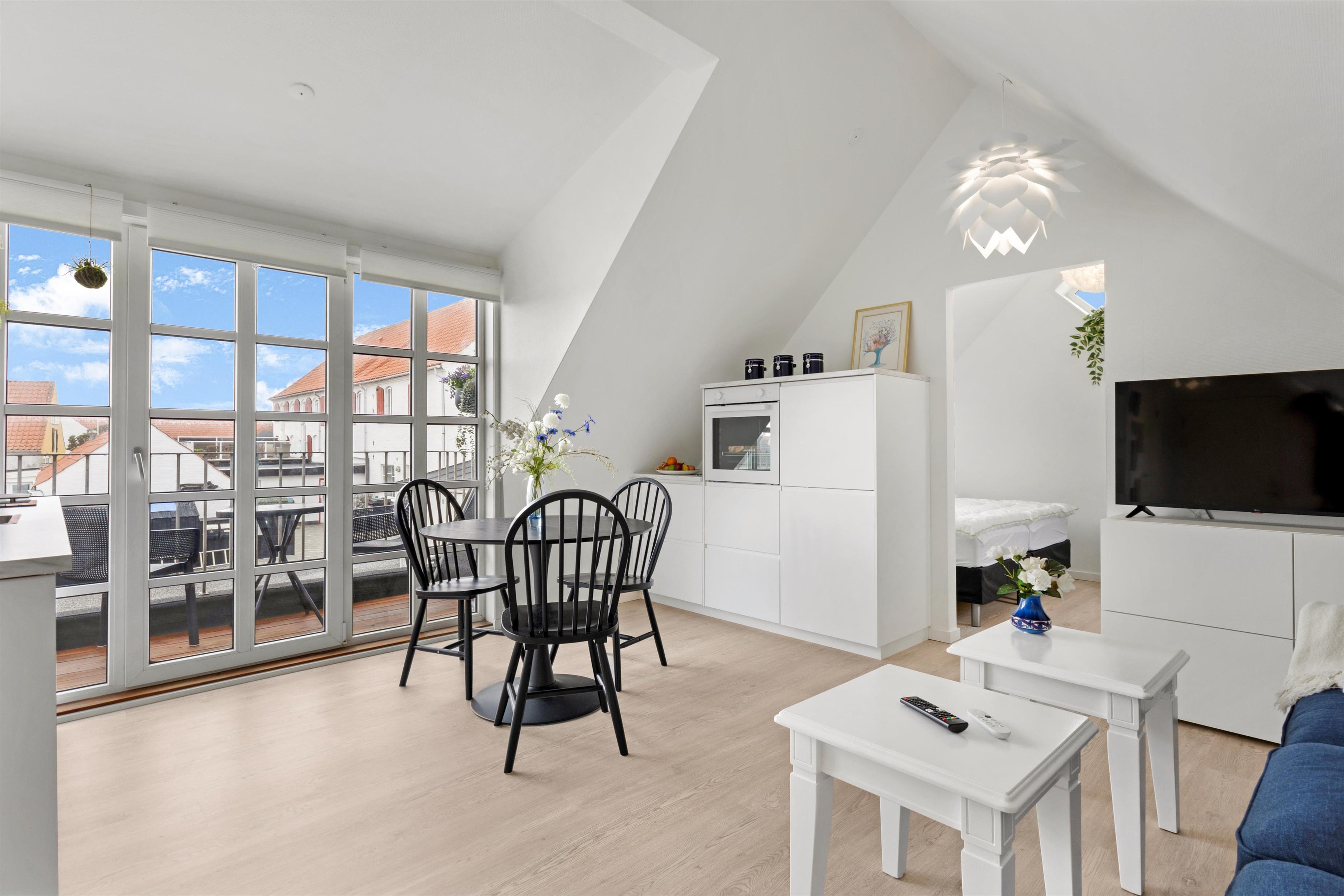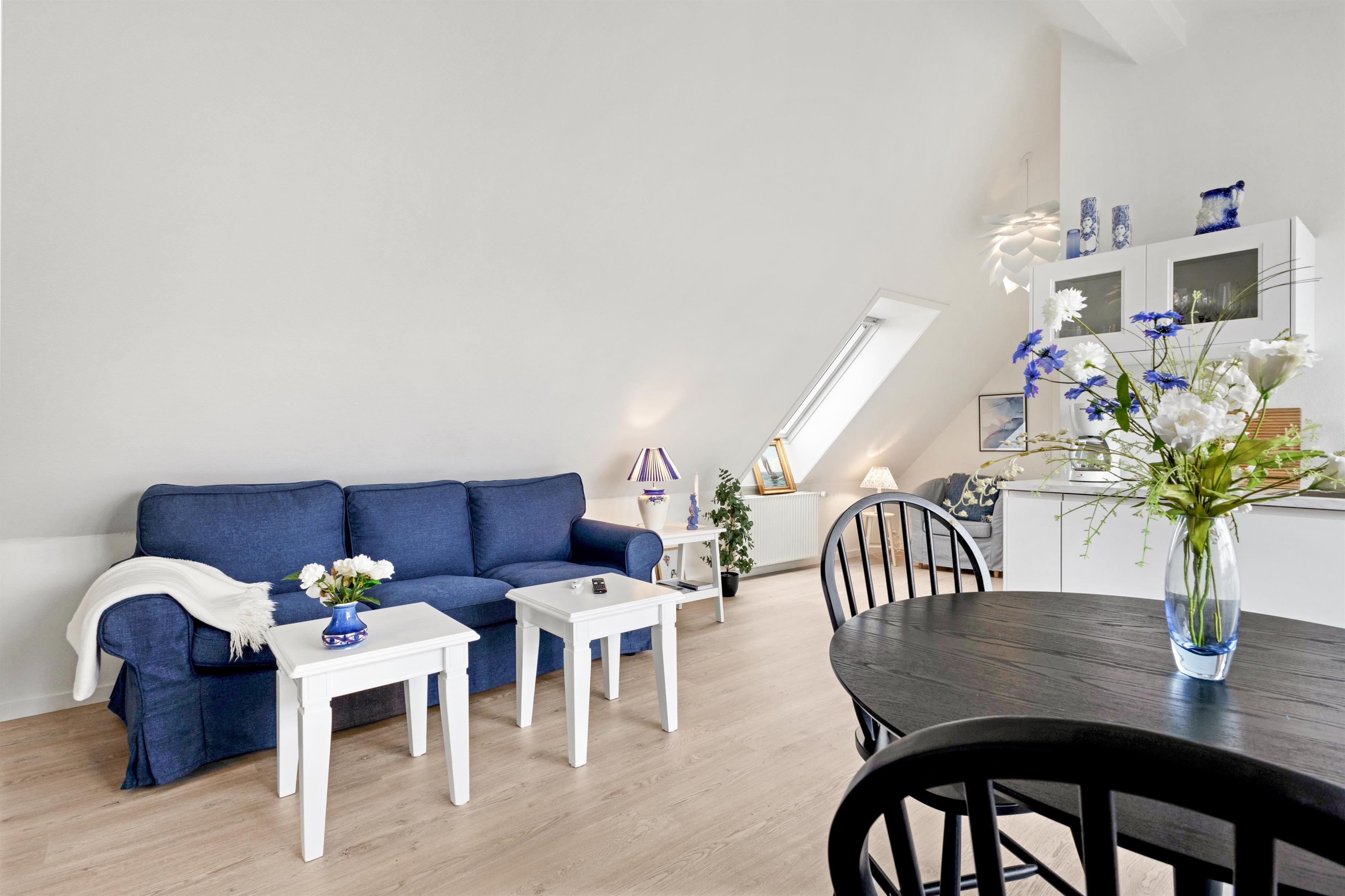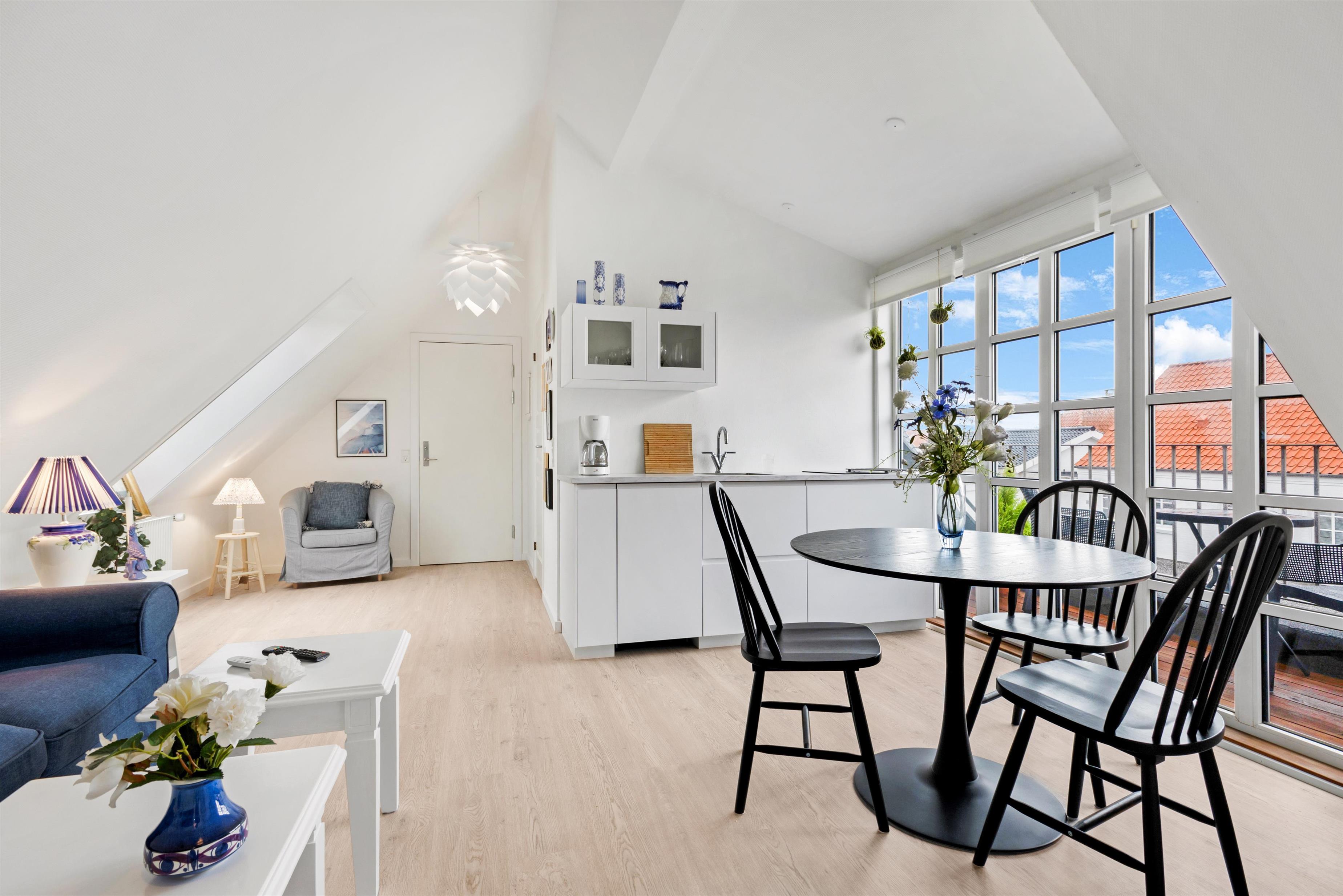 Køkkenet er åbent og lyst, og herfra tilgår du altanen. Stuen er i åben forbindelse til køkkenet, og med de skrå vægge er lejligheden super hyggelig, alt imens den er nyistandsat.