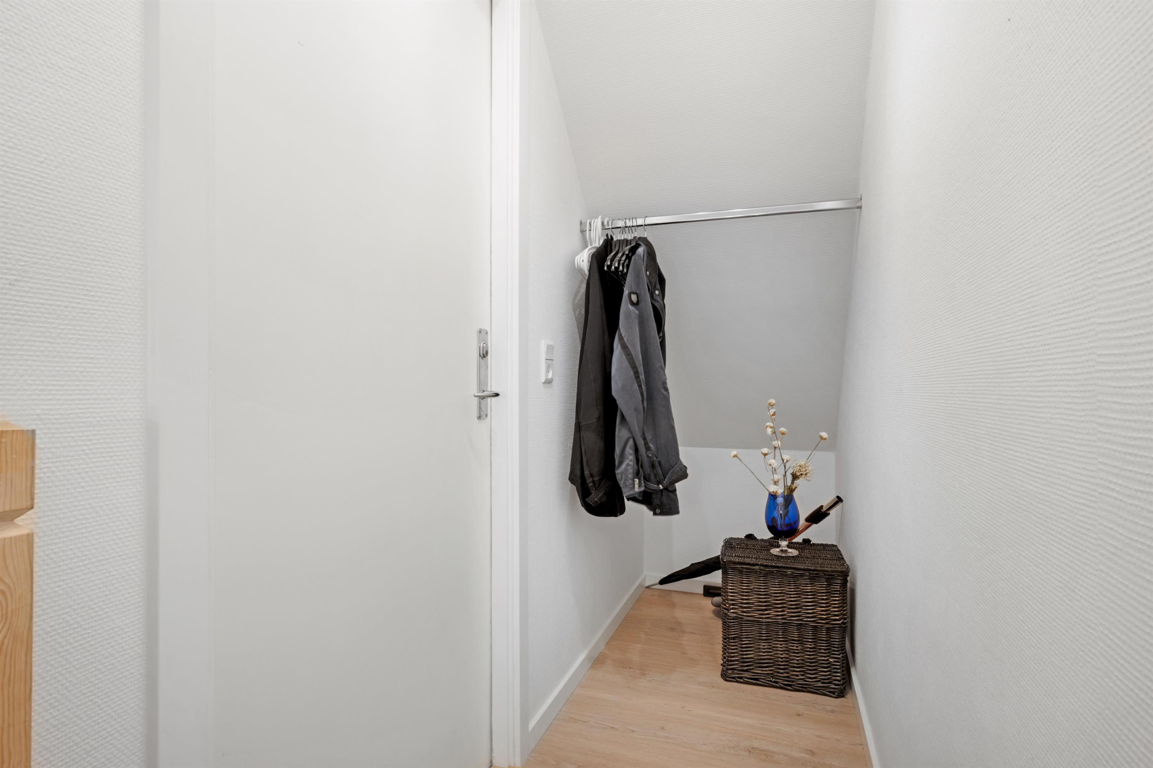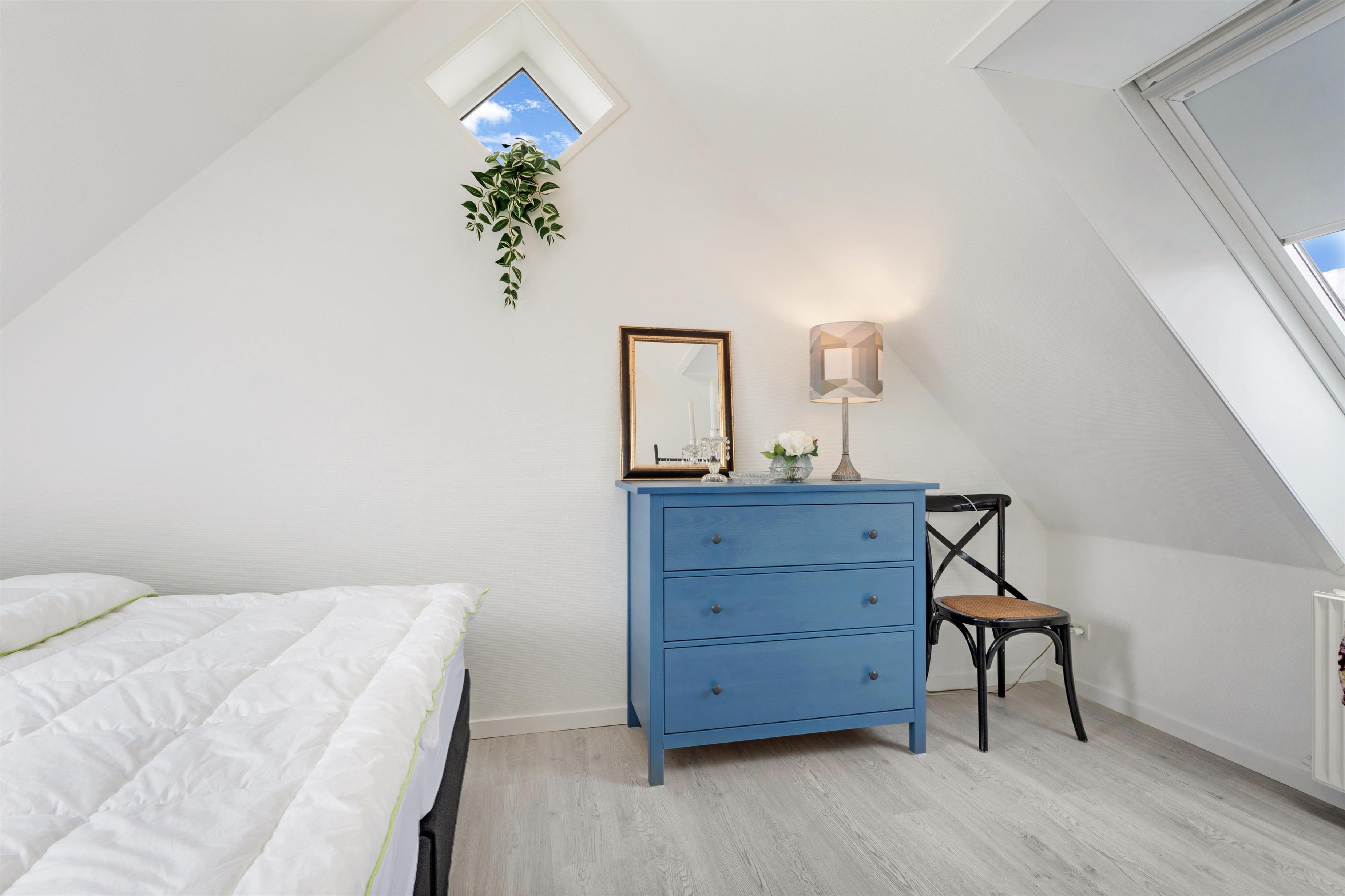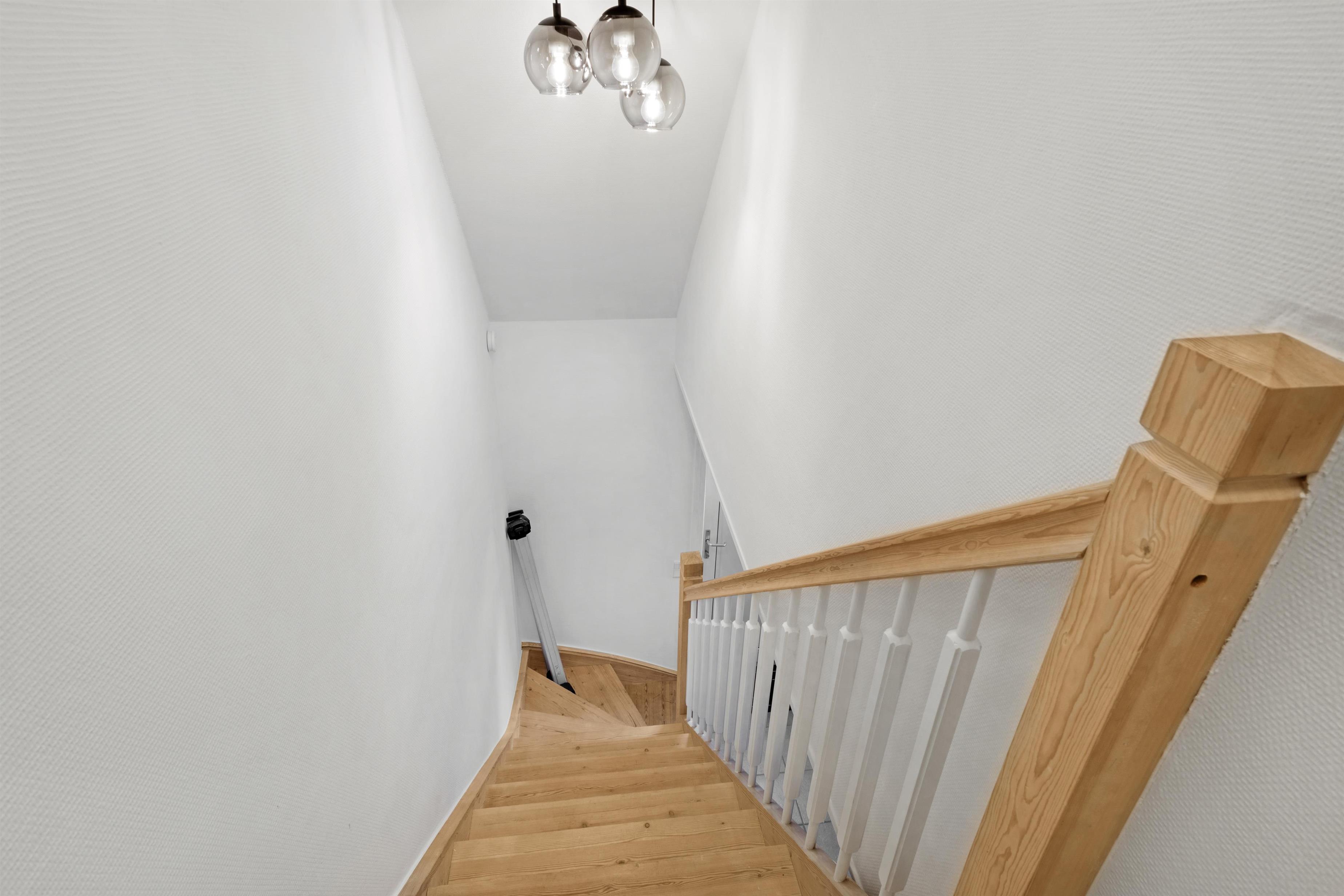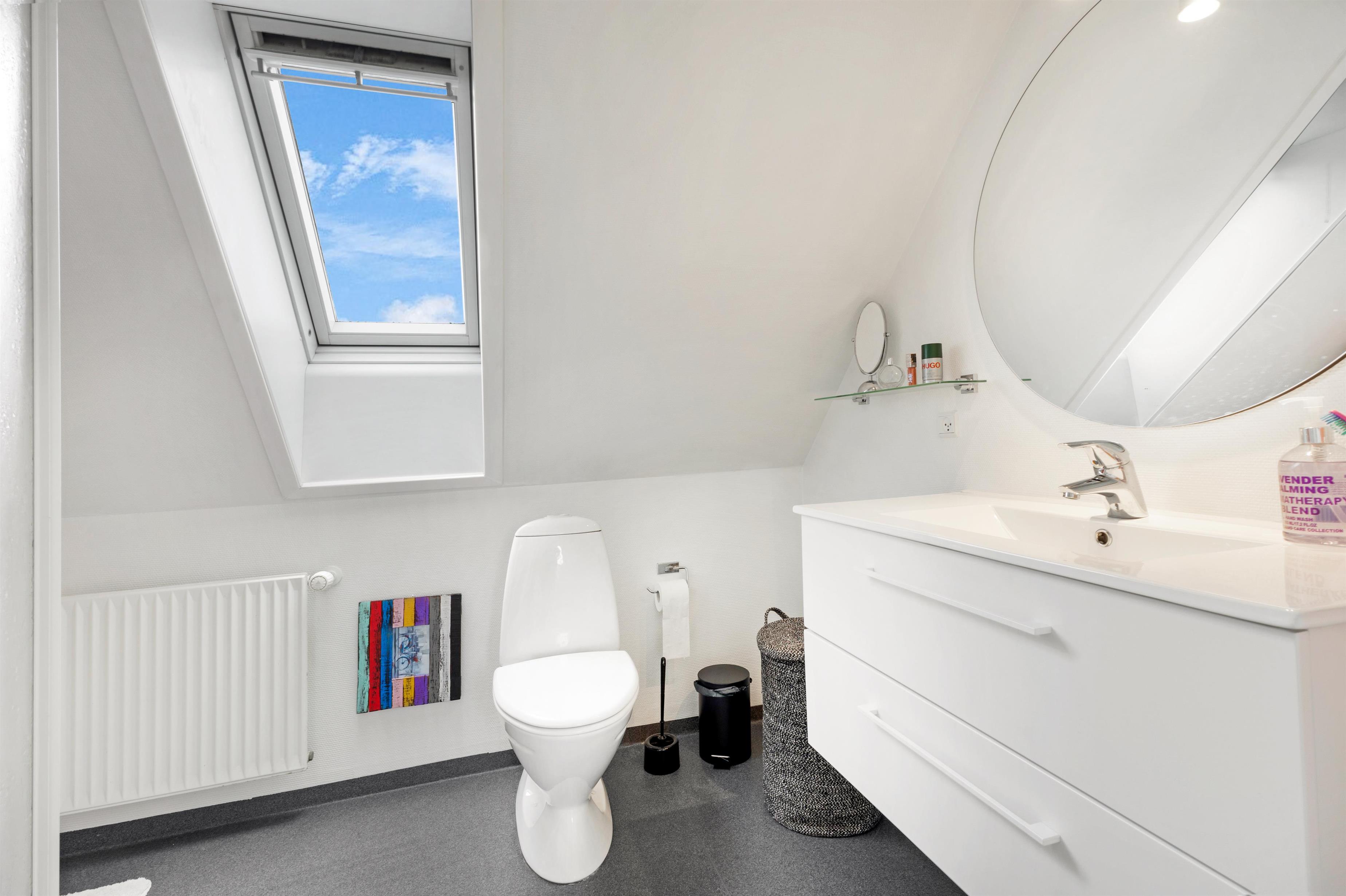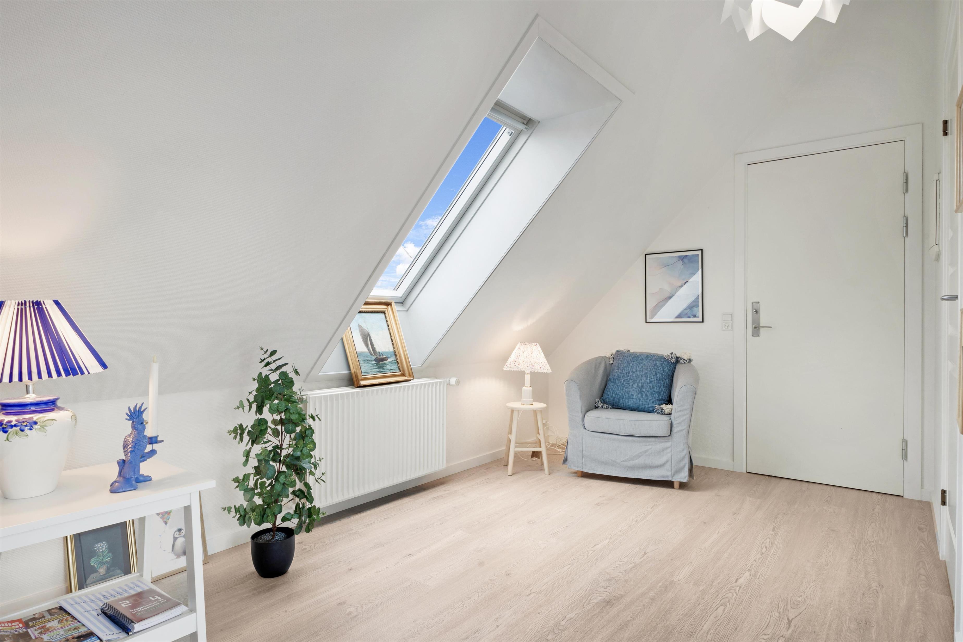 Køkkenet er åbent og lyst, og herfra tilgår du altanen. Stuen er i åben forbindelse til køkkenet, og med de skrå vægge er lejligheden super hyggelig, alt imens den er nyistandsat.