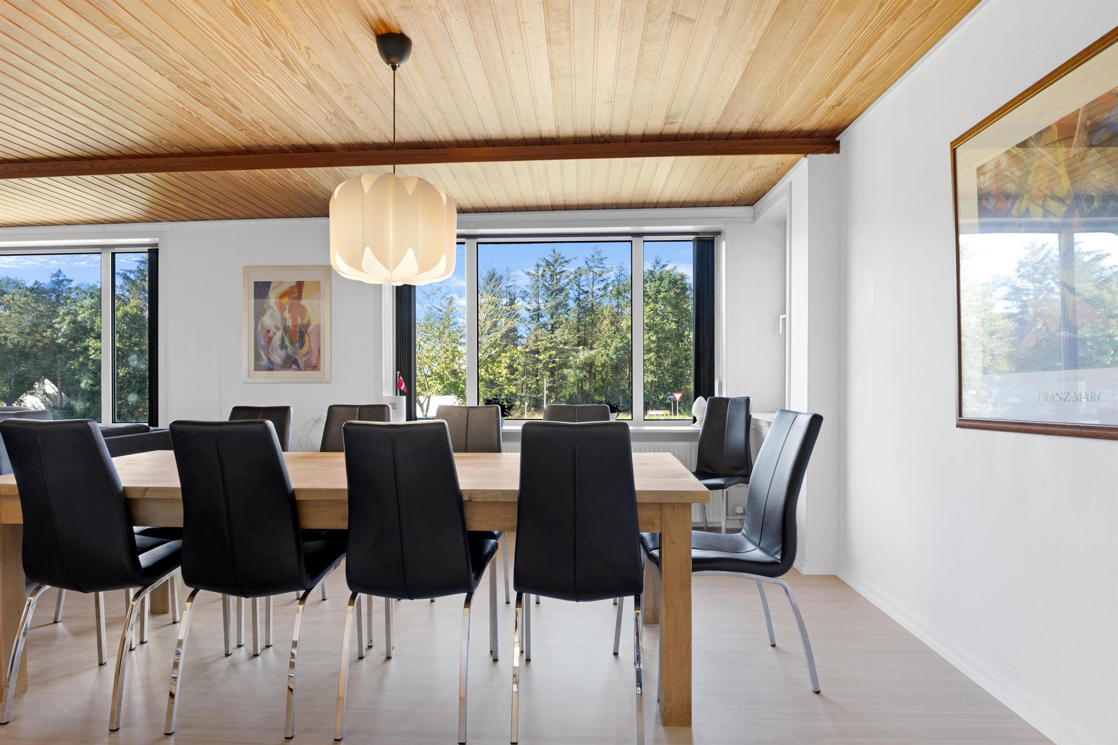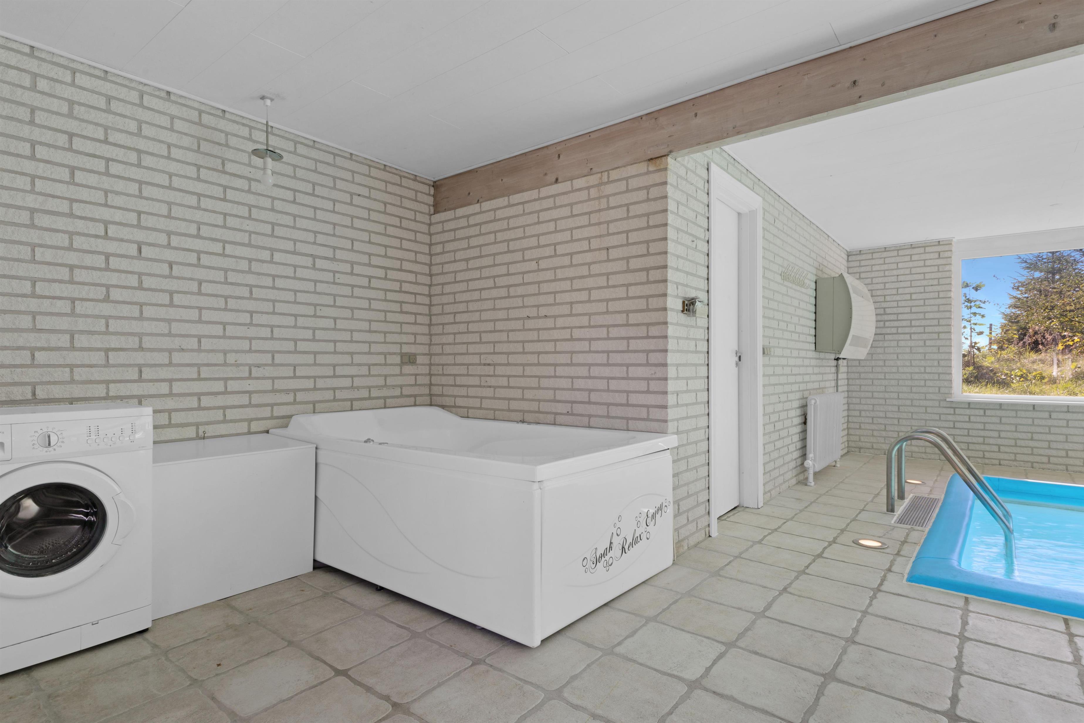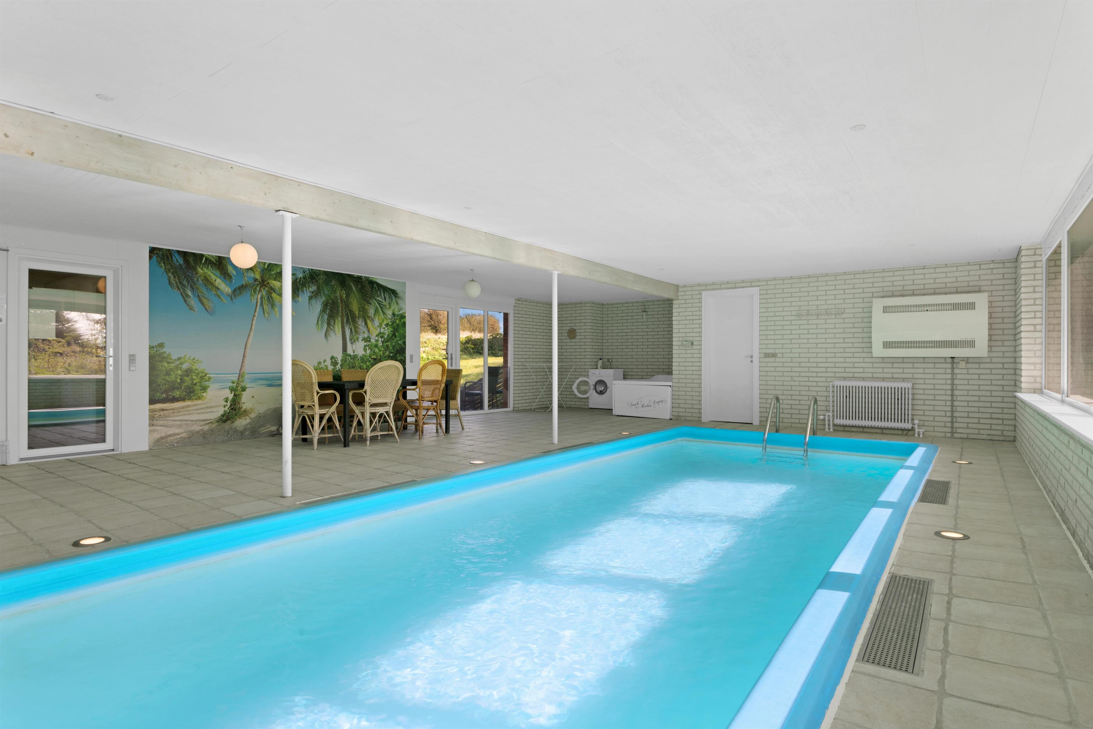 Dette store sommerhus med pool, spa og sauna rummer plads til 12 personer, fordelt på husets to etager. Stueetagen udgør poolområde med spa, sauna og badeværelse, køkken, toilet og et stort fællesrum med plads til spisning og hygge samt soverum. På første sal findes soverum og badeværelse samt en udestue. Huset er ikke et moderne og minimalistisk hus, men et super hyggeligt hus, hvor den store pool vitterligt er husets kerne!