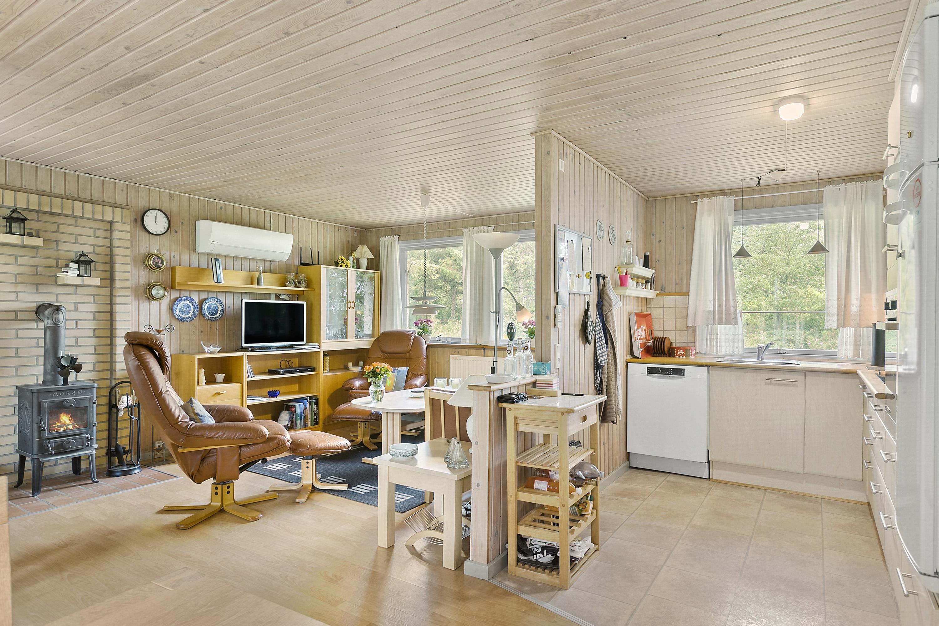 Dette velholdte og klassiske sommerhus er på 75 kvadratmeter, der byder på 3 soverum, stort badeværelse med bruseniche, spa og sauna, åbent køkken/alrum og rigtig hyggelig pejsestue. Der er to skure og en carport til bilen. Huset er som nævnt et helt klassisk sommerhus og det er i god stand. I alle tre værelser er der god skabsplads - det ene værelse er af mindre størrelse. Fra stuen er der adgang til den dejlige terrasse, hvor du kan nyde timer i solen, når vejret viser sig fra sin bedste side, og ellers kan du trække indenfor i den skønne pejsestue, der er åben forbindelse til husets køkken/alrum.