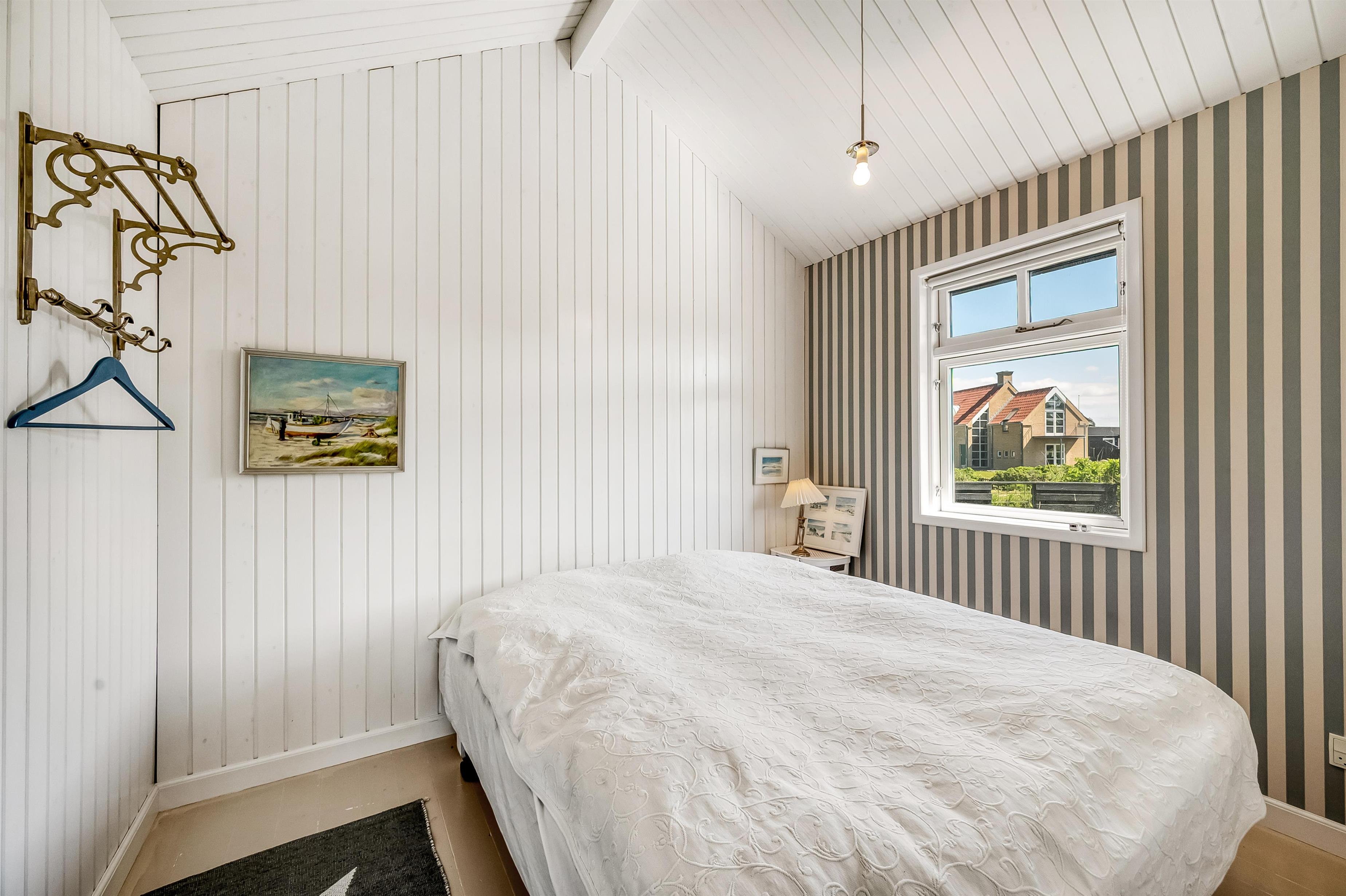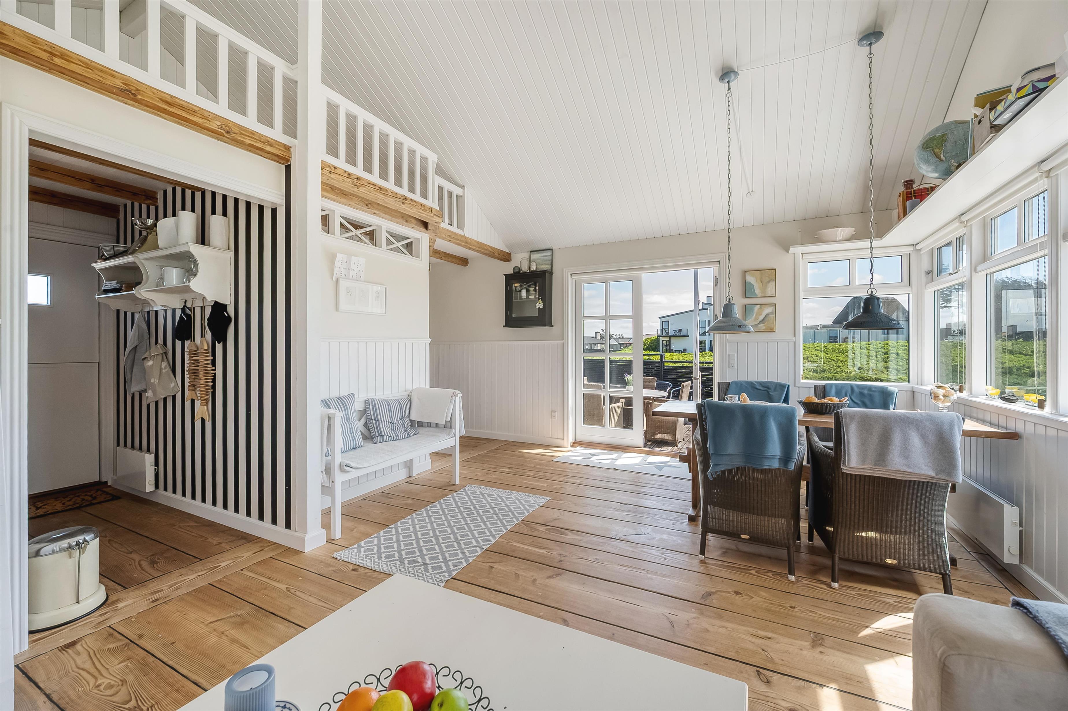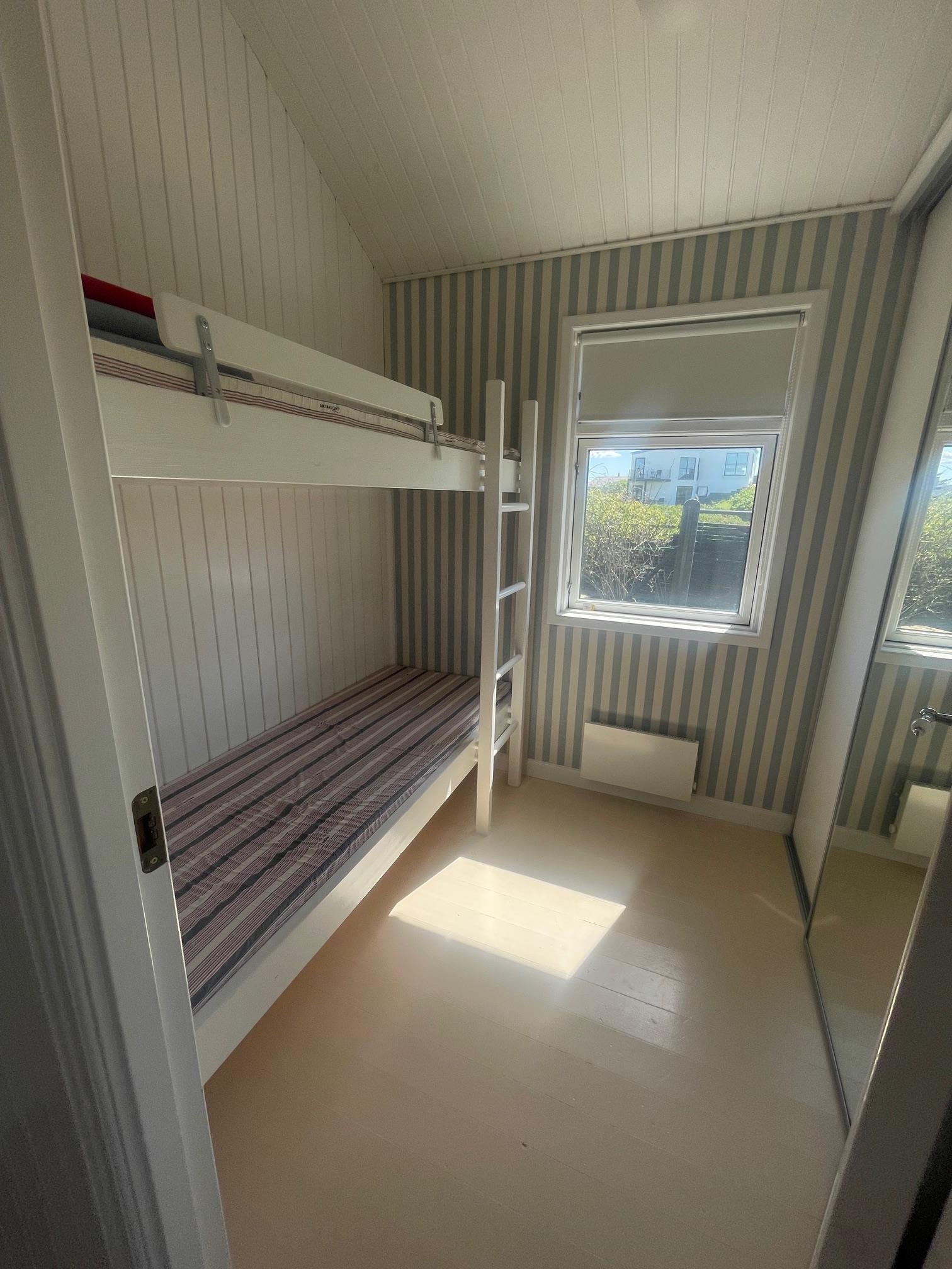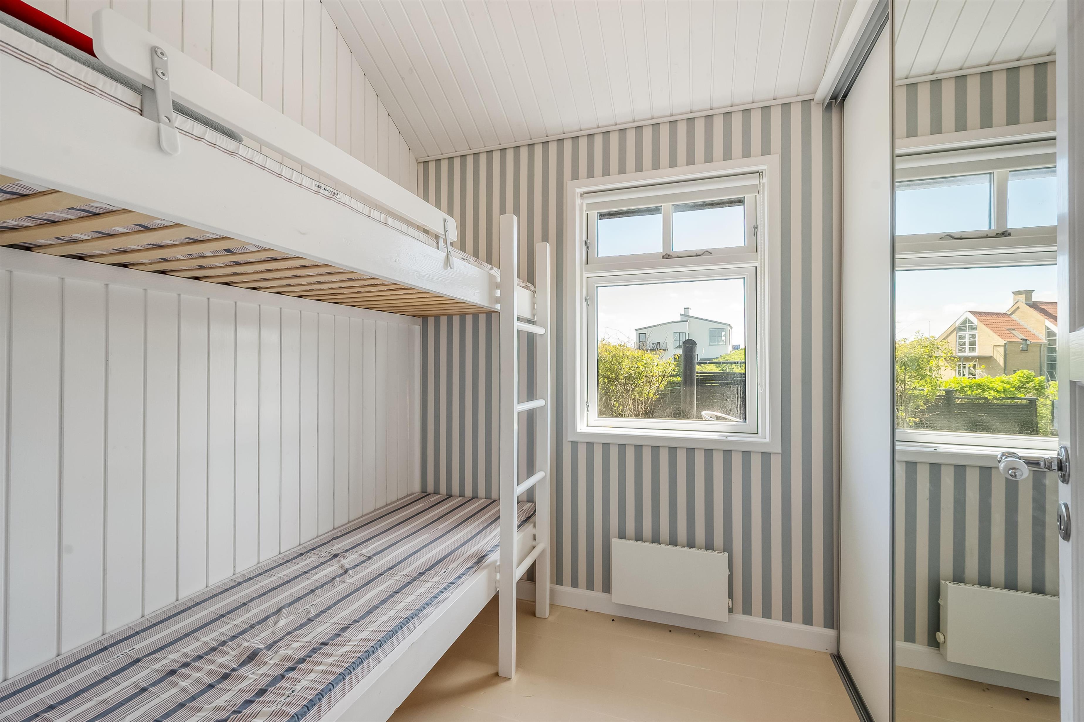 De to soveværelser og husets badeværelse ligger i forlængelse af spisestuen. Alle rum er dejlige og emmer af dansk sommerhusferie med en badehotelsstil, der er lys og indbydende.