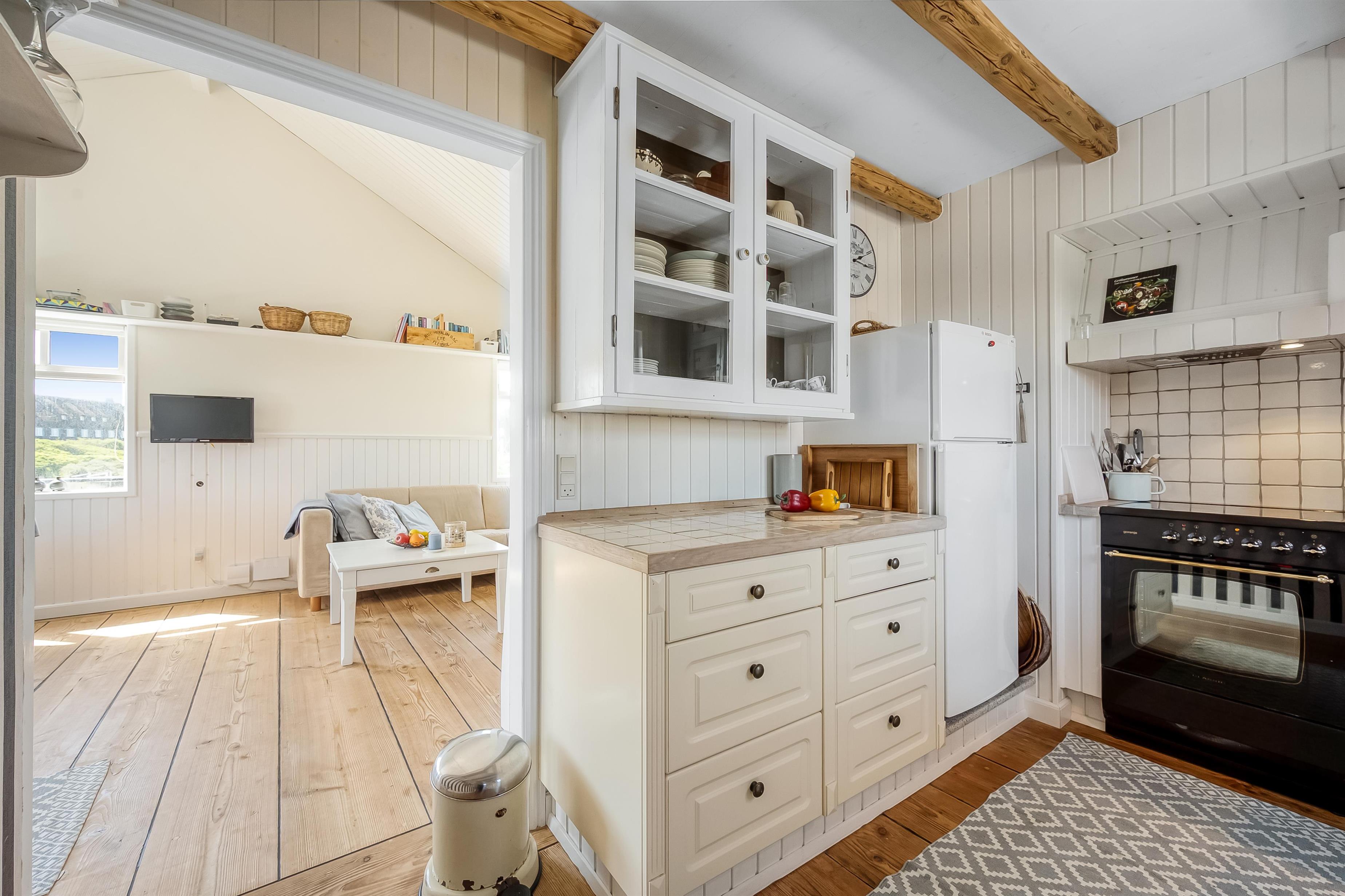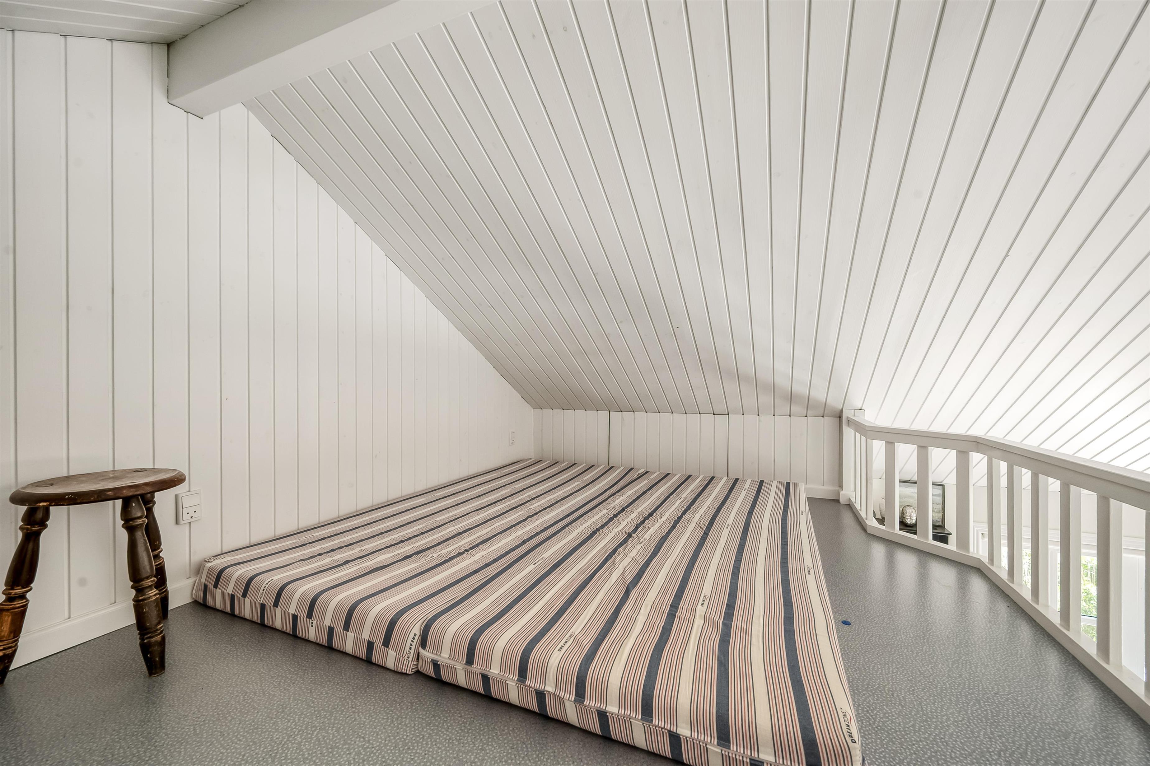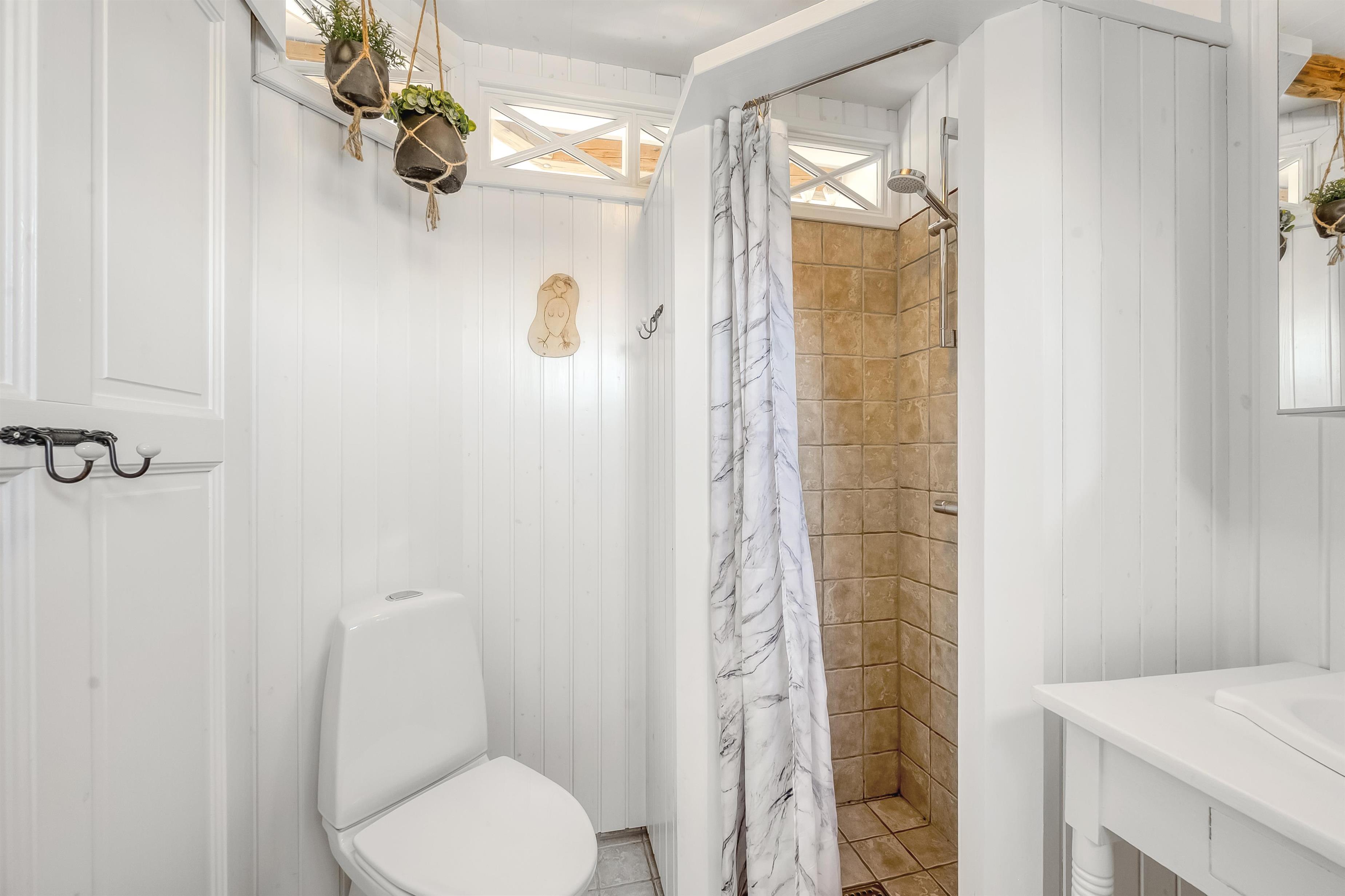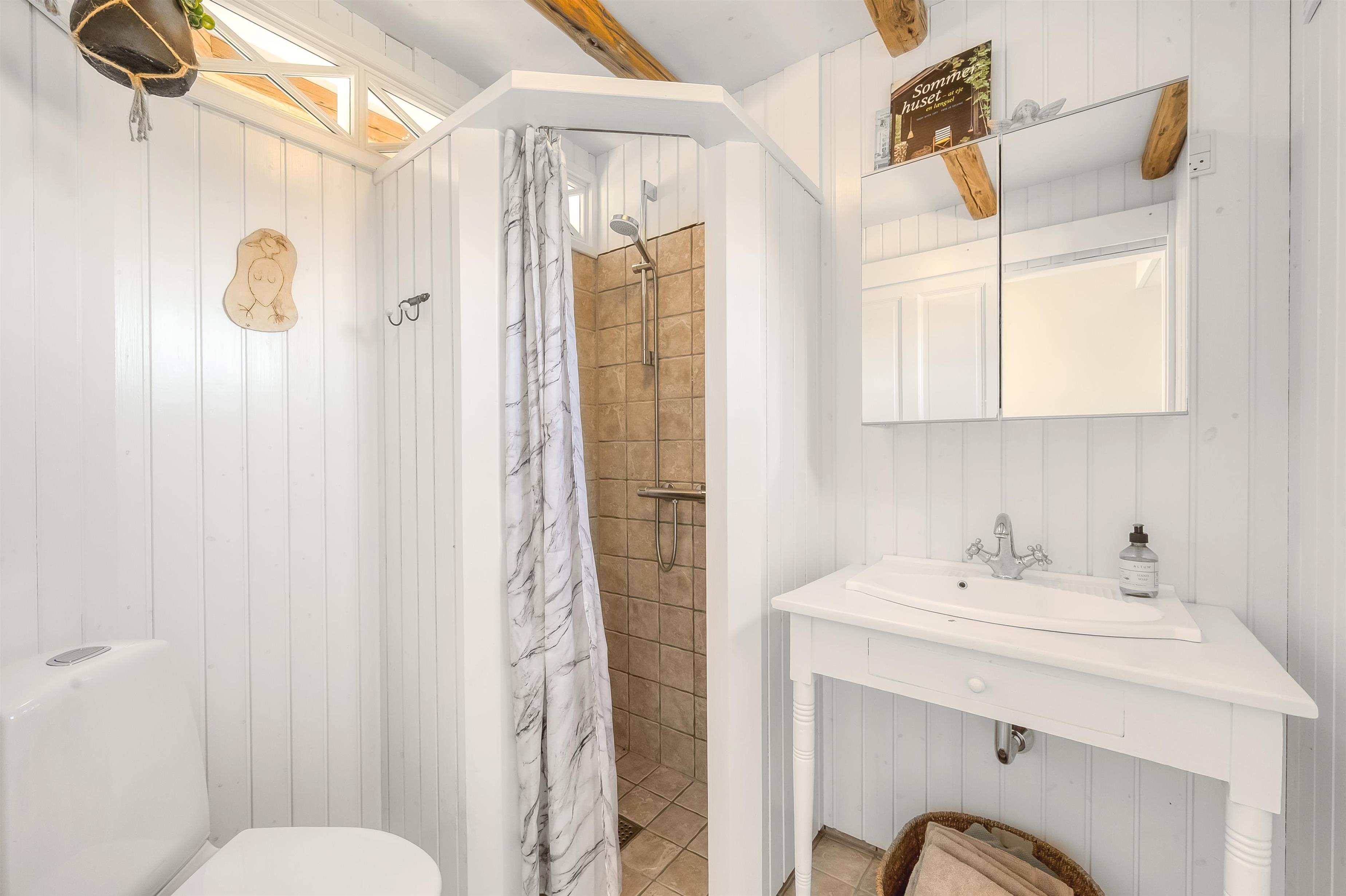 De to soveværelser og husets badeværelse ligger i forlængelse af spisestuen. Alle rum er dejlige og emmer af dansk sommerhusferie med en badehotelsstil, der er lys og indbydende.