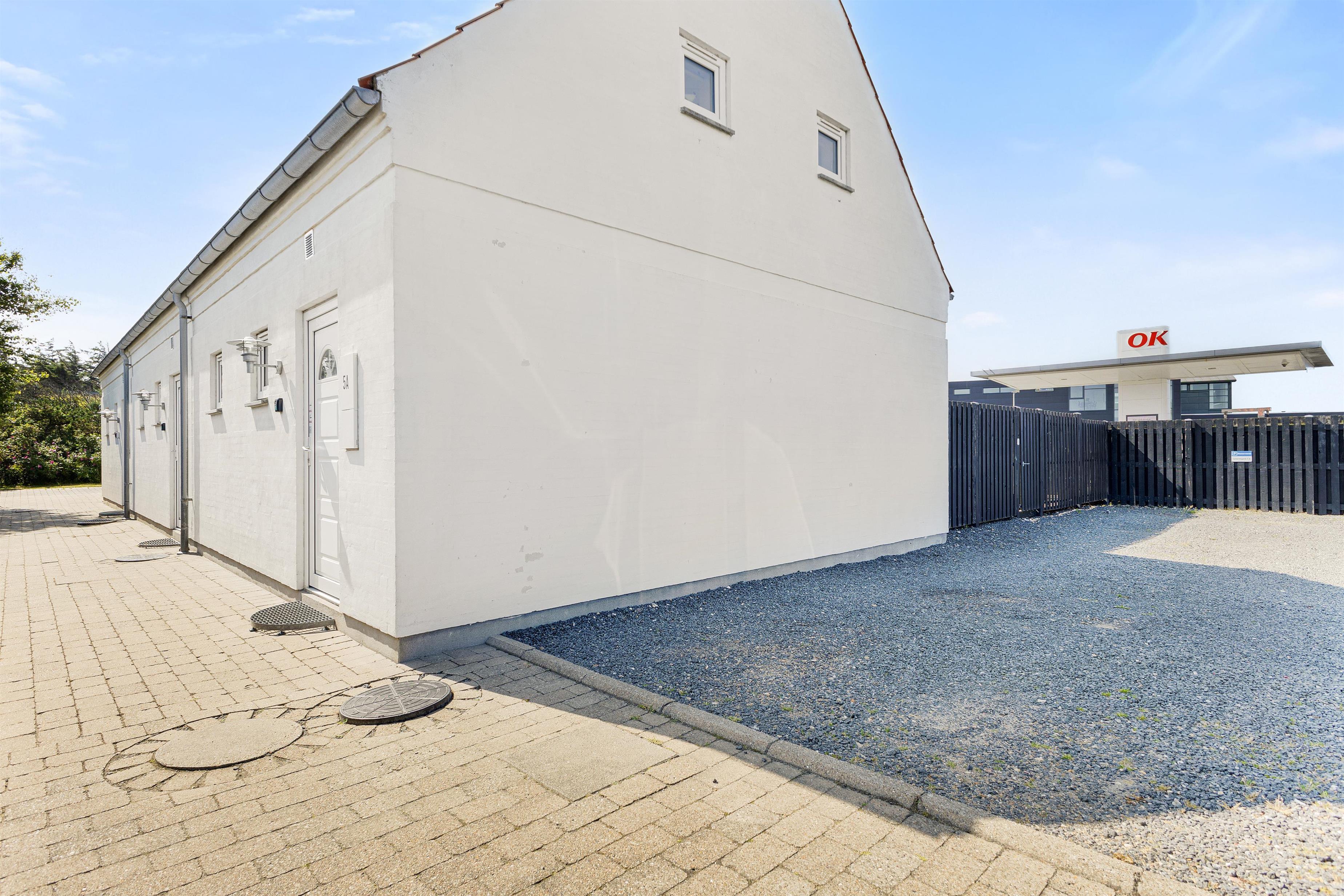 Her er tale om et enderækkehus, der ligger væk fra selve Jyllandsgade. Her har du privat parkering og en feriebolig på 75 kvadratmeter, hvor der er plads til 5 personer. Alle soverum findes på 1. sal, mens stueetagen er dedikeret til et dejligt stort badeværelse samt et lyst og åbent køkken/alrum og stue med udgang til den afskærmede have.
