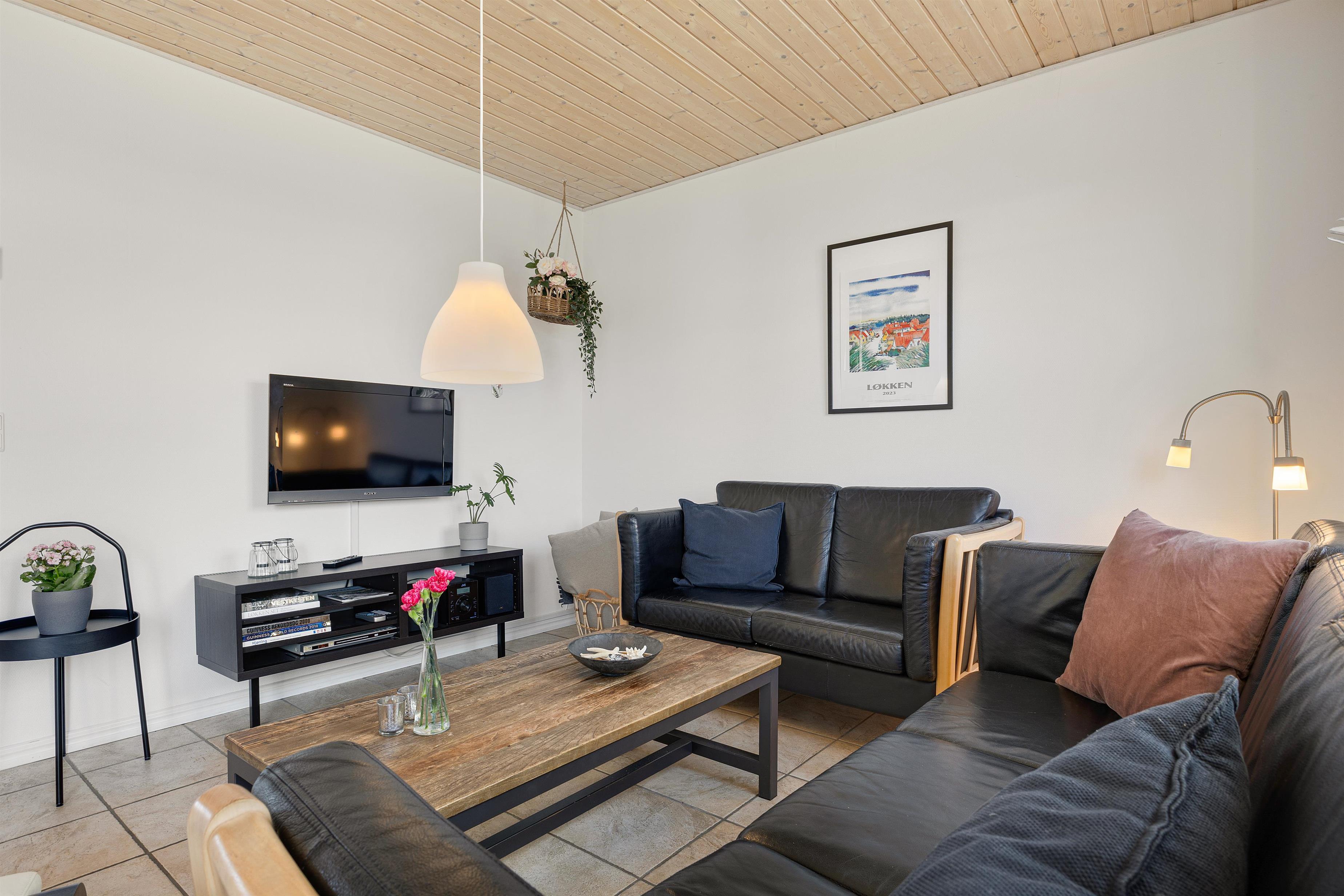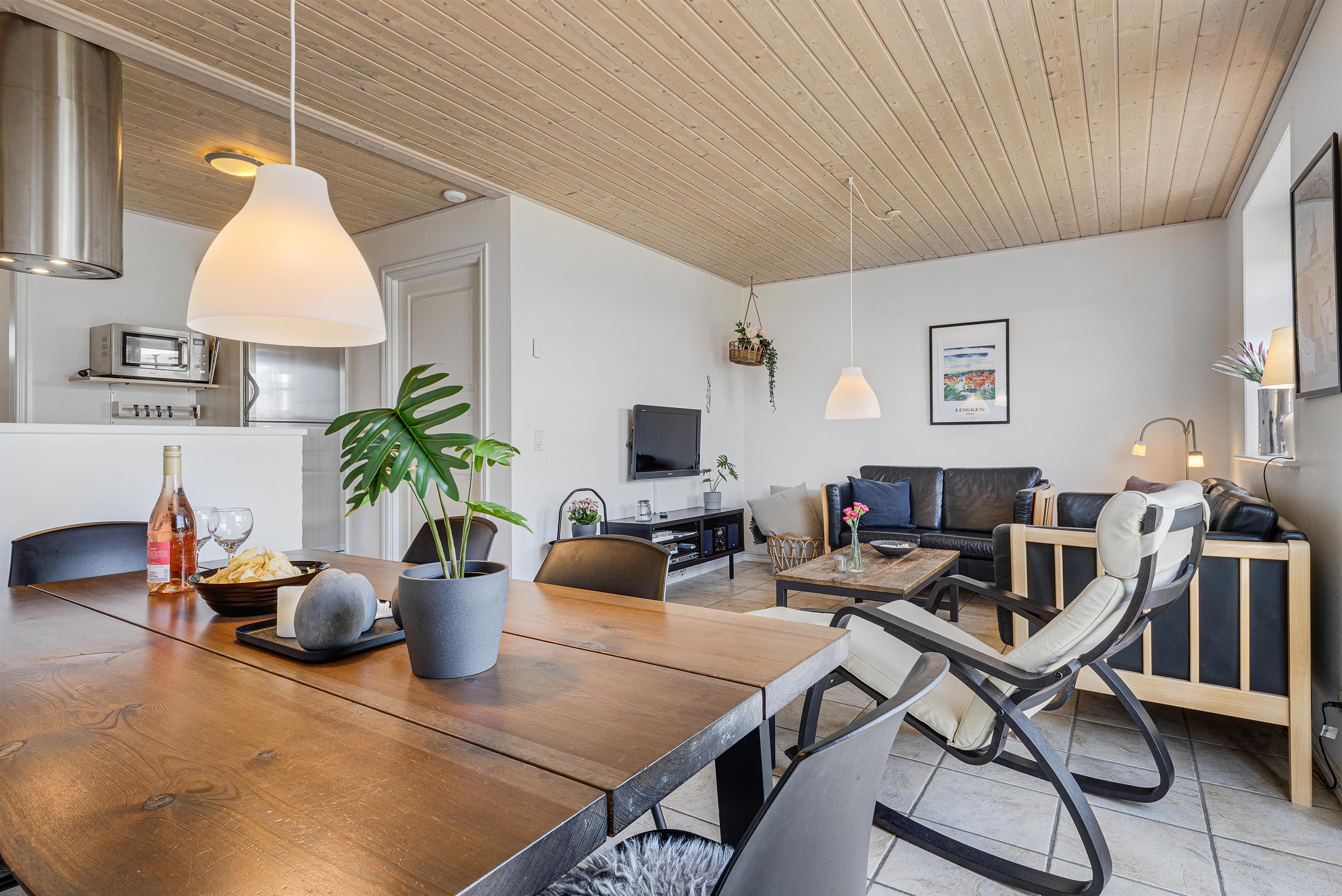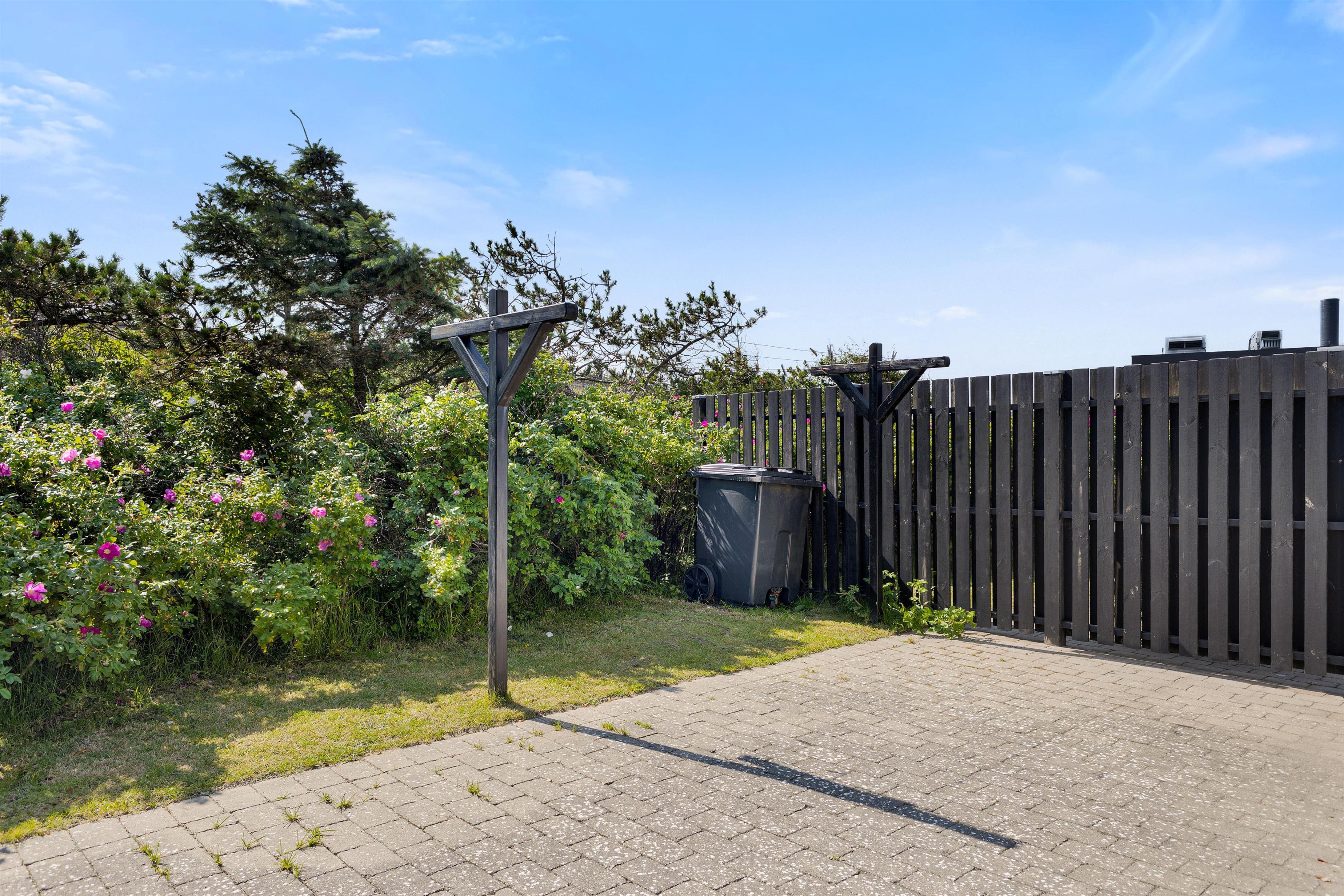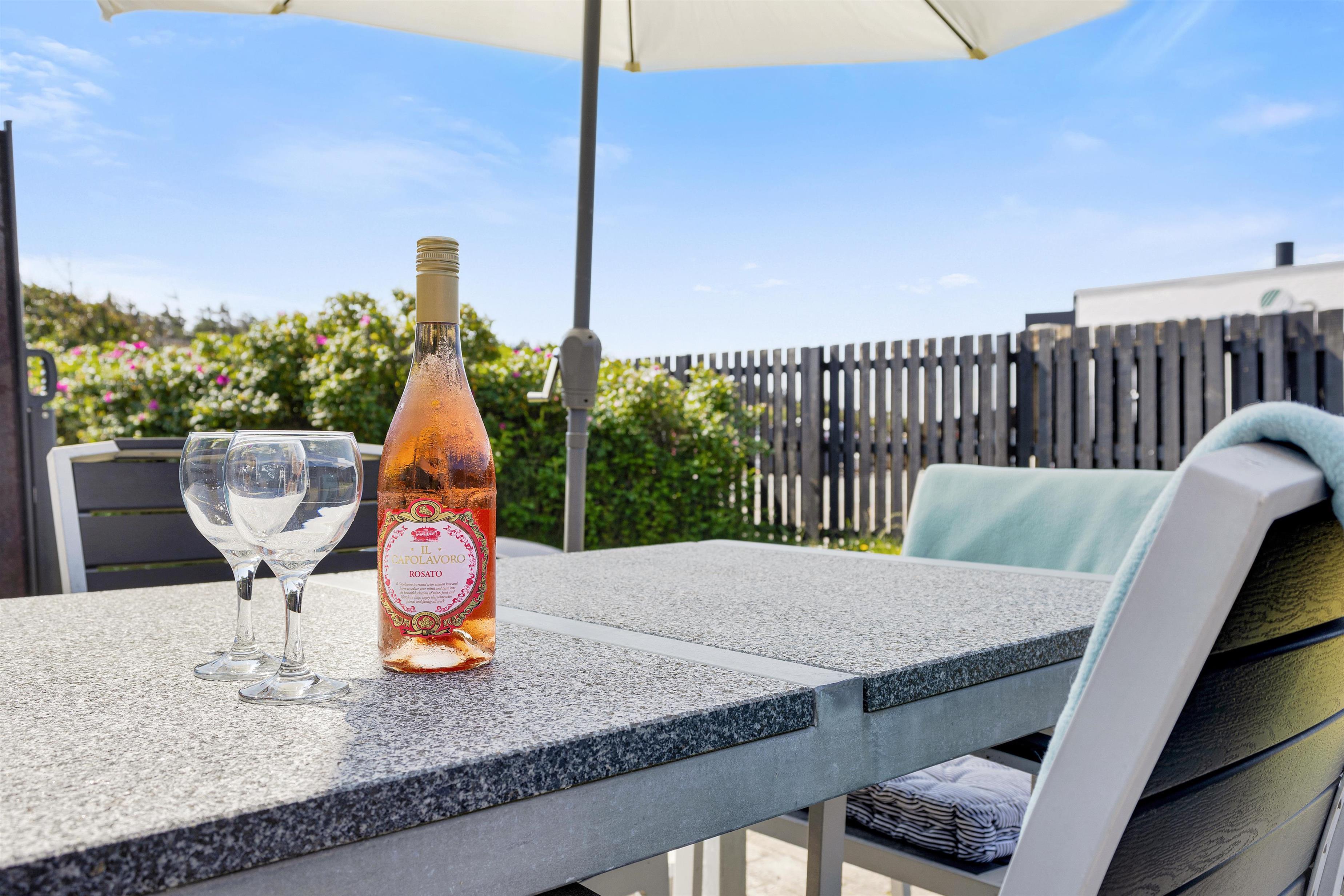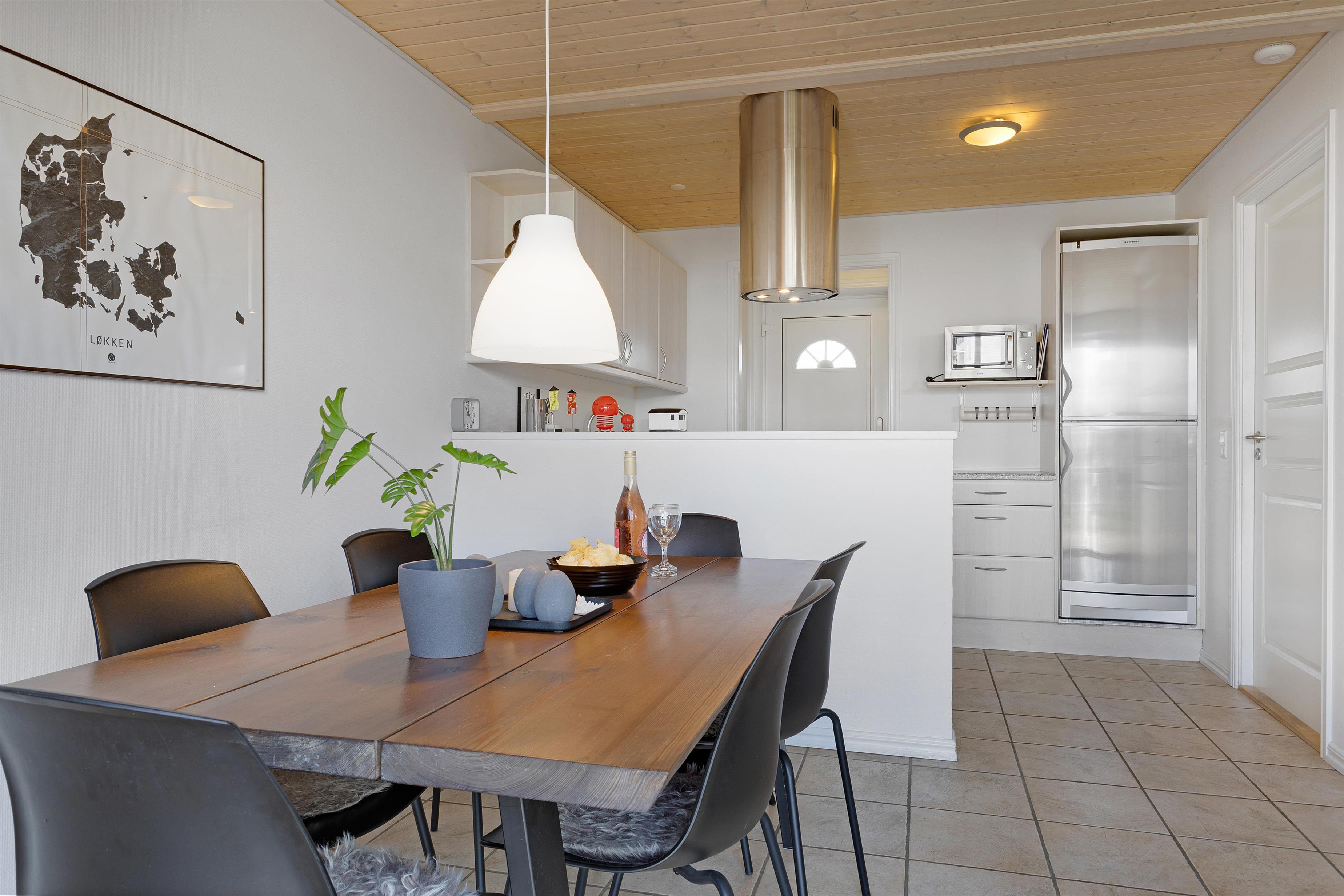 Fra det hyggelige og rummelige køkken/alrum har du udgang til husets have med spiseplads til 6 personer. Da huset er et enderækkehus, har du hele enden af bygningen til at finde dejlig læ, nærmest lige meget hvilken vej vinden blæser. Da det er tilladt at medbringe en mindre hund, er den afskærmede have helt optimal. Der er under 1 kilometer til Løkken Strand, endnu kortere vej til byens gågademiljø, og indkøbsmulighederne kan du se fra haven.