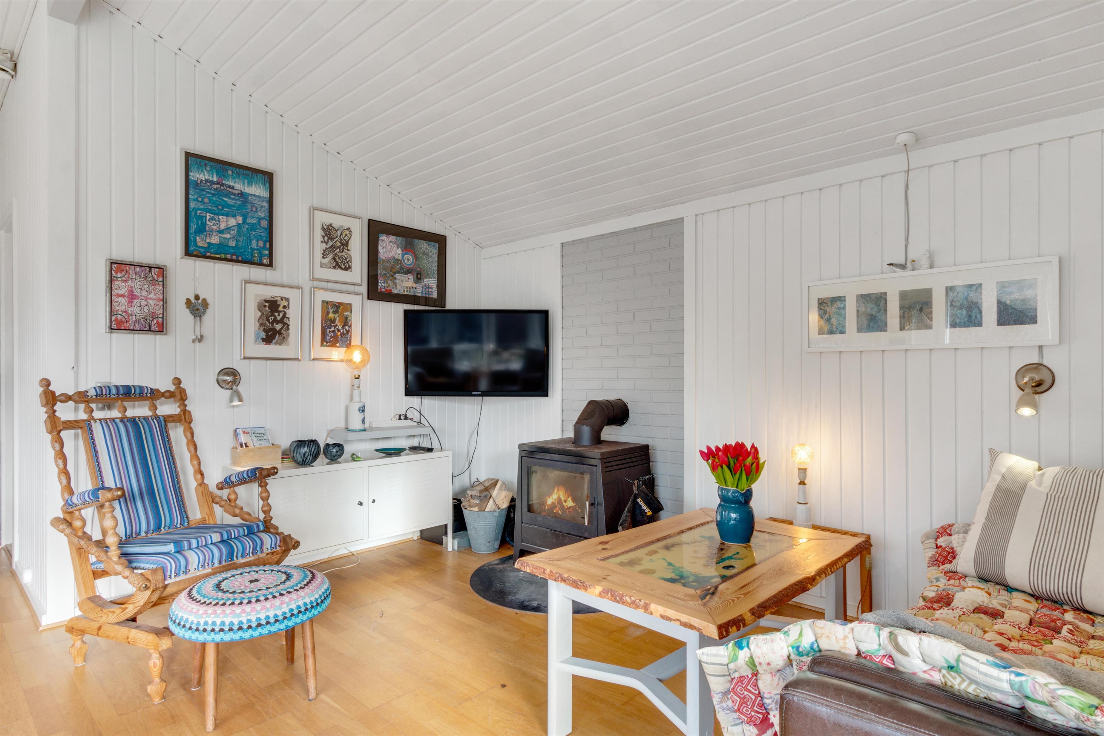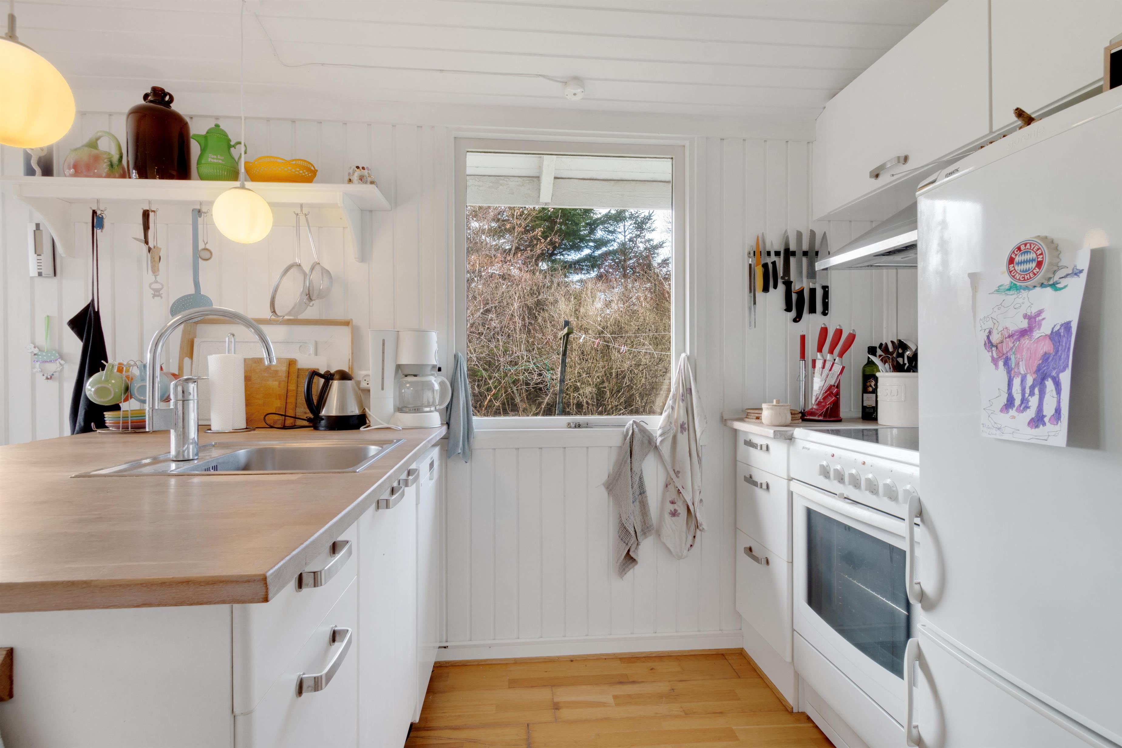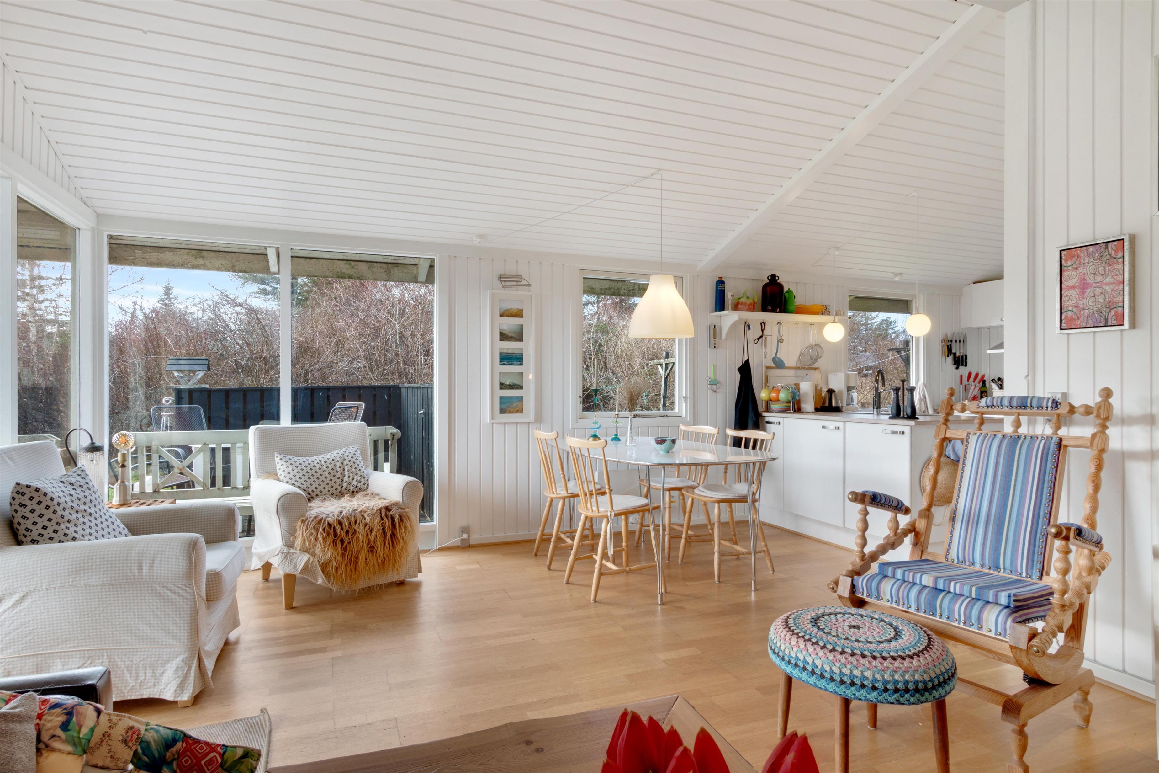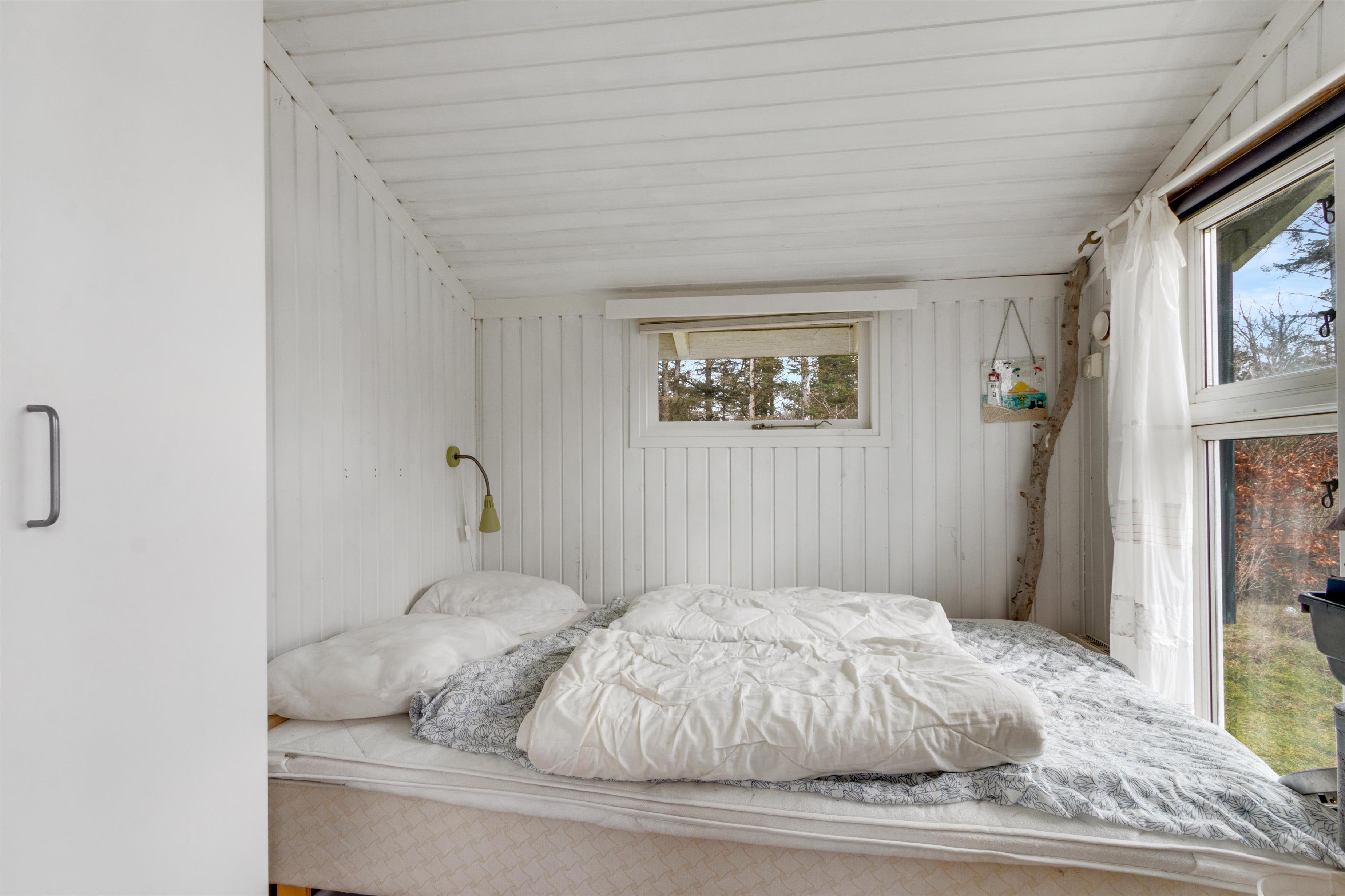 Dette sommerhus er virkelig charmerende! I husets super hyggelige stue finder du en dejlig brændeovn, og her er kimen lagt til mange timers afslapning. Stuen ligger i åben forlængelse af spisestue og køkken, og man kan komme hinanden ved og komme ned i gear. Der er to soverum, hvoraf det ene har en dobbeltseng og det andet har to enkeltsenge. I haven kan man nyde en ugeneret plads i solen, når den danske sommer er mild. Og ellers er det oplagt at trække indenfor i et af husets hyggelige rum. Er du til en gåtur til stranden, finder du vandsiden mindre end 600 meter væk. Der er lidt længere til indkøbsmuligheder - men herregud 2,5 kilometer er ingenting at regne!