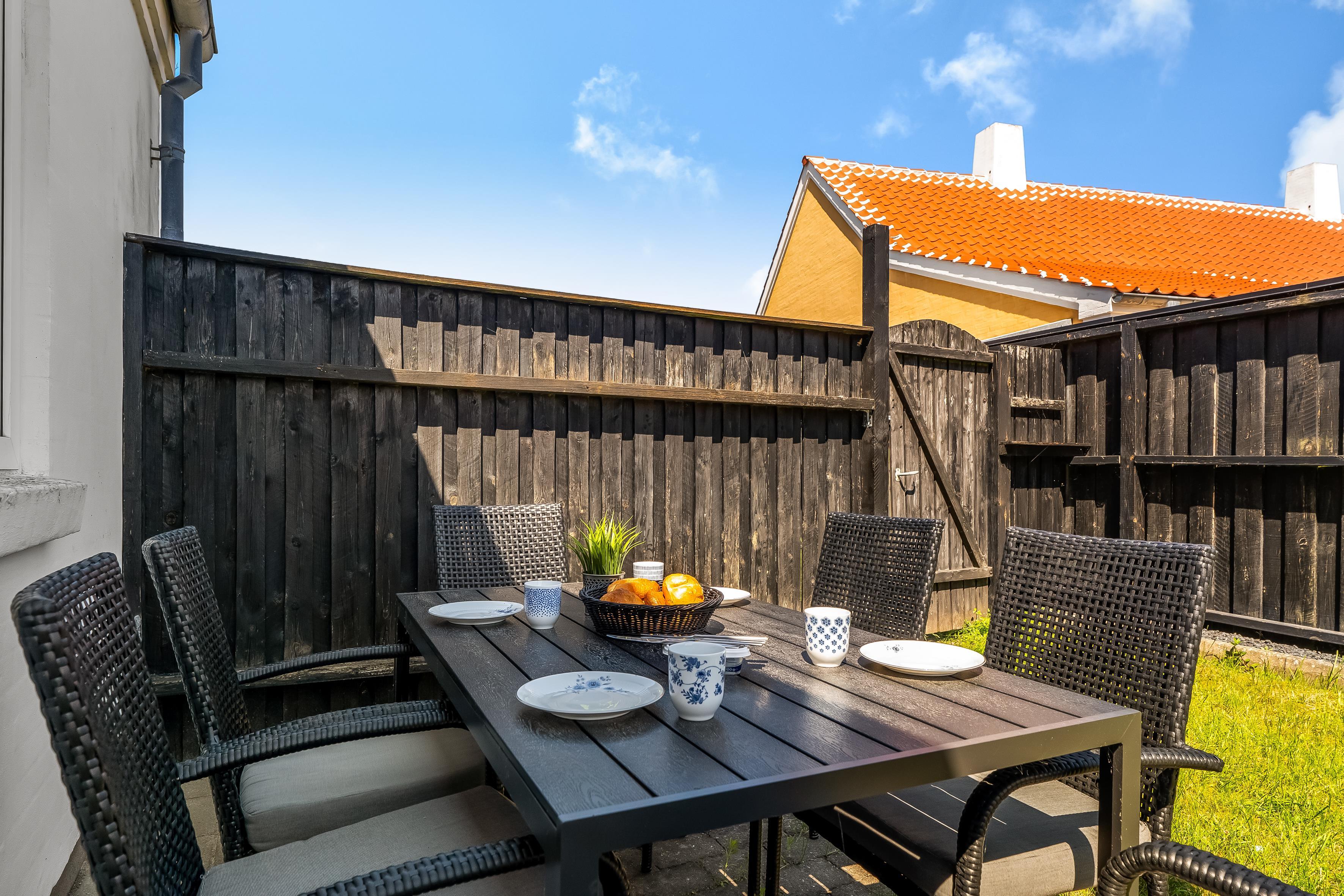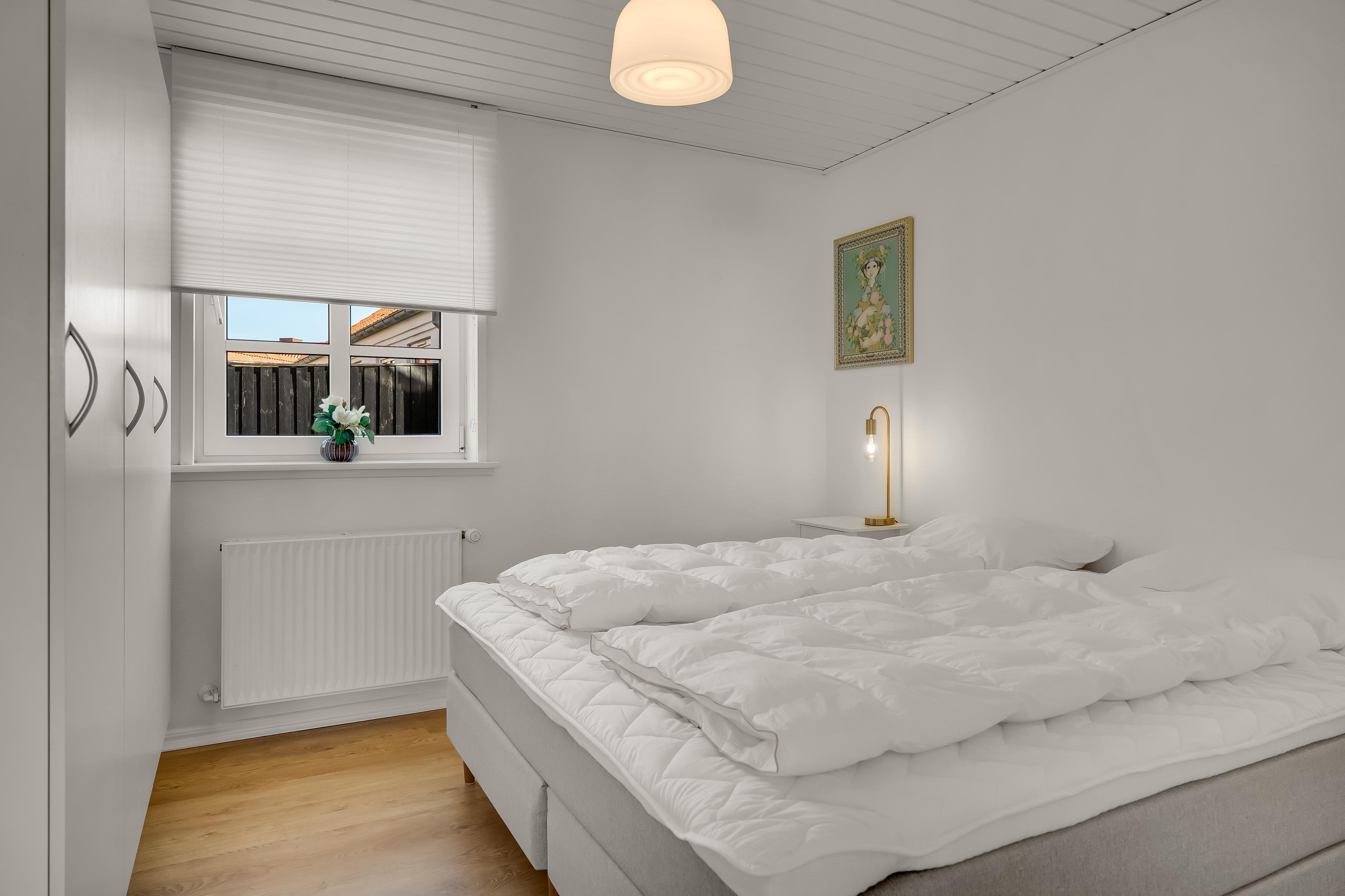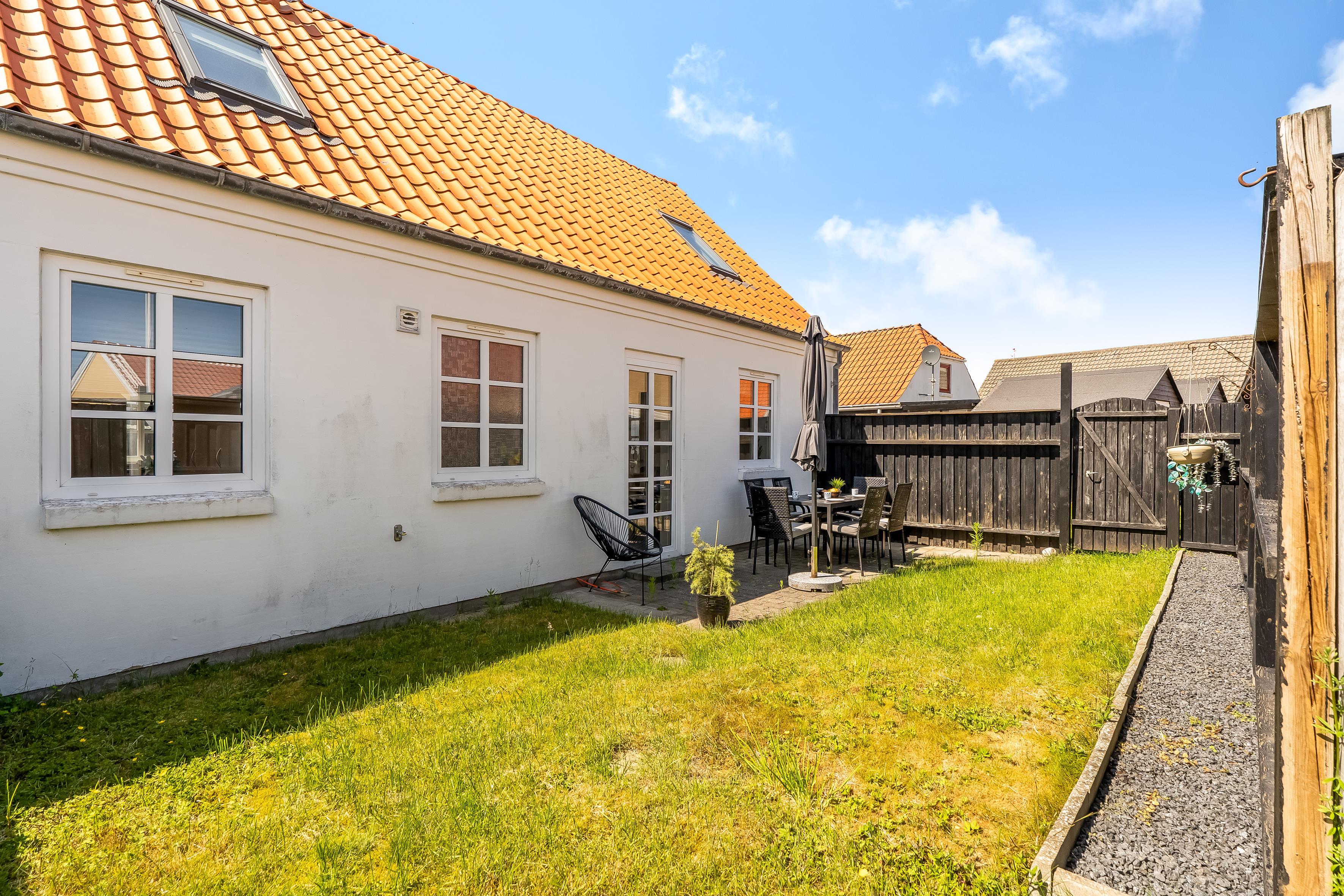 Ferieboligen er i super stand og ligger i gåafstand til strand, shopping, restaurationer, indkøbs- og transportmuligheder med mere. Der er 1 soverum og 1 badeværelse, og huset er praktisk indrettet med et rummeligt badeværelse og en lukket have. Her er plads til fire personer, og det er tilladt at medbringe husdyr. Rejser I 2 par sammen, er det oplagt at leje hhv. denne bolig samt lejligheden på 1. sal på samme adresse. Du har egen parkering netop foran boligen.