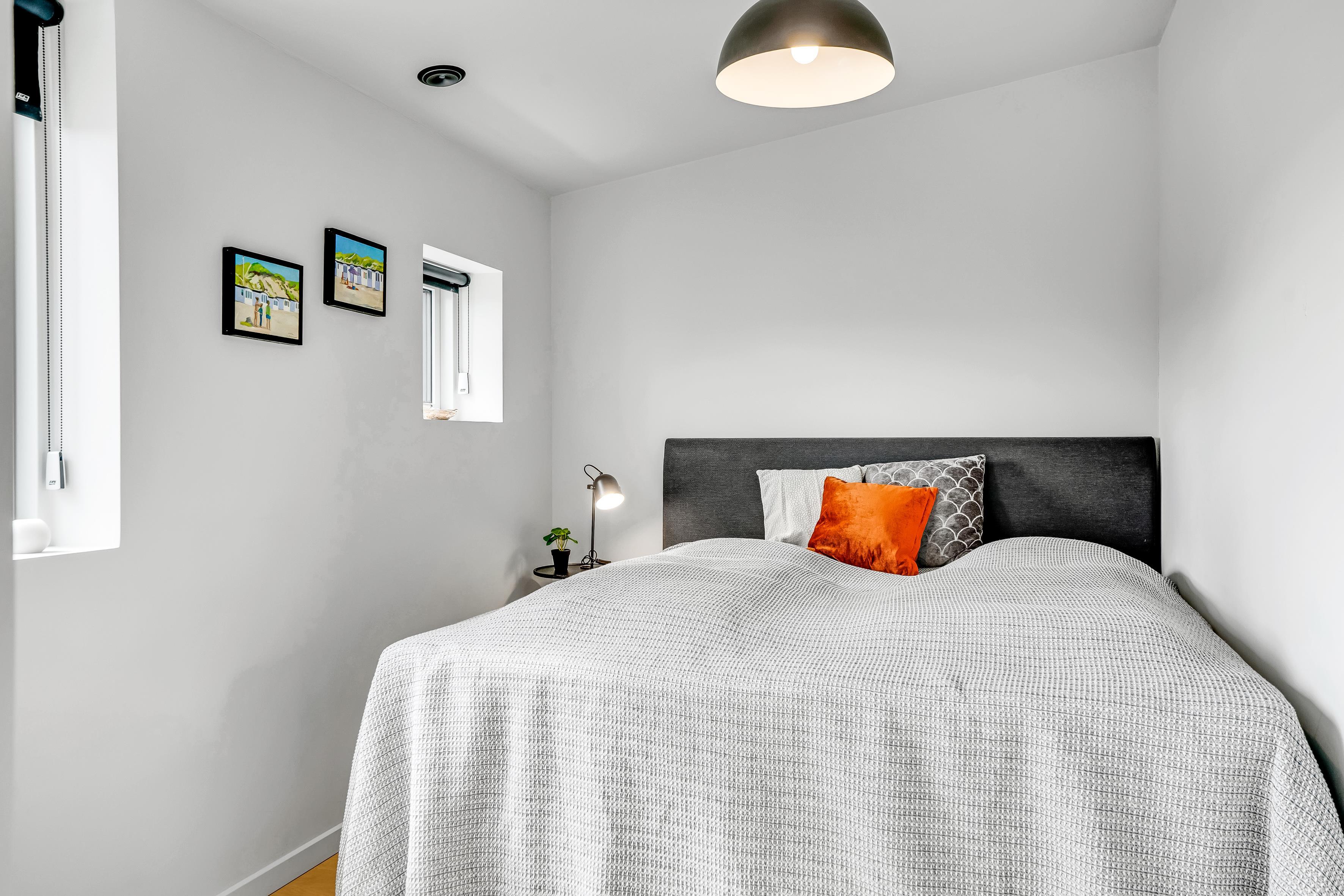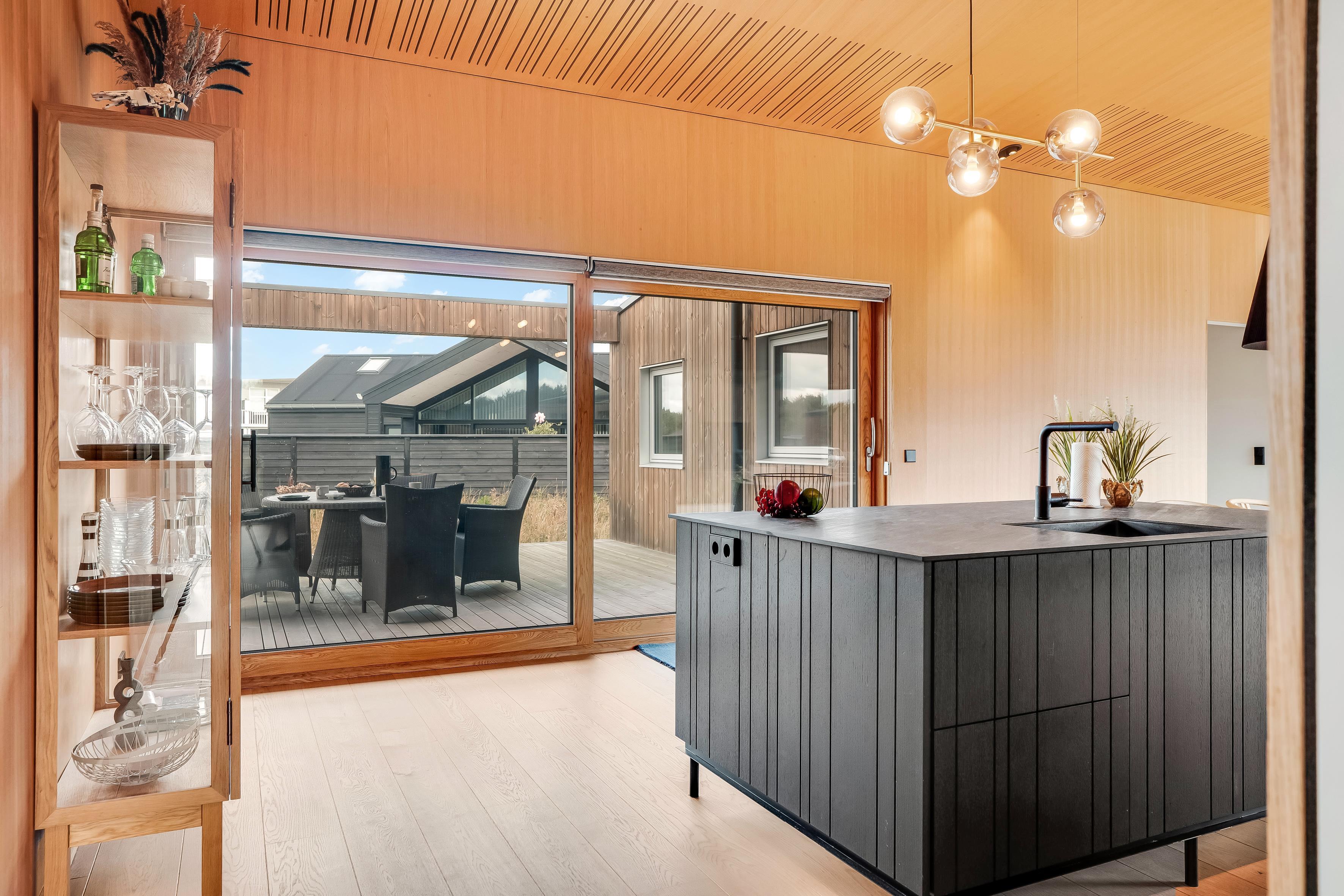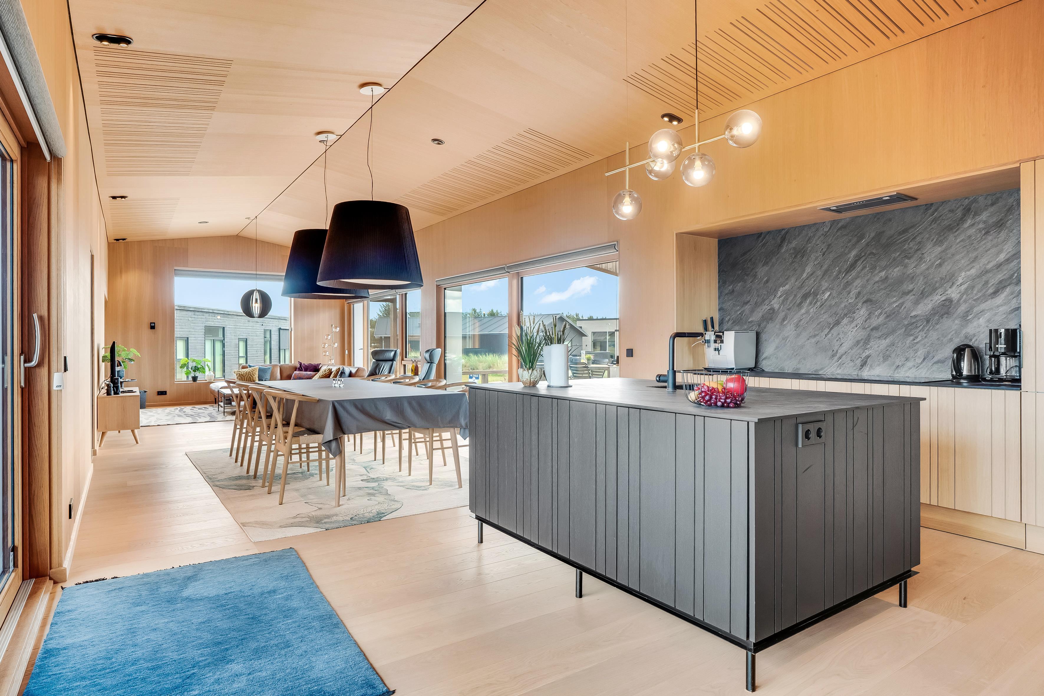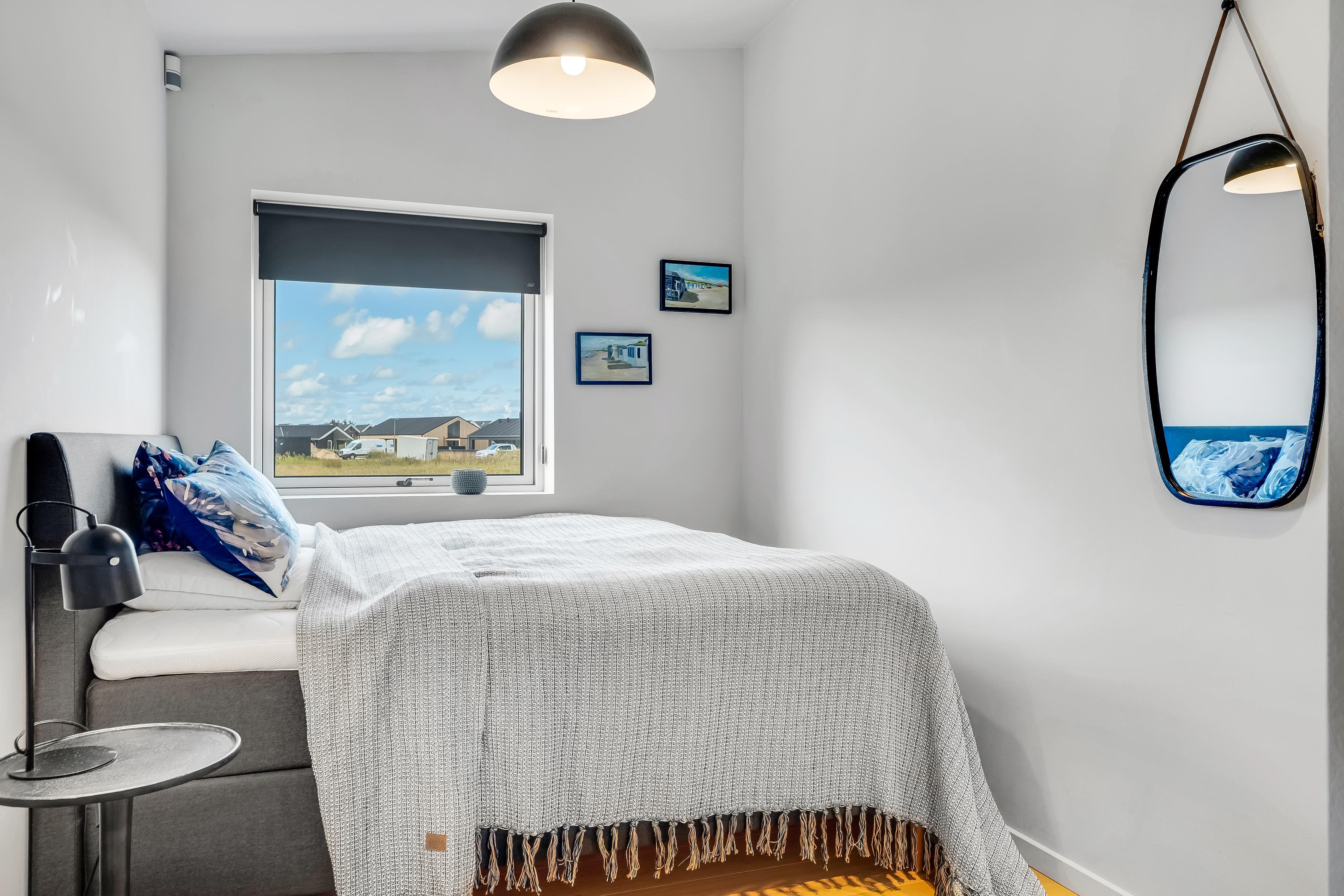 Sommerhuset rummer op til 7 gæster fordelt på 5 soveværelser med tre dobbeltsenge og to enkeltsenge. Hjertet af huset er det åbne køkken-alrum, som ligger i direkte forbindelse med stuen og byder på en lys, funktionel og velovervejet indretning i klassisk dansk design. De to badeværelser er både rummelige og elegant udstyret, og huset er placeret i et moderne nybyggerkvarter med både helårsboliger og ferieboliger side om side.