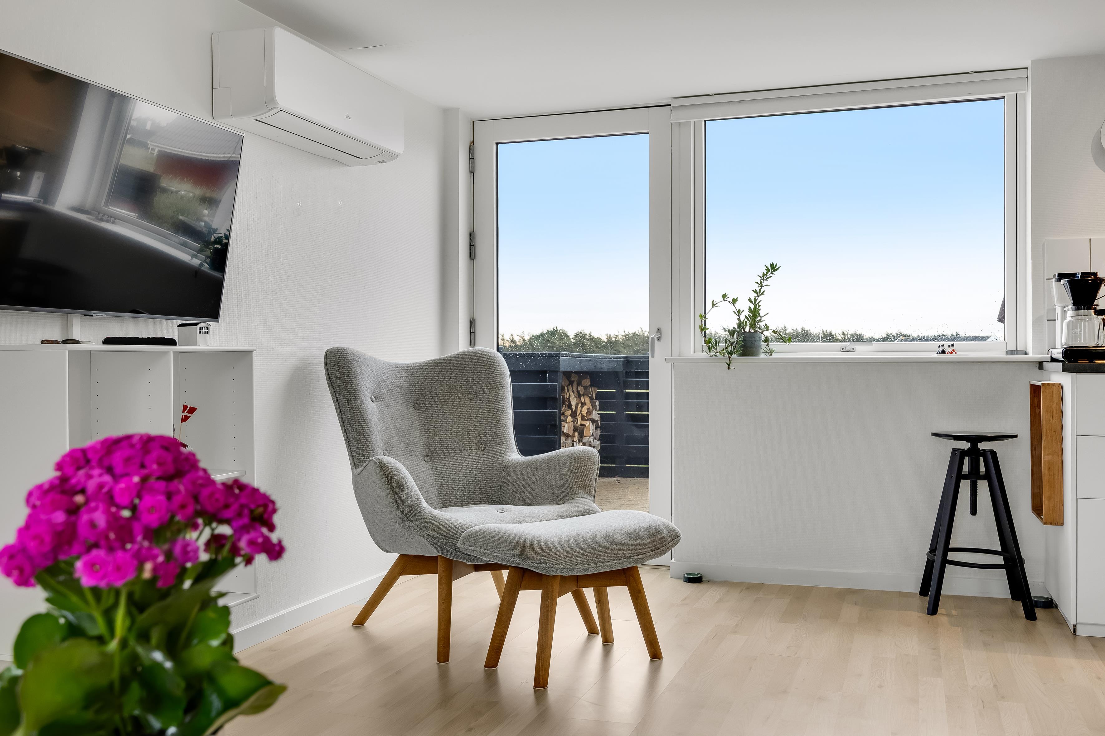 De store vinduer lader lyset strømme ind og giver et fantastisk kig til naturen omkring huset – perfekt til afslapning i fredelige omgivelser tæt på vandet. Dette hus emmer af klassisk, dansk sommerhusudlejning, når det er bedst.