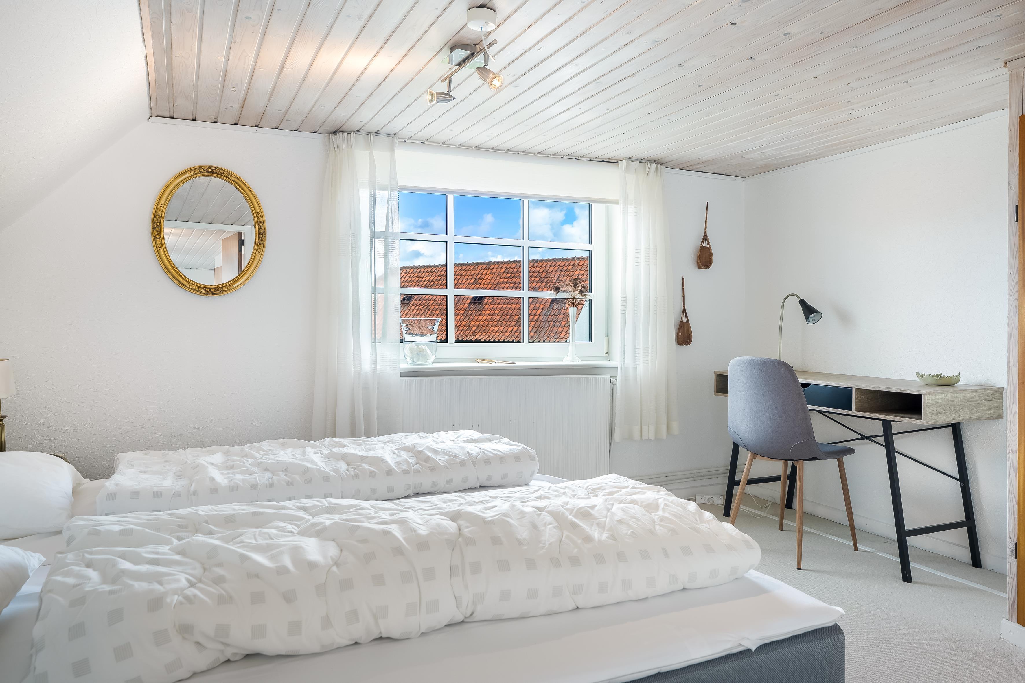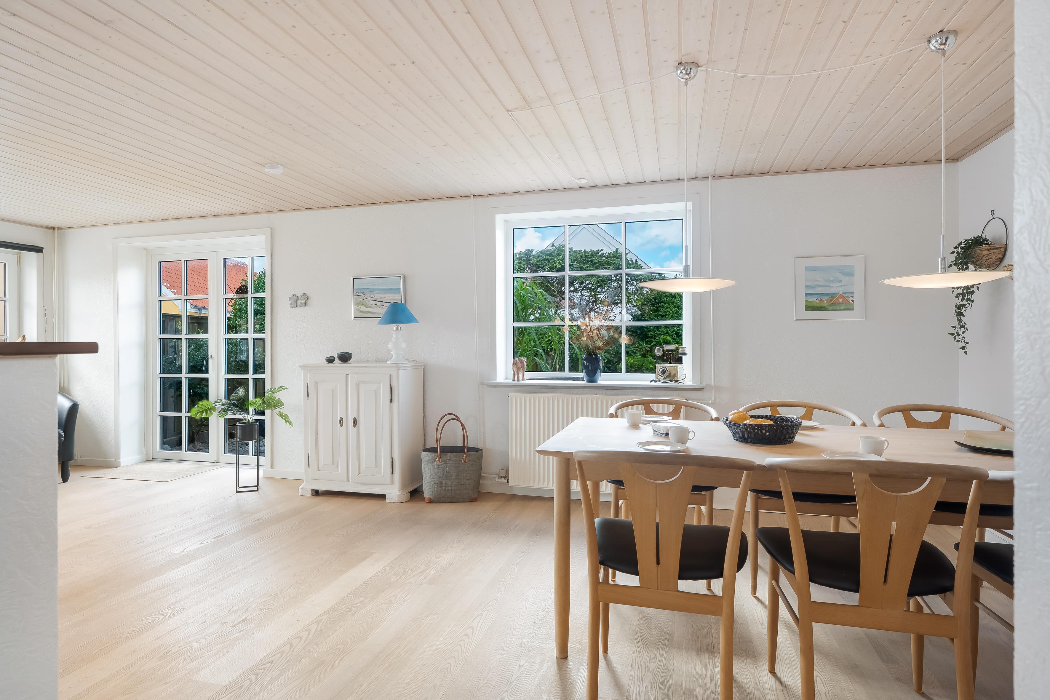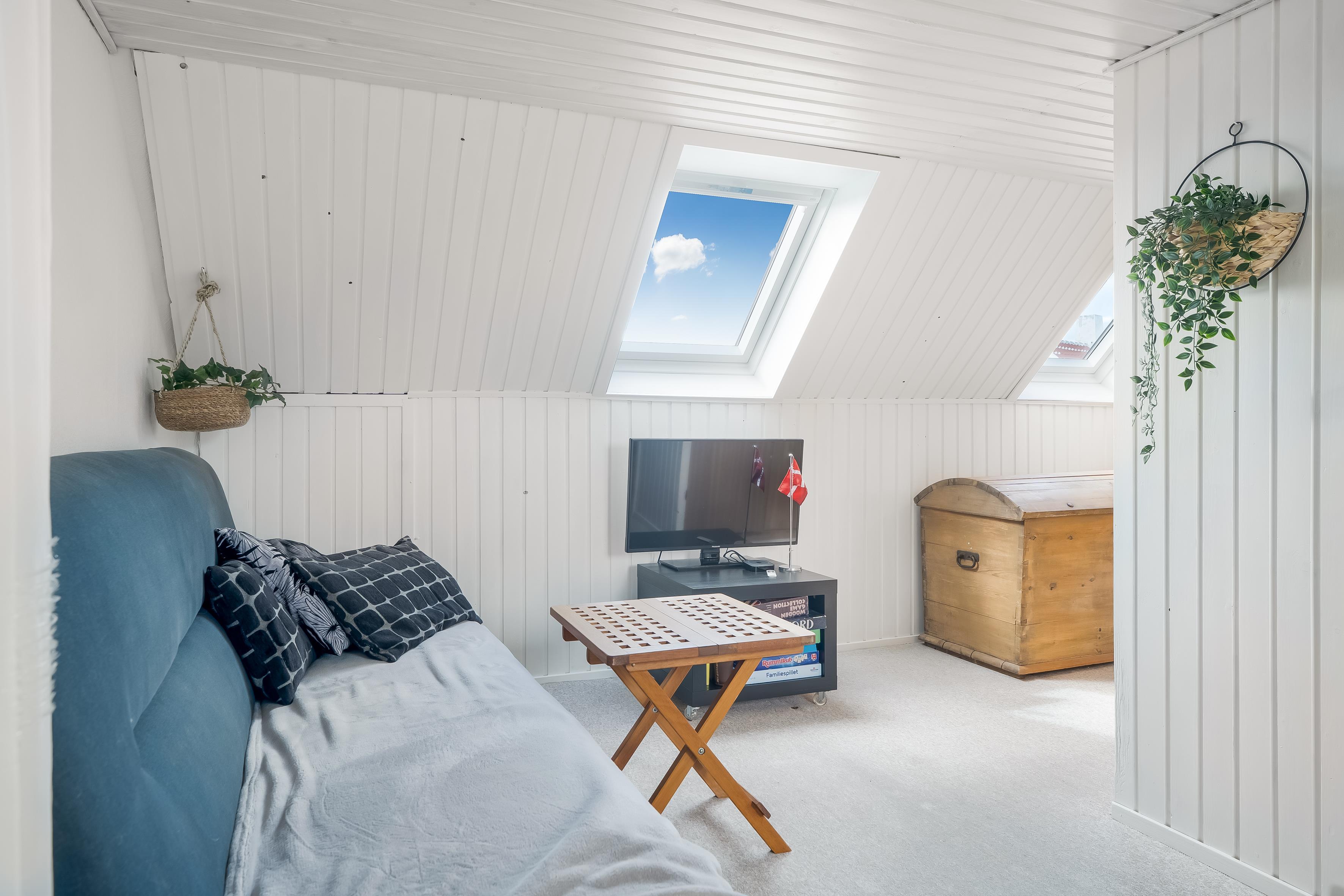 Huset er dejligt lyst med det store køkkenalrum og stue, hvorfra du kan tilgå den skønne gårdhave og den hyggelige udestue, hvor du kan være helt privat trods husets centrale placering midt i byen. Her er hele fire soverum og fordelt på to etager er sengefordelingen som følger: