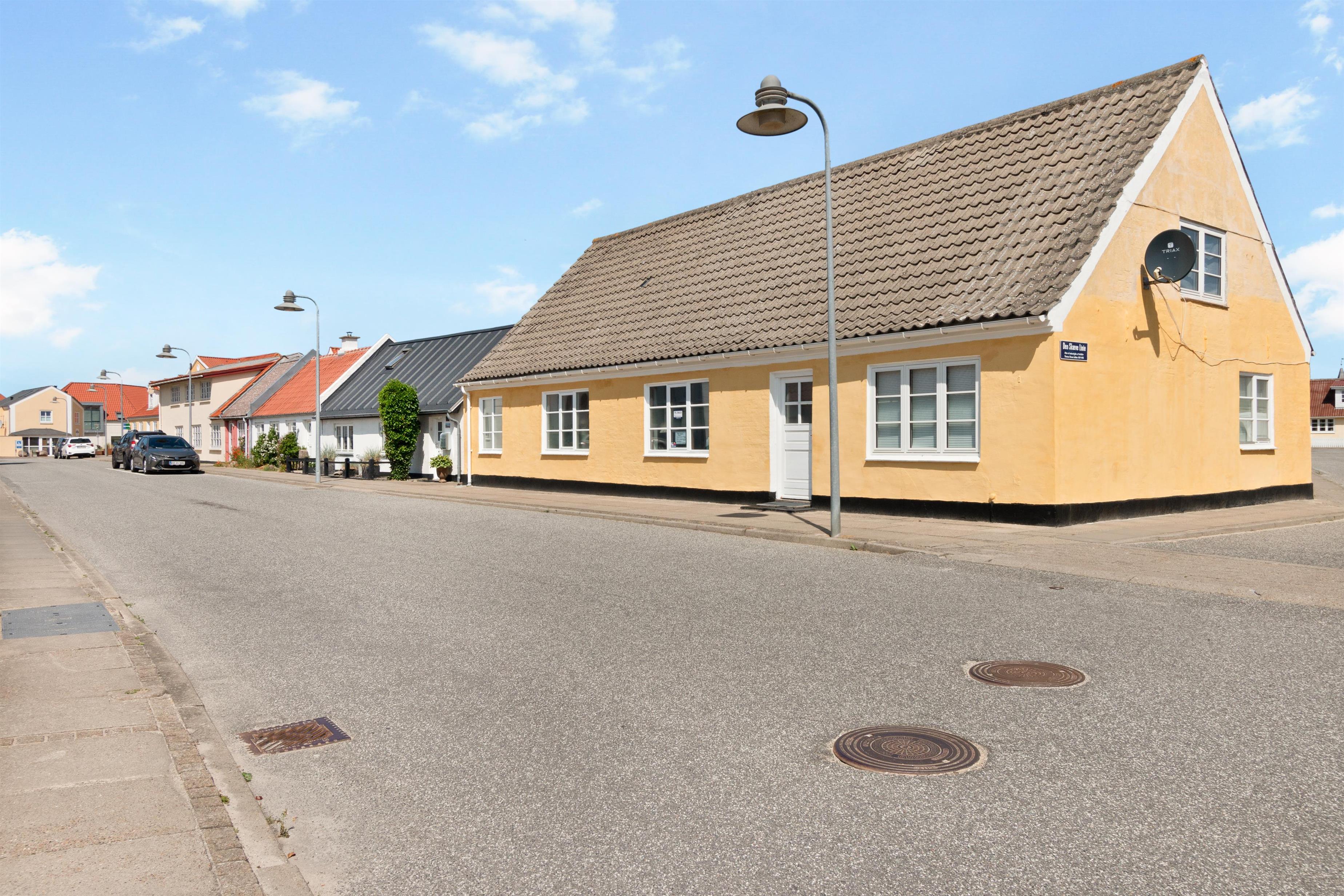Lejligheden ligger på en tilkørselsvej til byens torv, men den er ikke stærkt trafikeret. Man tilgår den fra baggården, hvor man kommer ind via den charmerende stikvej “Den skæve Linje”. I baggården kan man sidde i solen, ugeneret fra både Vrenstedvej og Den Skæve Linje. 200 meter væk finder du indkøbsmuligheder og 150 meter væk ligger byens torv. Ca 500 meter til stranden.