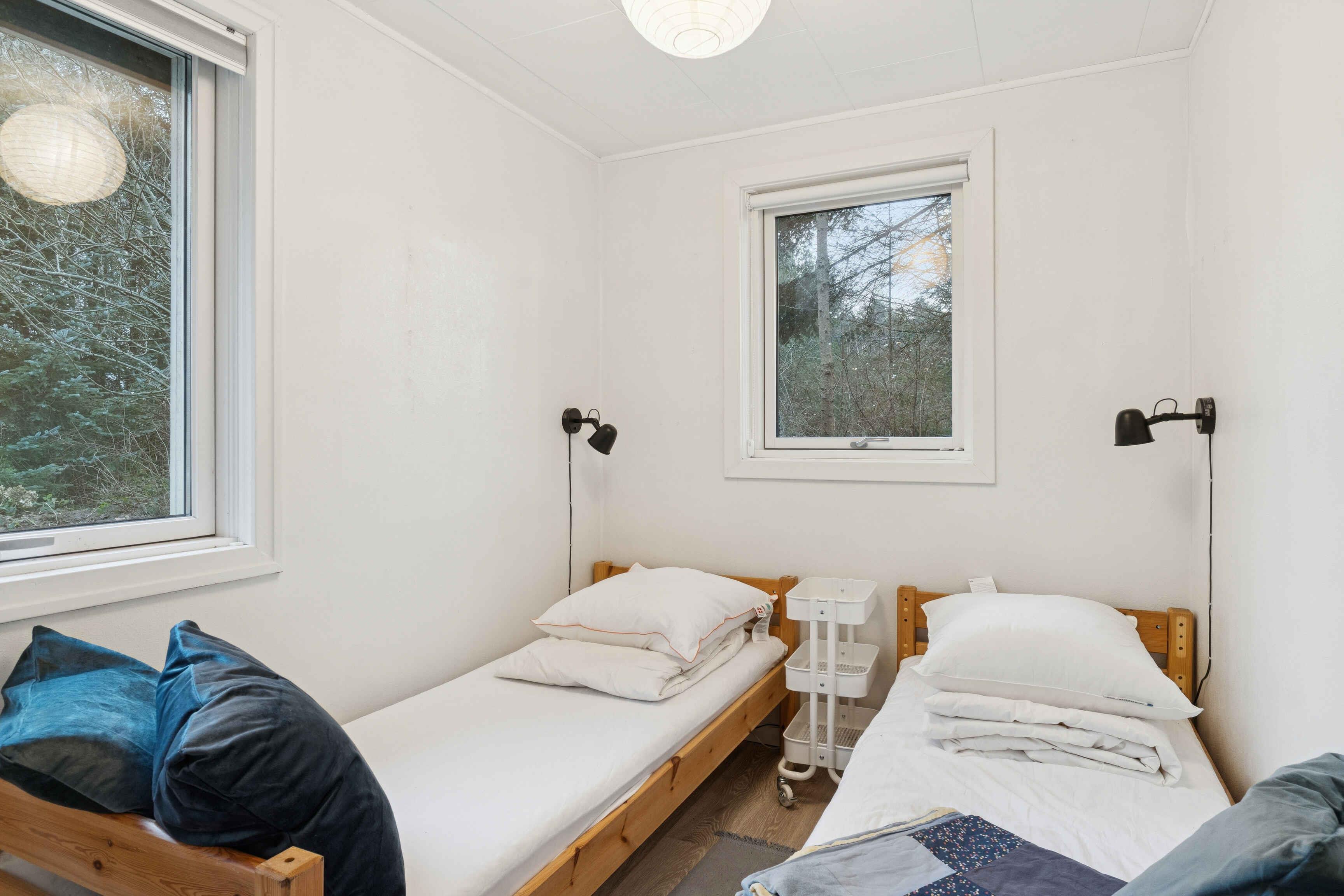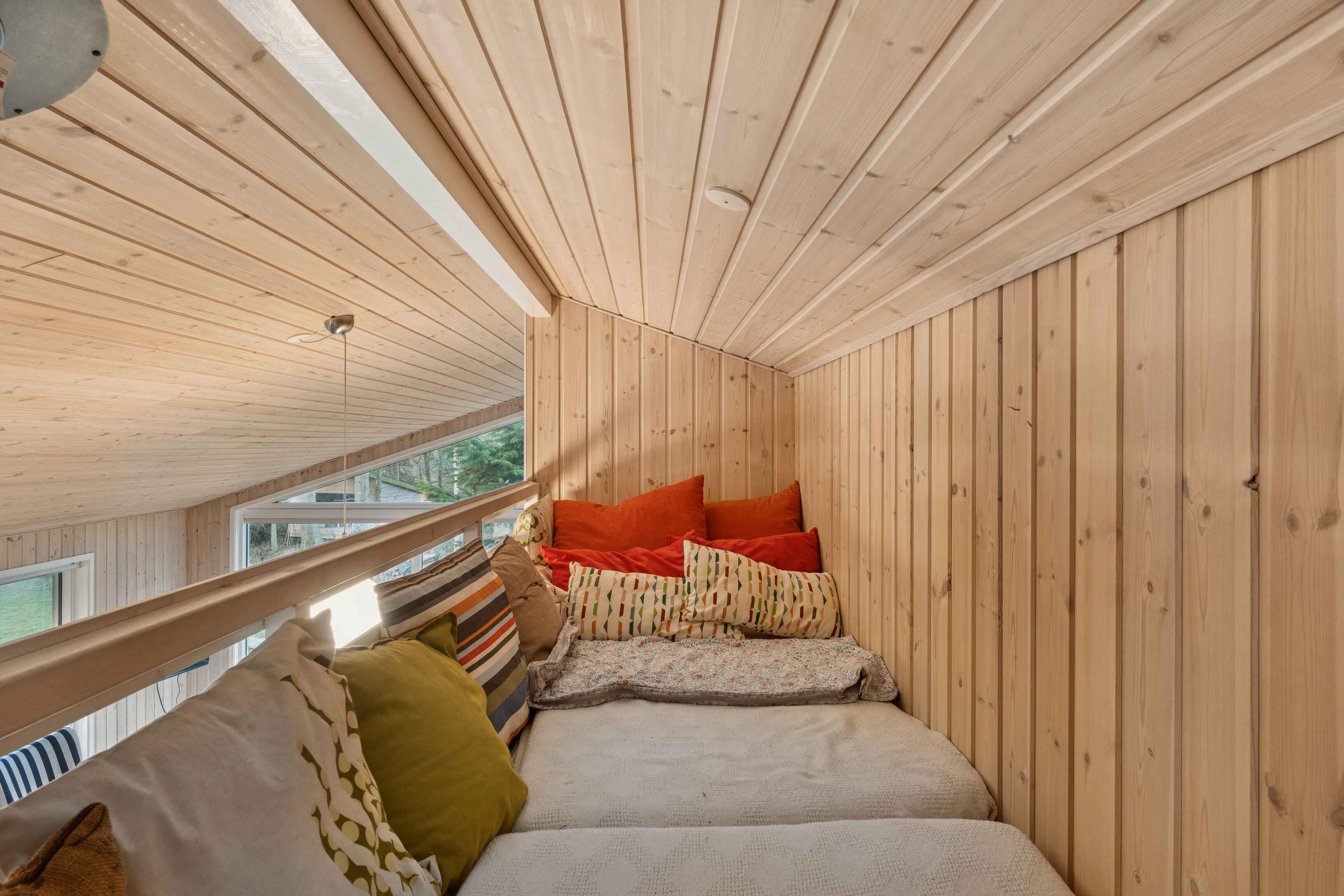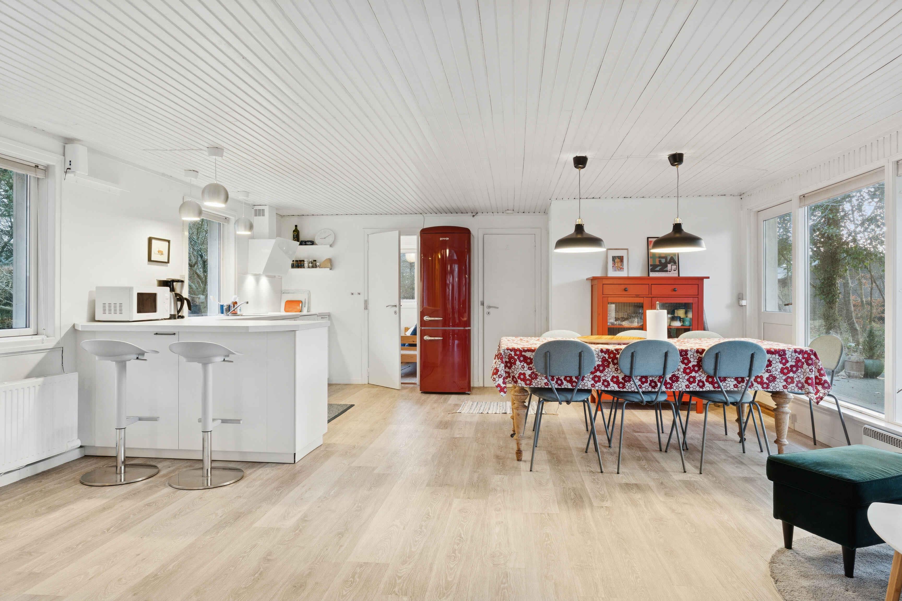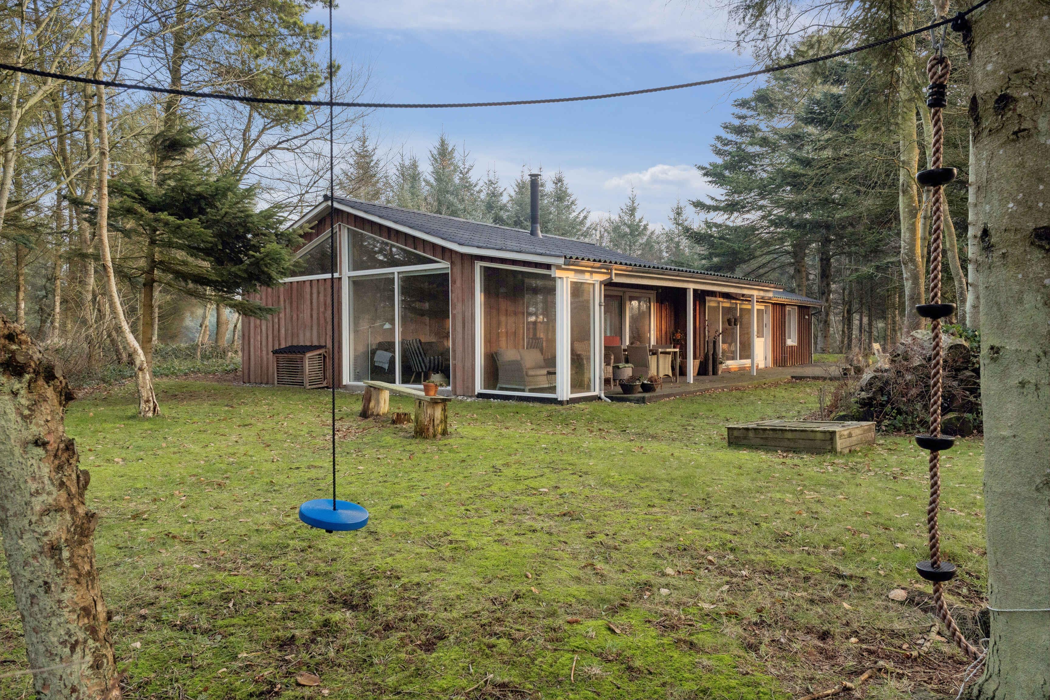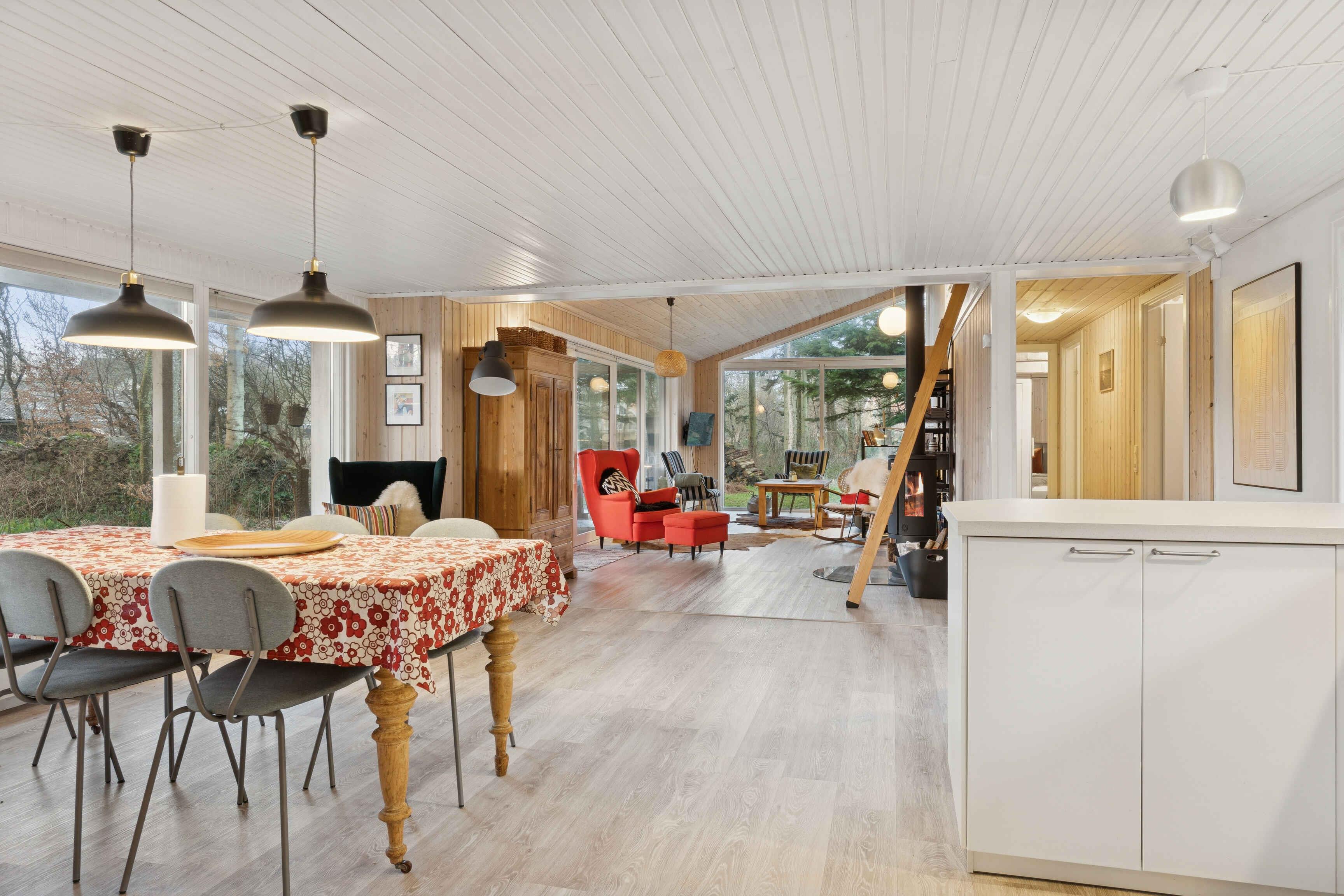 Sommerhuset er beliggende i Nørre Lyngby, 4 km nord for Løkken og 10 km syd for Lønstrup og 25 km fra Blokhus. Der er således nem adgang til flere af de hyggelige byer i området, som byder på et væld af aktiviteter, spisesteder og liv. I Nørre Lyngby er der roligt og hyggeligt, og med under 800 meter til Vesterhavet. Nørre Lyngby strand har fint hvidt sand og smukke stejle klitter. Stranden har det hvide badeflag, som bl.a. symboliserer, at badevandskvaliteten er høj. Huset ligger på en 2.250 m2 grund, der både rummer græsarealer og skov. På grunden er der desuden et shelter til fri afbenyttelse. Grunden ligger roligt og ugenert ud til en grusvej. Huset er på 116 m2 og består af en oprindelig, men renoveret, del fra 1969, og en nybygget del fra 2014. Man kommer ind i huset igennem bryggerset, hvor man til den ene side har et stort soveværelse med dobbeltseng (180x200) og et badeværelse, og til den anden side kommer ind i køkken/alrummet. Køkkenet er fra 2023 og rummer fint plads til 6 personer. Fra alrummet er der adgang til husets meget hyggelige og rummelige stue hvor der både er brændeovn og en sofagruppe. Her er der forskellige bøger og spil til fri afbenyttelse. Herudover er der adgang til en hyggelig hems. Fra både stue og alrummet er der adgang til en delvist overdækket terrasse. Fra køkkenet er der adgang til husets andet badeværelse. Herudover er der adgang til husets to øvrige mindre soveværelser. Det ene består af 2 senge på 70x190 og det andet værelse har 2 boksmadrasser på 80x200.