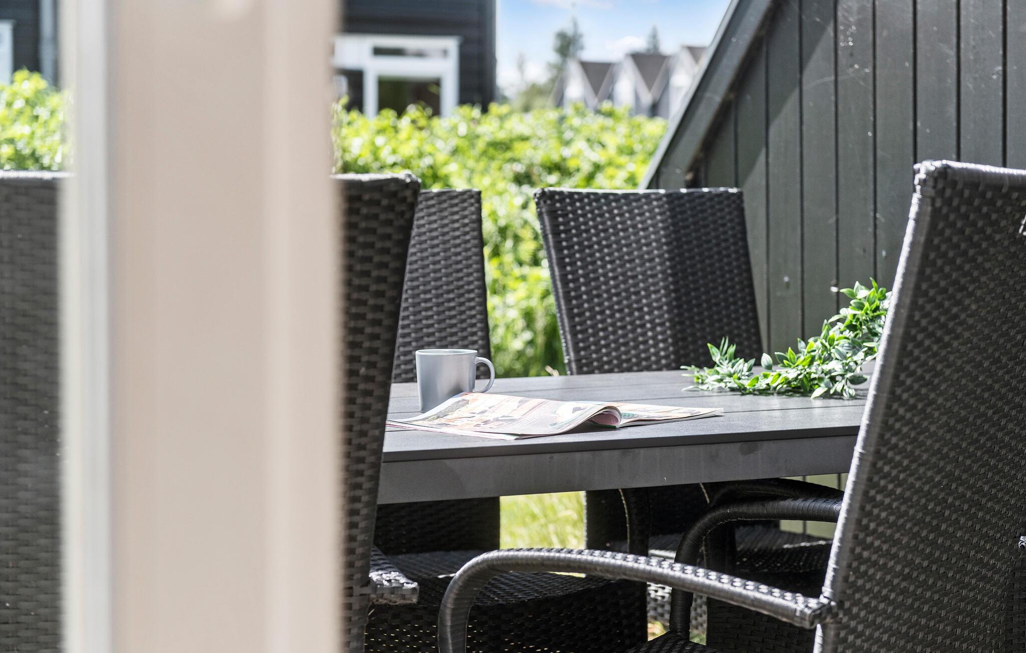 Moderne feriehus i Lønne Strand med stor terrasse og adgang til tropisk badeparadis.