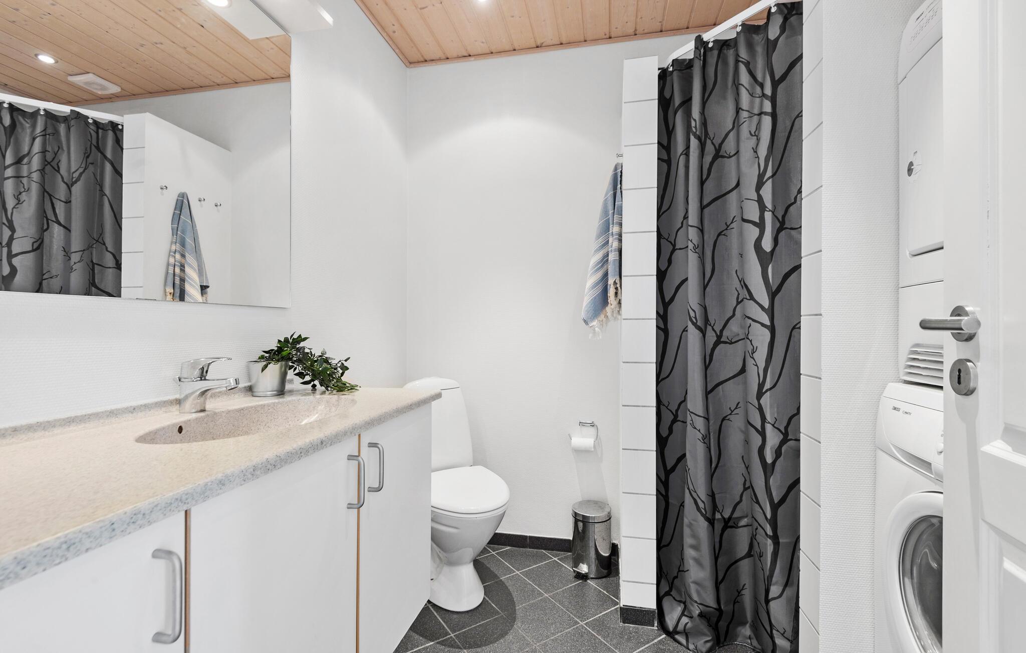 Dette moderne feriehus er del af et populært feriecenter, hvor I kan se frem til nogle herlige dage med god tid til livsnyderi. Huset har en stilren, mørk facade og store vinduesfronter, der lukker masser af lys ind i opholdsrummene. Der er en hyggelig stue på øverste etage med træpaneler og lof til kip, hvor I kan sætte jer og nyde lyset og en rolig aftenstund. Måske har I brug for at slappe af med en god film oven på dagens program?