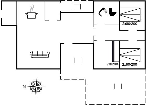 Der er i alt 3 soveværelser. Sovepladserne fordeler sig på: 4 sovepladser i dobbeltsenge. 2 sovepladser i køjeseng.
