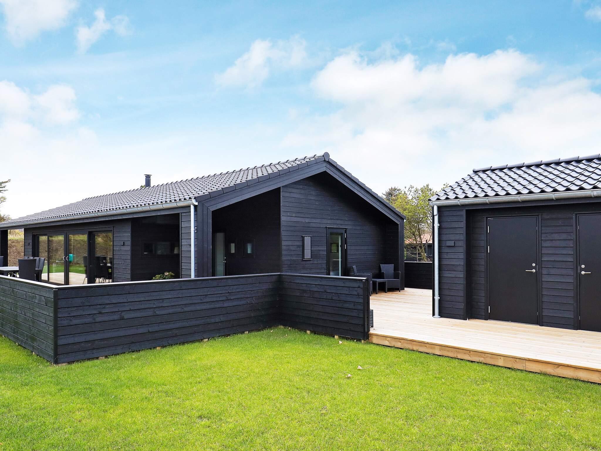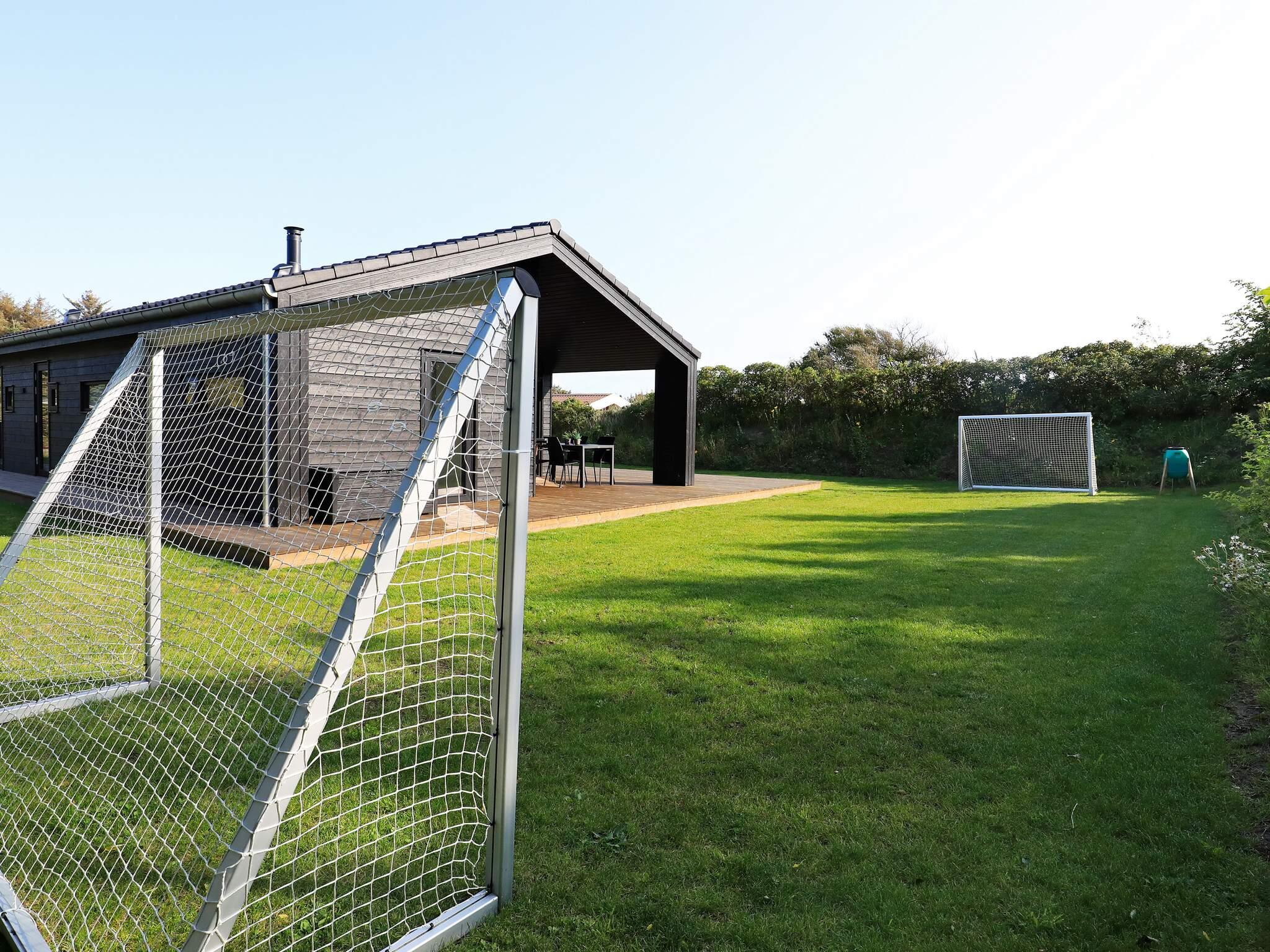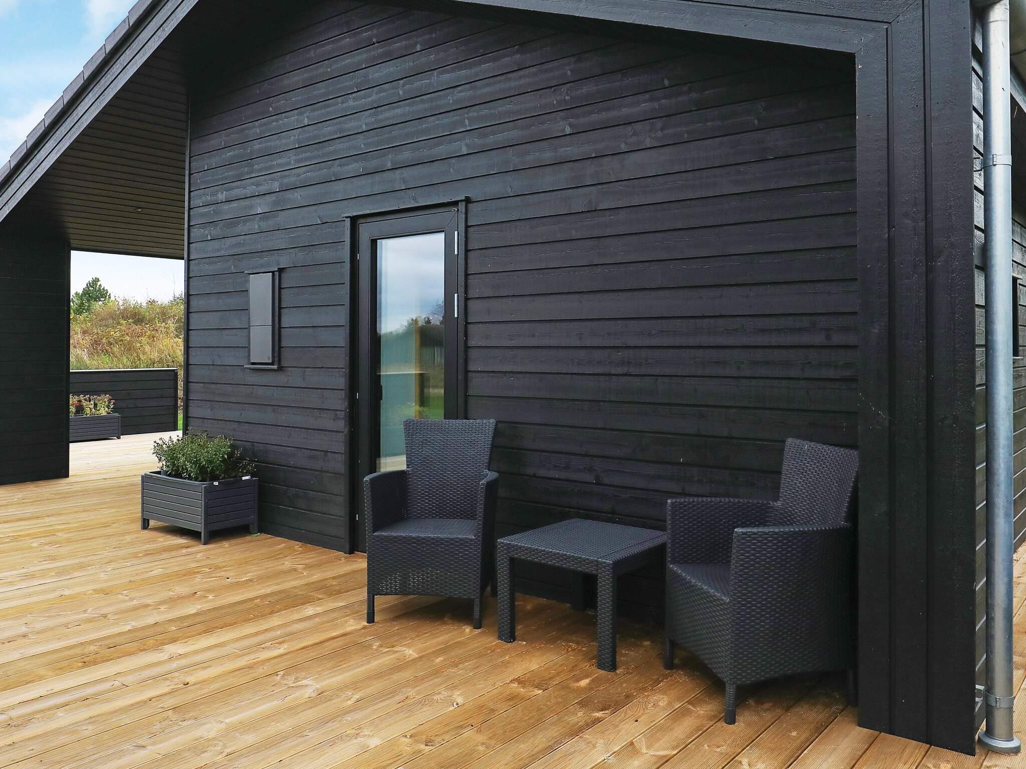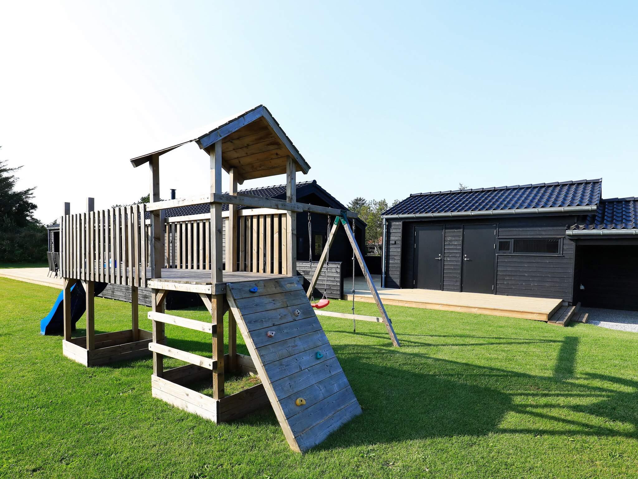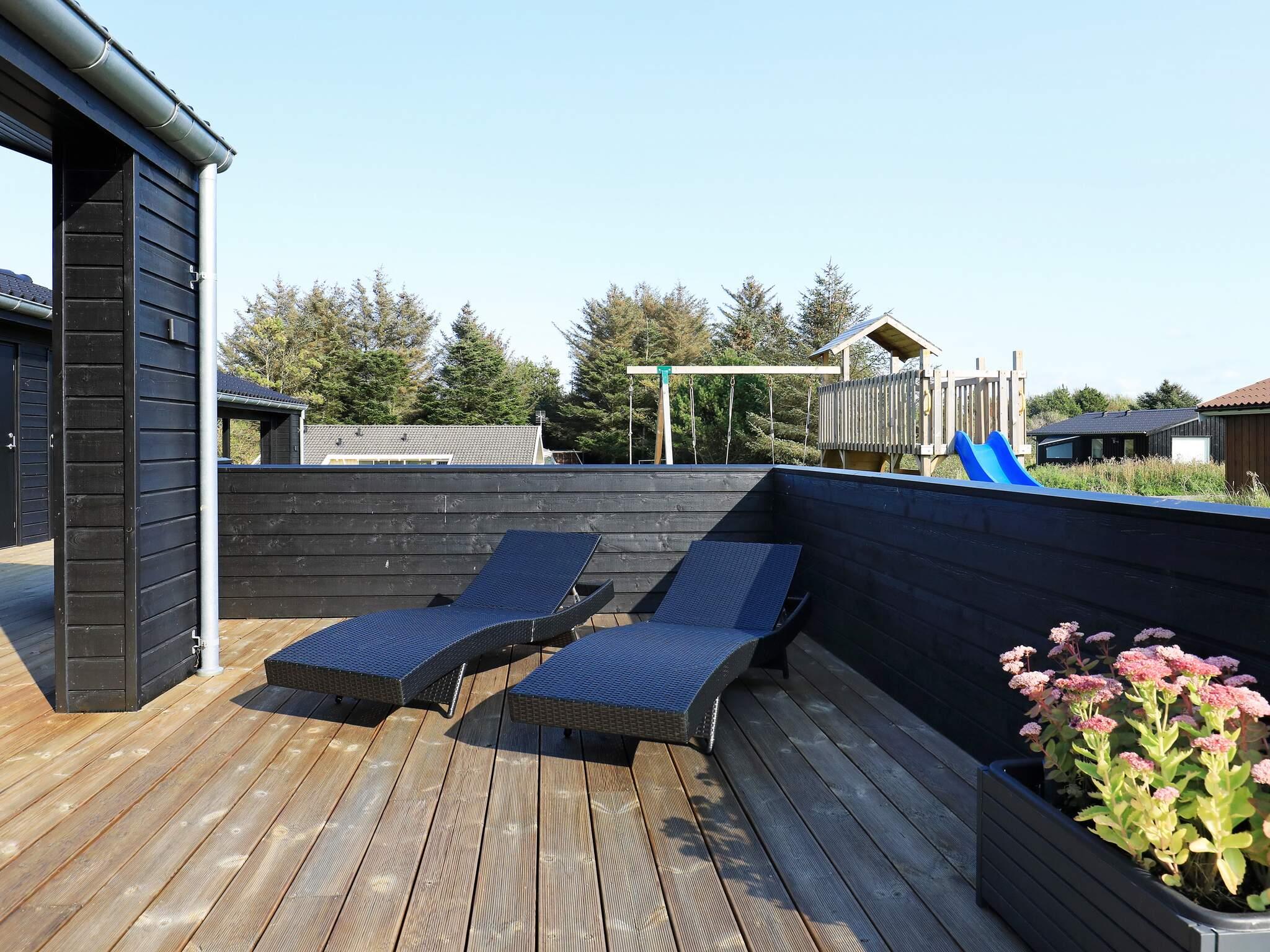 Fra stuen er der direkte adgang til det store terrasseareal. To terrasser er overdækket og så er der en stor, åben terrasse rundt om det meste af huset. Her er altid mulighed for at finde sol eller skygge samt rig mulighed for grill, afslapning og hygge. Der findes mange havemøbler. Grunden er en plan sommerhus grund med græsplæne, og til børnene er der opsat klatre stativ med gynge, rutchebane og fodboldmål. Der er mulighed for opbevaring af cykler i et aflåst rum/skur. Der er et legetårn. Aflåst cykelrum. Der er oplader til el-biler. Udlejes ikke til ungdomsgrupper.