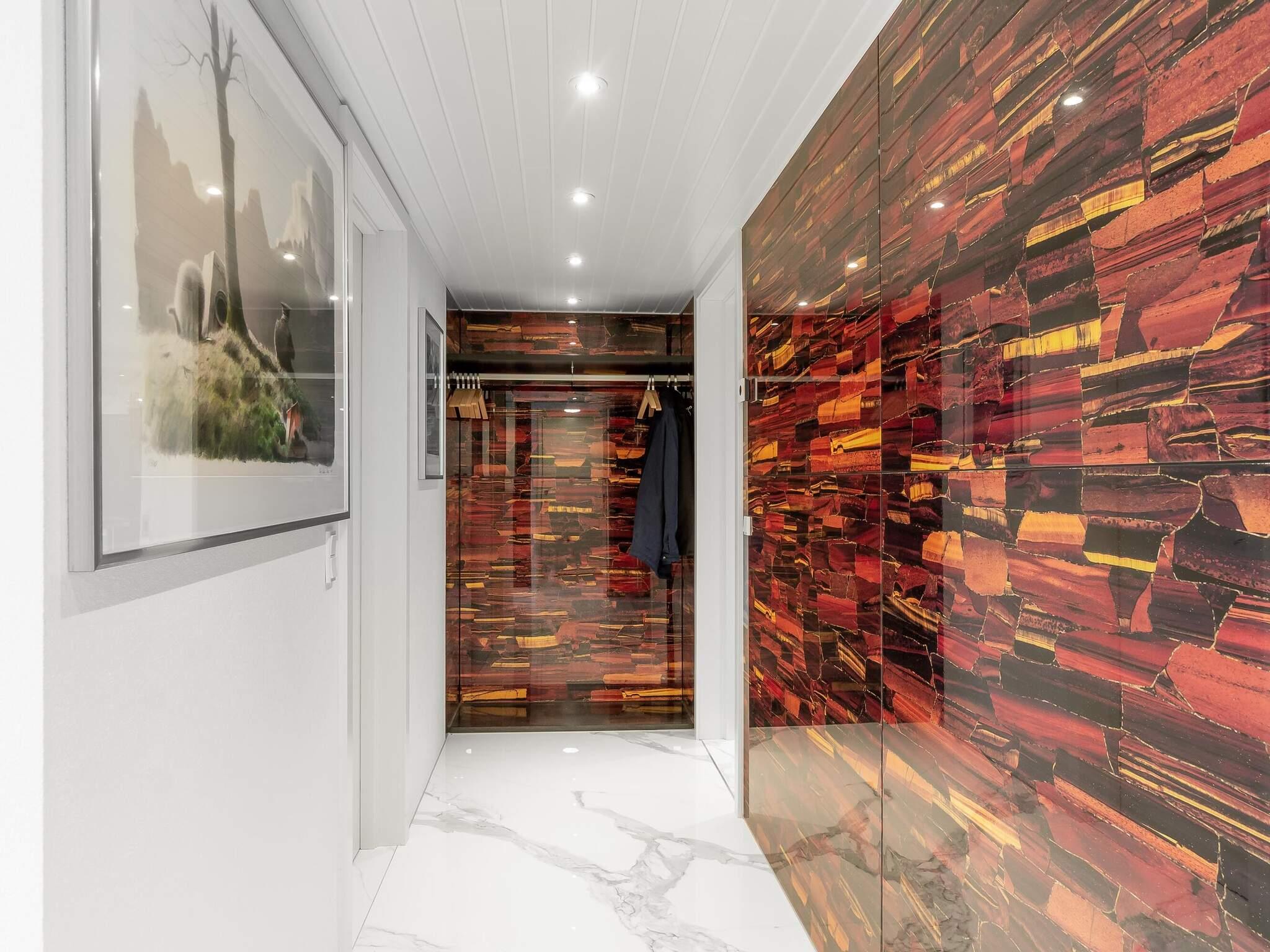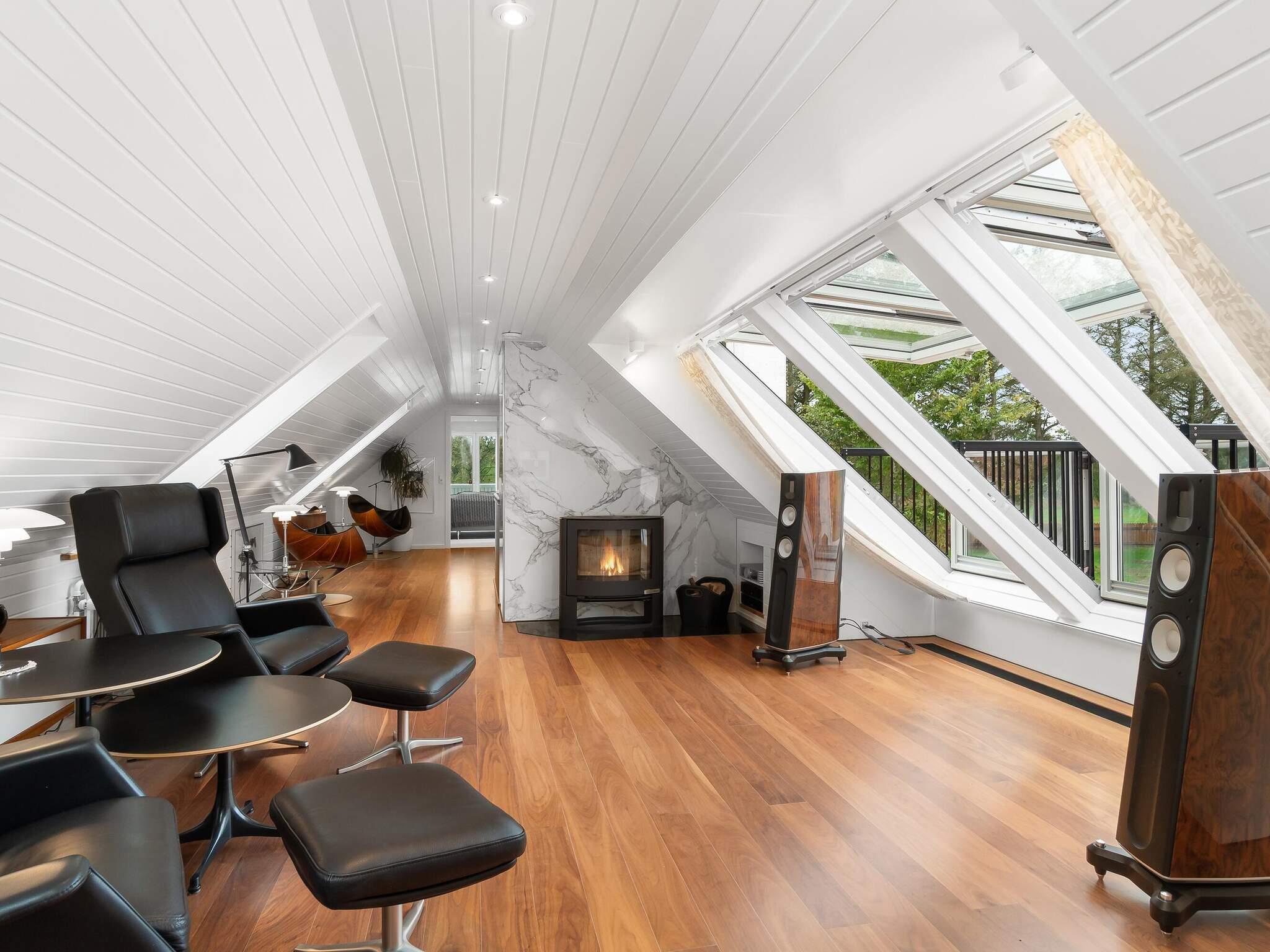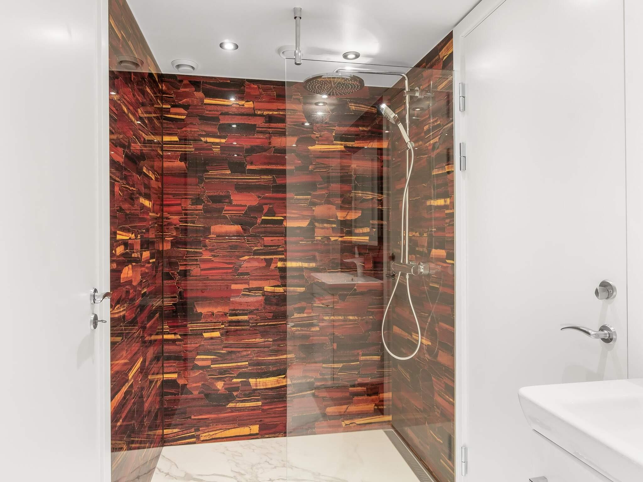Badeværelset har en stor bruseniche med bænk, lineært afløb og en luksuriøs loftmonteret regnbruser med vandfaldsfunktion. På 1. salen er der endnu et badeværelse, og de to sektioner er forbundet af endnu en stue, denne gang med valnøddegulv, brændeovn og et smukt vinduesparti med udsigt til naturen.