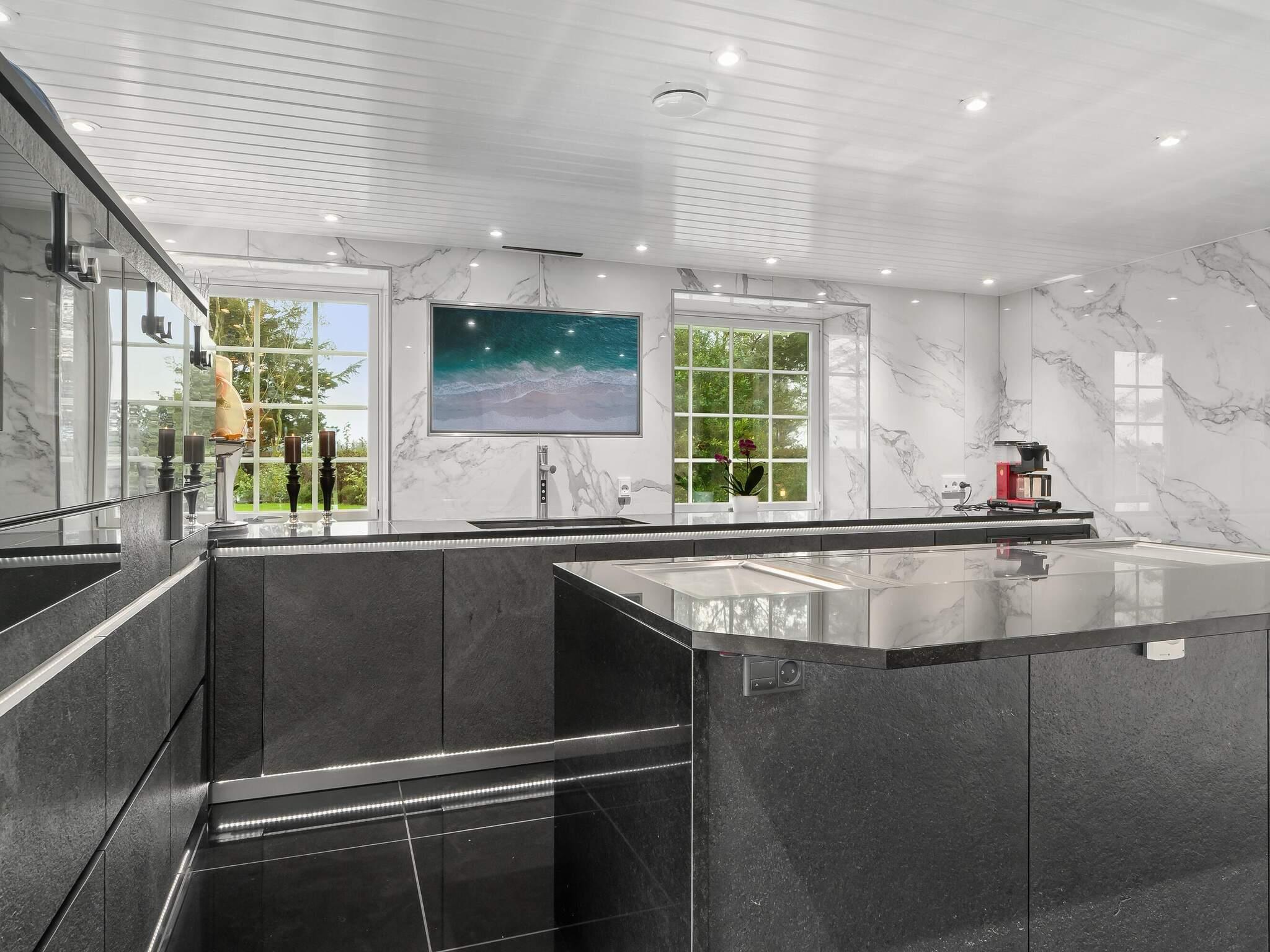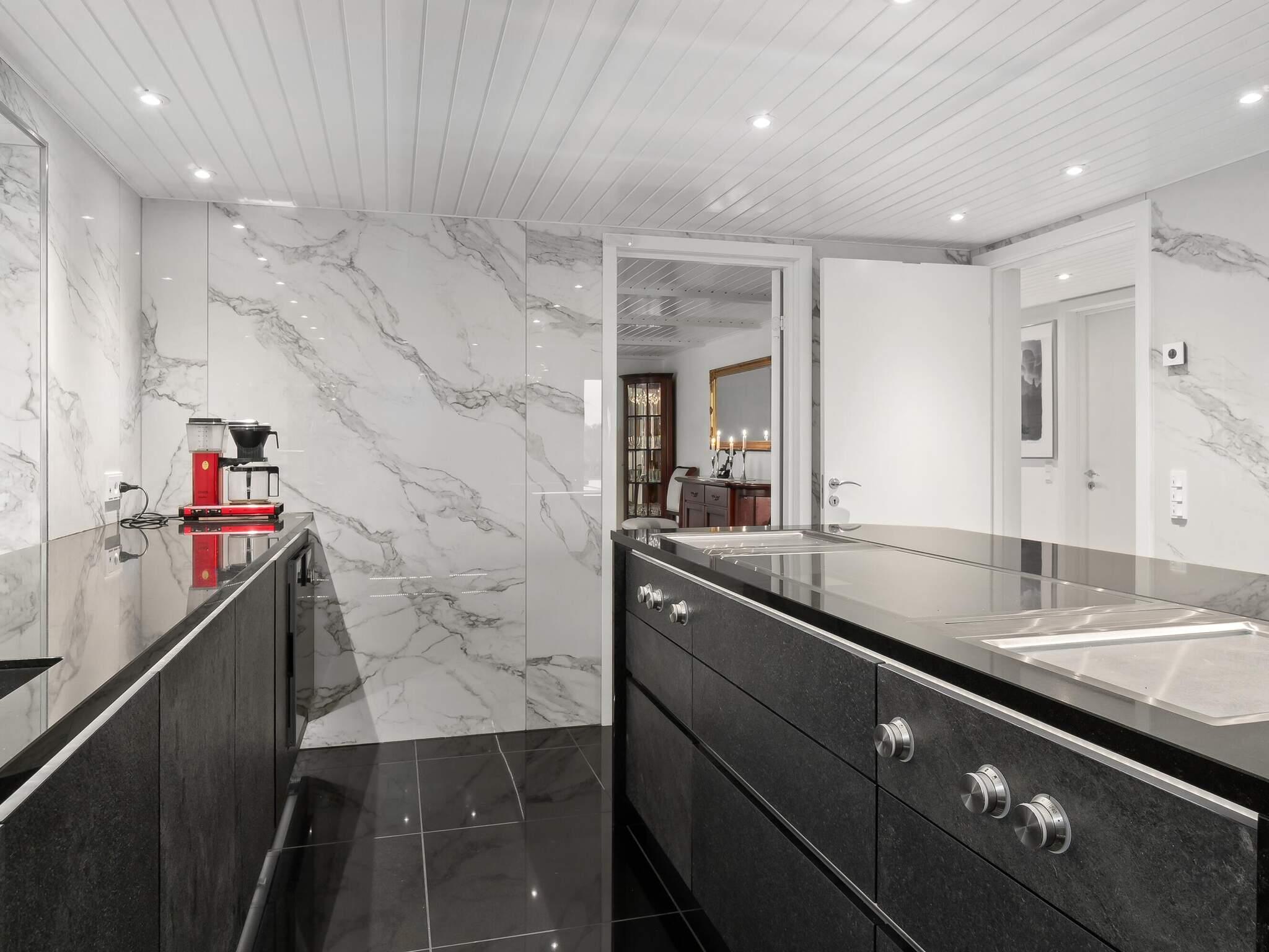 Køkkenet skiller sig også ud fra almindelige køkkener. Granitfronter og bordplader, to indbyggede dampovne og en almindelig ovn fra Gaggenau, en matchende mikroovn, en bred, zonefri kogeplade og en bordplade emhætte, foruden to teppanyaki grill til japansk madlavning, som også egner sig godt til varme retter. Der er desuden kaffemaskine, to varmeskuffer, køleskab og to frysere (ca. 300 liter). Derudover er der et vinskab af høj kvalitet og et køle/fryseskab fra Liebherr. Den er indrettet, så barstole kan placeres ved kogeøen.