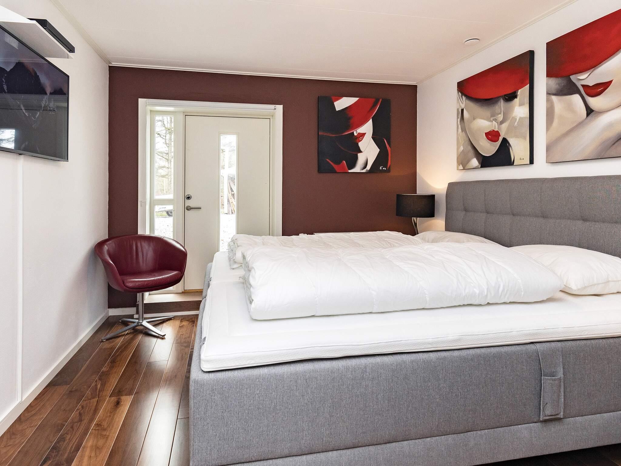 En del af første sal er soveværelset. Der er to gode soveværelser, det ene med væghængt tv og eget badeværelse. Derudover har begge altaner. Begge har gode dobbeltsenge fra Høje.