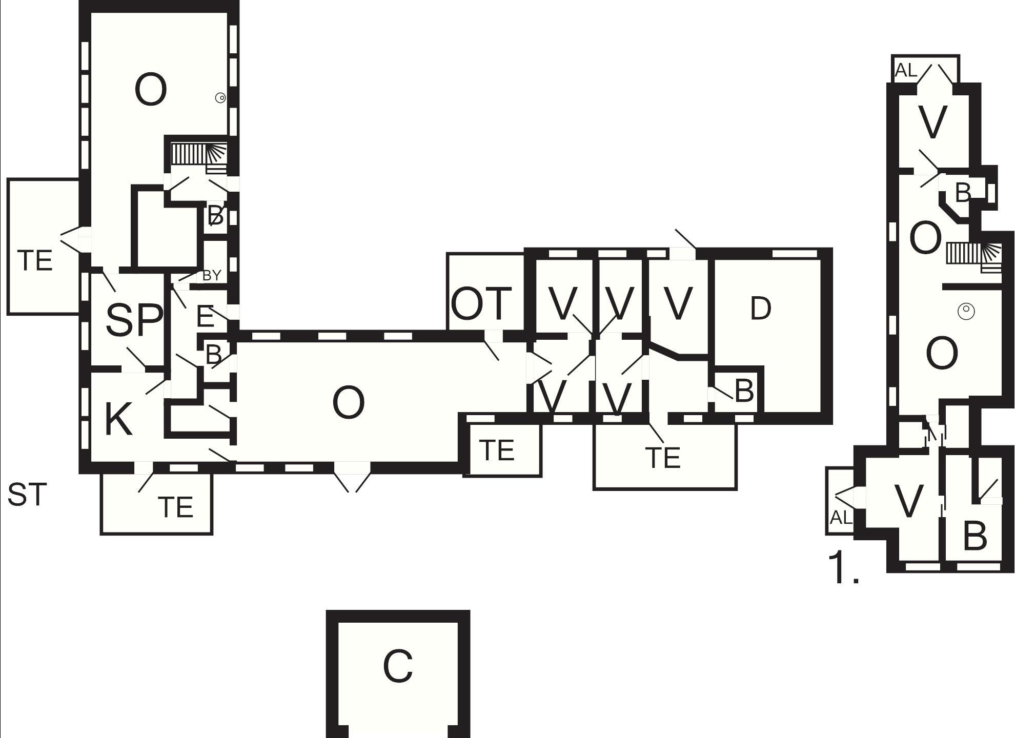 I hovedhusets tilstødende fløj er der en dejlig rummelig gildesal (ca. 100 m2) med terrassedøre og egen indgang. Der er også service mm til 40 personer. På modsatte side af entréen er der fire soveværelser med komfortable dobbeltsenge fra Høje, hvoraf det ene har væghængt tv. Derudover er der et lille loungeområde med tekøkken og fire stole og et bord. Alle værelser er luksuriøst indrettet med valnøddegulve, som giver et smukt udtryk, og er forbundet med et brusebad.