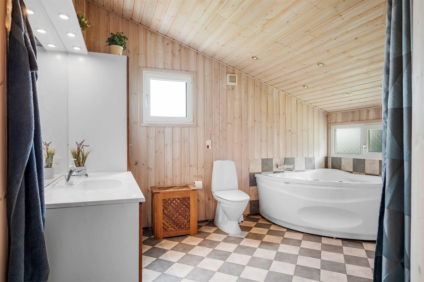 Huset er opført i 1998 i kvalitetsmaterialer og der er lagt vægt på et lyst og allergivenligt indeklima. Vægge og lofter er beklædt med lyst, ludbehandlet træ. Klinkegulve med gulvvarme, dog lyse, ludbehandlede trægulve i soveværelserne. Huset indeholder 2 store hemse samt 3 soveværelser - alle med dobbeltseng. Der forefindes 2 flotte badeværelser med bruseniche, hvoraf det største endvidere er udstyret med 2-pers. spa, 5-pers. og sauna. Bryggers med bl.a. vaskemaskine, tørretumbler og buksepresse. Det pragtfulde køkken er kombineret med opholdsstuen og udstyret med fryser, mikrobølgeovn, opvaskemaskine og muret, vandskuret kogeø med keramiske kogeplader. I den hyggelige og smagfuldt indrettede opholdsstue findes brændeovn, hjemmebiograf i form af 40" fladskærms-TV I HD med TV-pakke fra Waoo, CD-/DVD-afspiller, surroundsound-system inkl. 5 højtalere og subwoofer. Der kan afspilles film i Blu-ray format og egne film eller musik kan medbringes på Iphone og afspilles over anlægget.