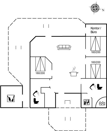 Fra opholdsstuen har man desuden en flot udsigt samt adgang til den største af træterrasserne, der er udstyret med stor Weber grill. Hjemmekontor med diverse kontorartikler, kombineret telefax, kopimaskine, printer og scanner (til enkeltblanketter), analog- samt gratis, trådløs internetforbindelse (egen computer medbringes). Børnene er der også tænkt på, da der findes høj barnestol og sandkasse. Sammen med nøglen til huset udleveres der tyverialarm med fjernbetjening.