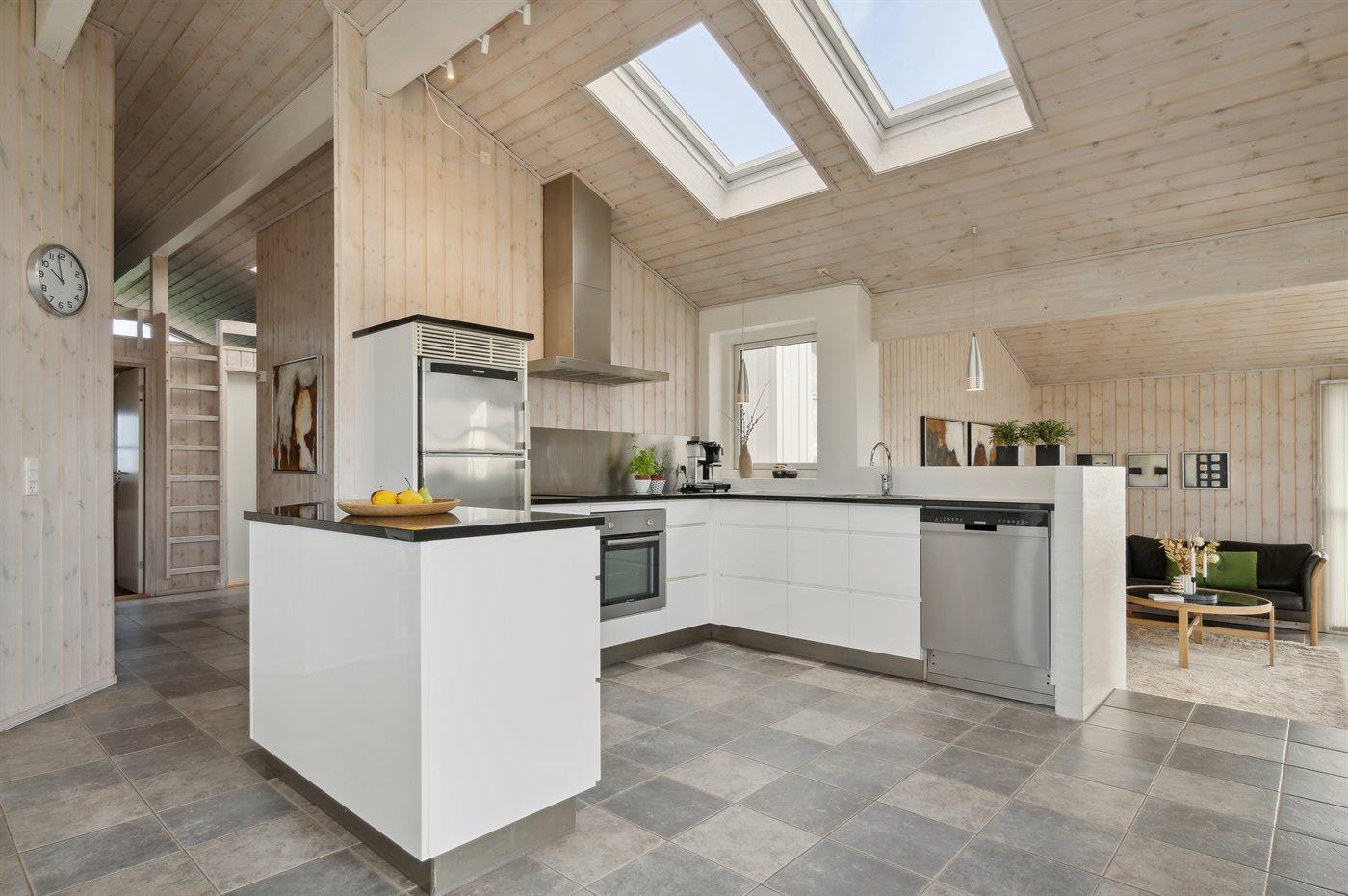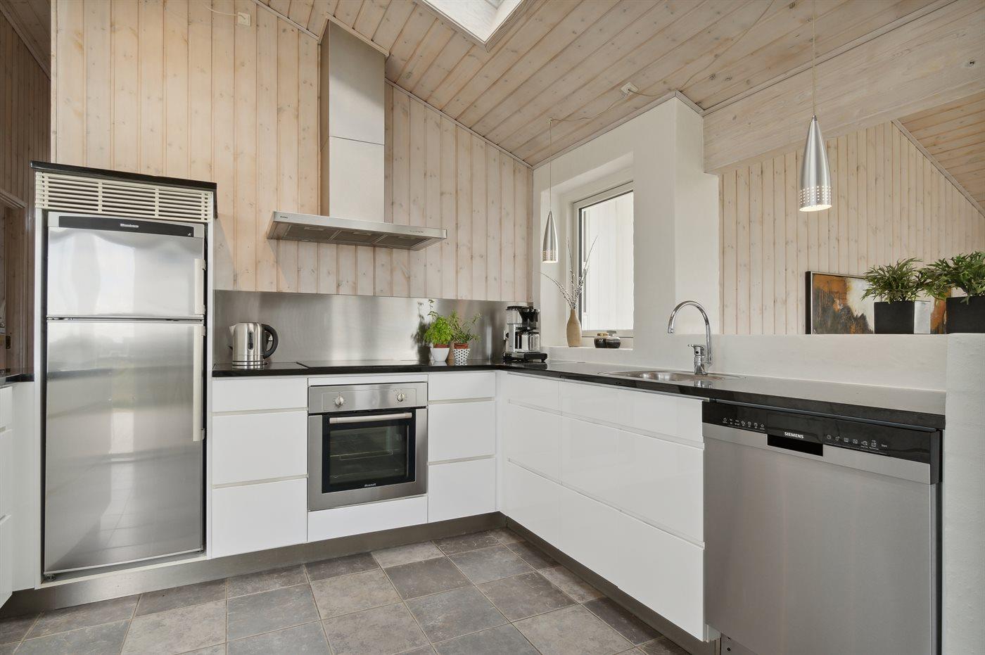 Køkkenet er udstyret med 1 køleskab. Der er 4 keramiske kogeplader, varmluftovn samt opvaskemaskine.