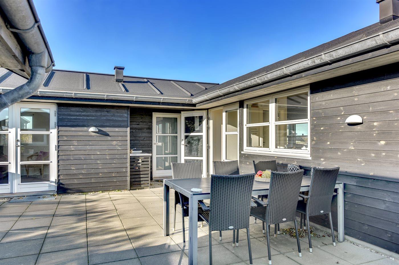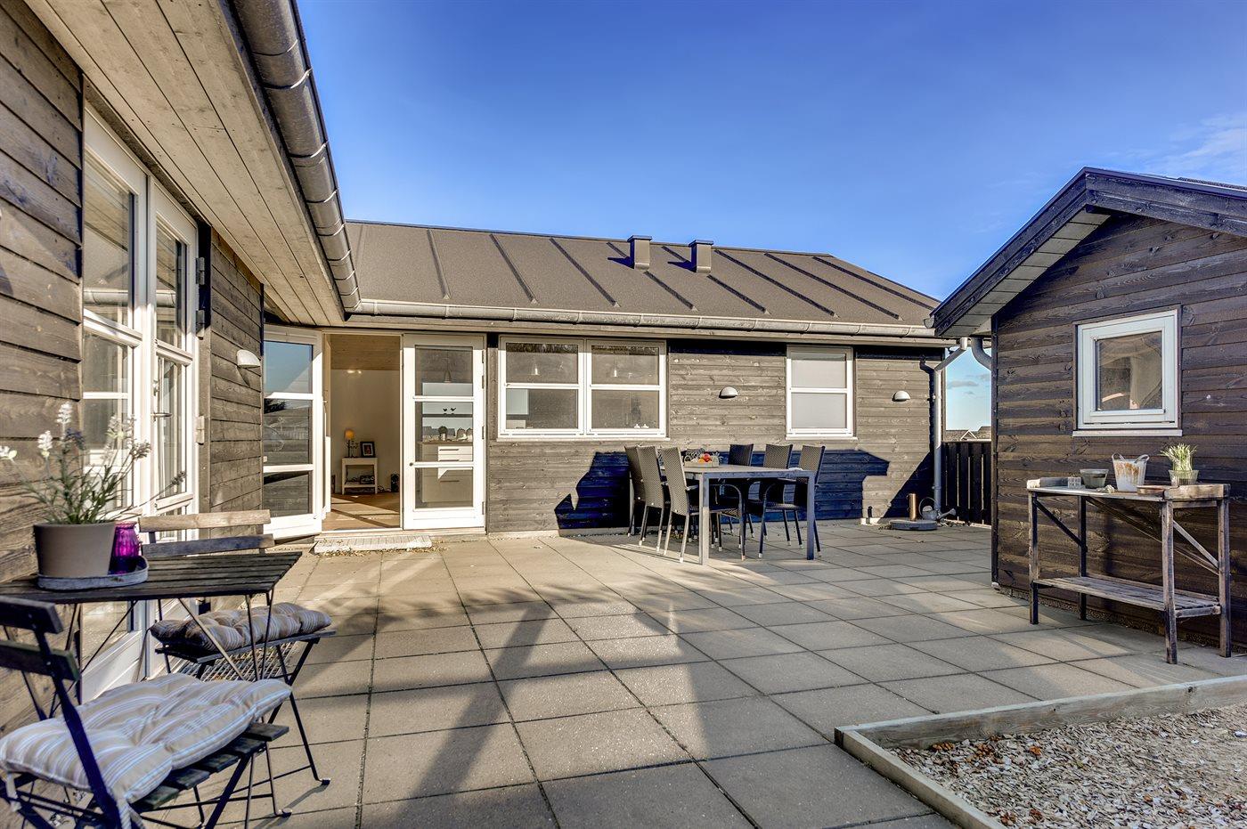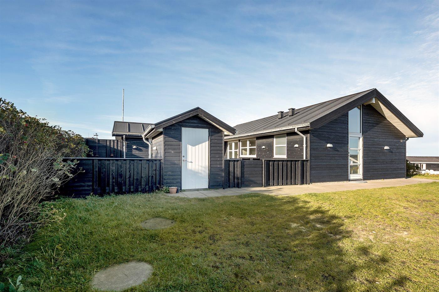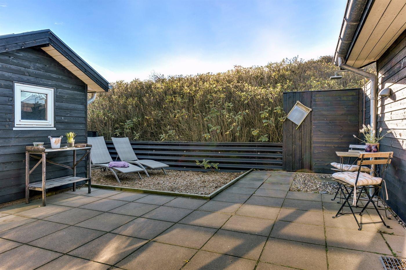 Ferieboligen er beliggende på en 1500 m² stor naturgrund. Der er 300 m til havet. Nærmeste forretning er beliggende i en afstand af 1000 m. Til ferieboligen hører 50 m² lukket terrasse. Der er redskabsrum. Sandkasse. Udendørs bruser. Der er mulighed for at tilberede maden udendørs i udekøkkenet. Der er installeret stik til opladning af elbil. Parkering ved ferieboligen.