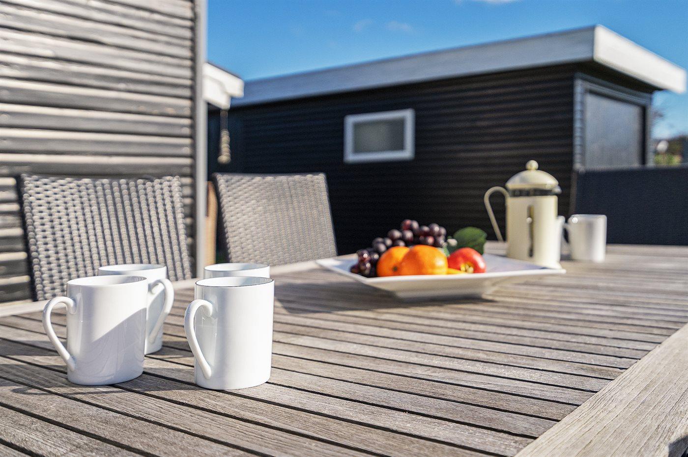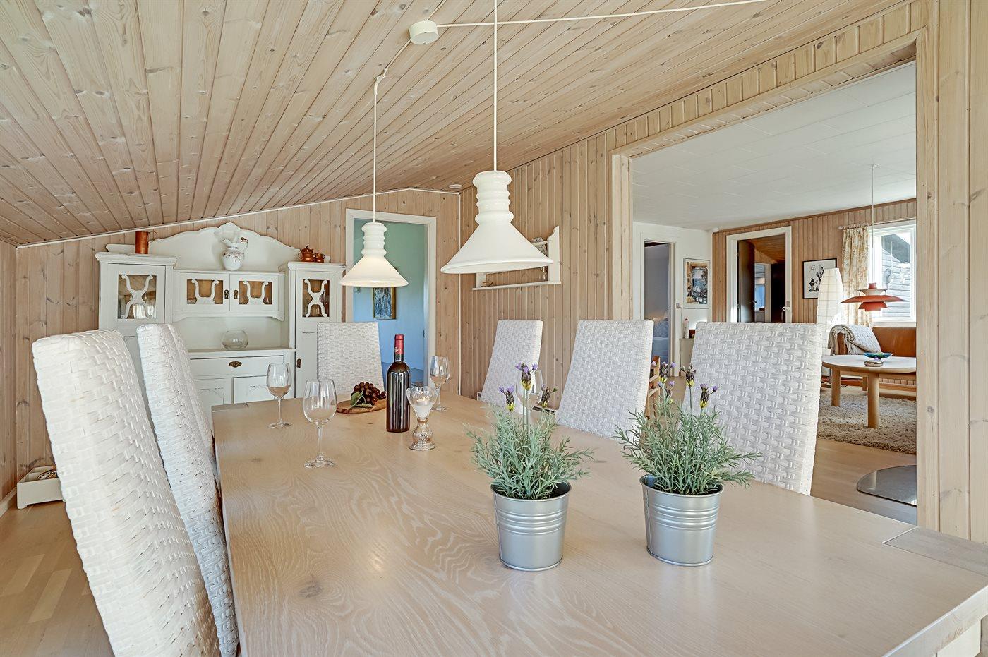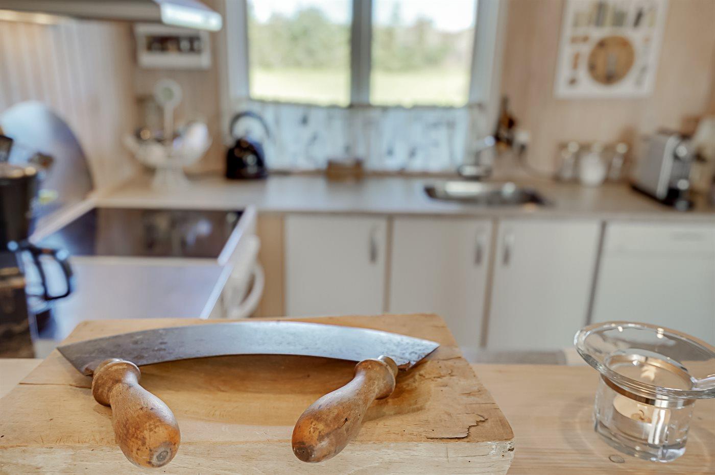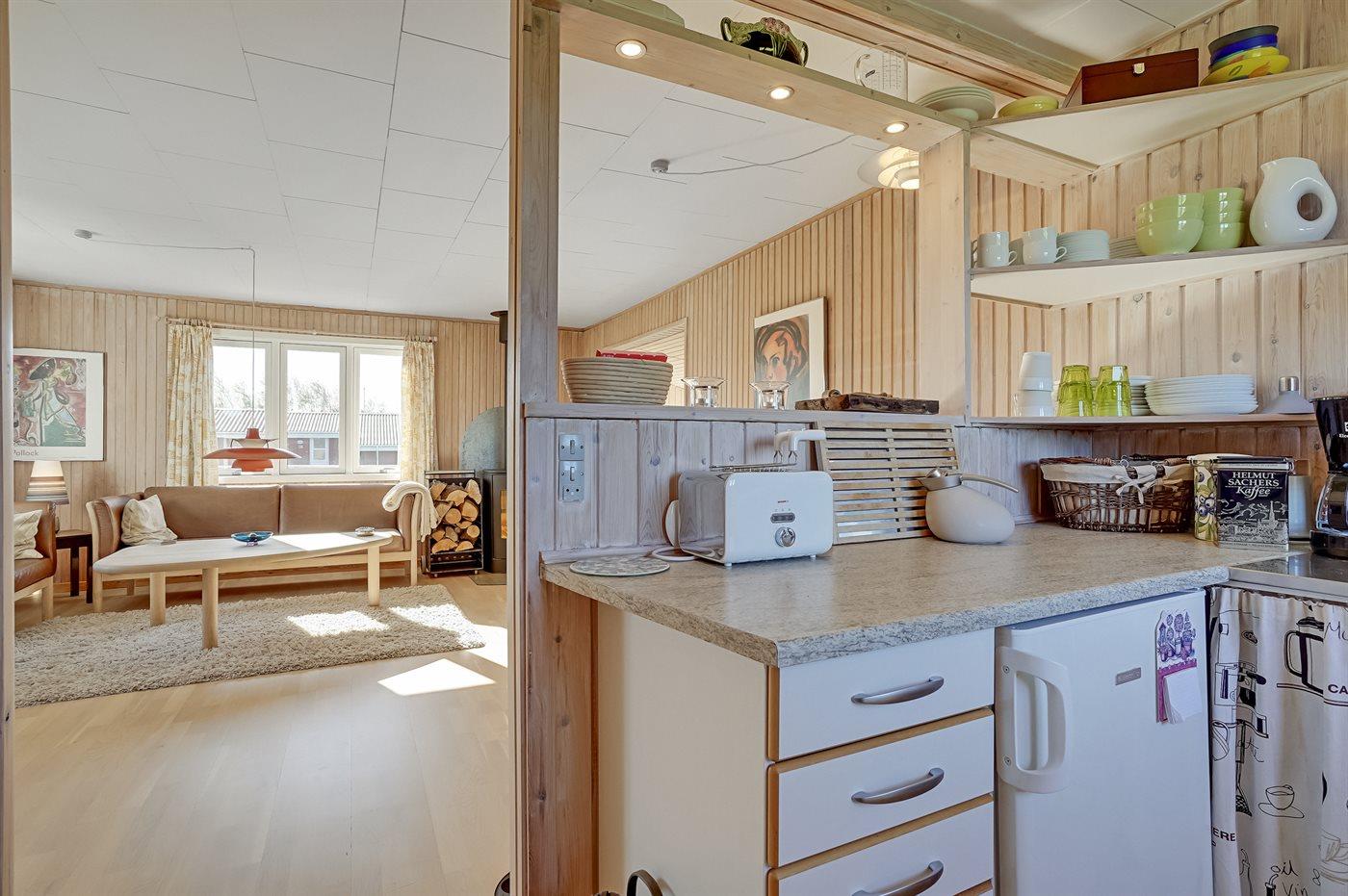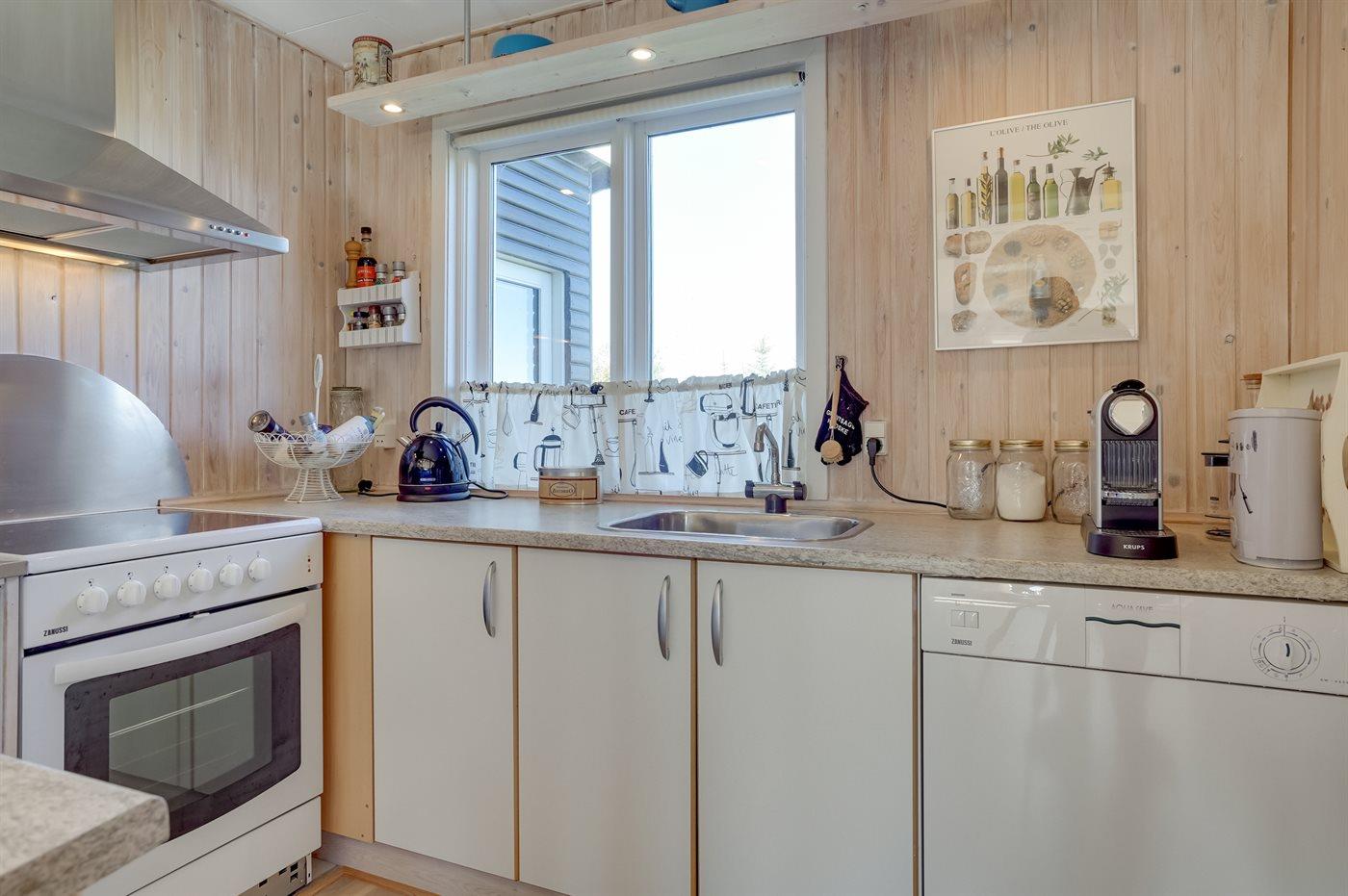 Køkkenet er udstyret med 1 køleskab. Der er 4 keramiske kogeplader, varmluftovn samt opvaskemaskine.