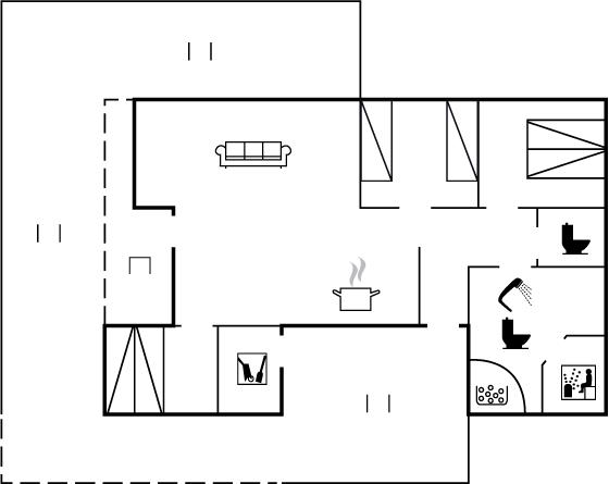 Køkkenet er udstyret med 1 køleskab. Der er 4 induktionskogeplader, varmluftovn, mikrobølgeovn samt opvaskemaskine.